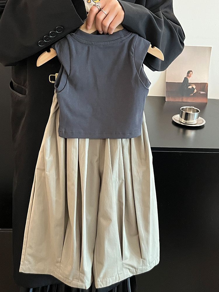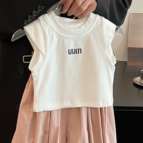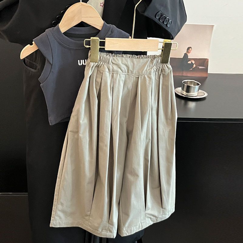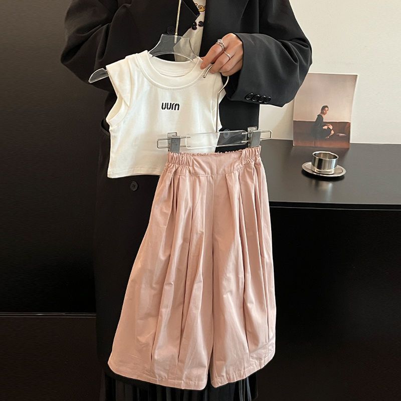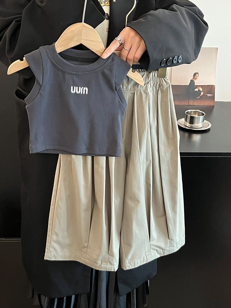 멋지고 멋진 여아복 25가지 새로운 스타일의 아동용 문자 프린트 조끼 단색 주름 와이드 팬츠 슈트스토어 가기