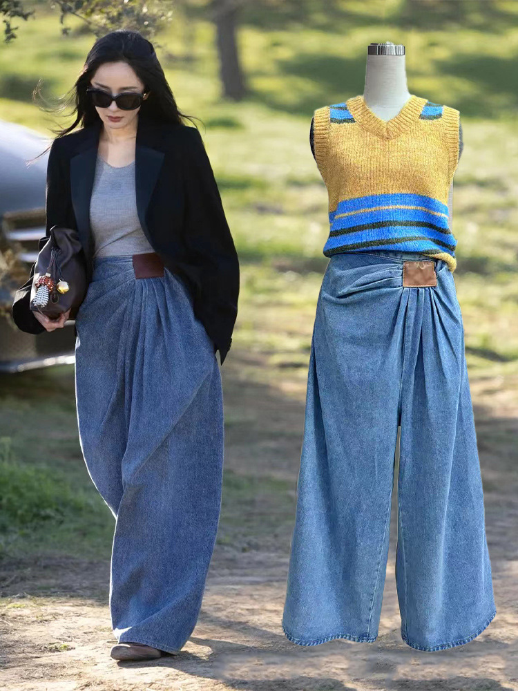 재고 양미 같은 스타일 블루 높은 허리 넓은 다리 청바지 여성 아메리칸 스타일 복고풍 디자인 느슨한 긴 바지