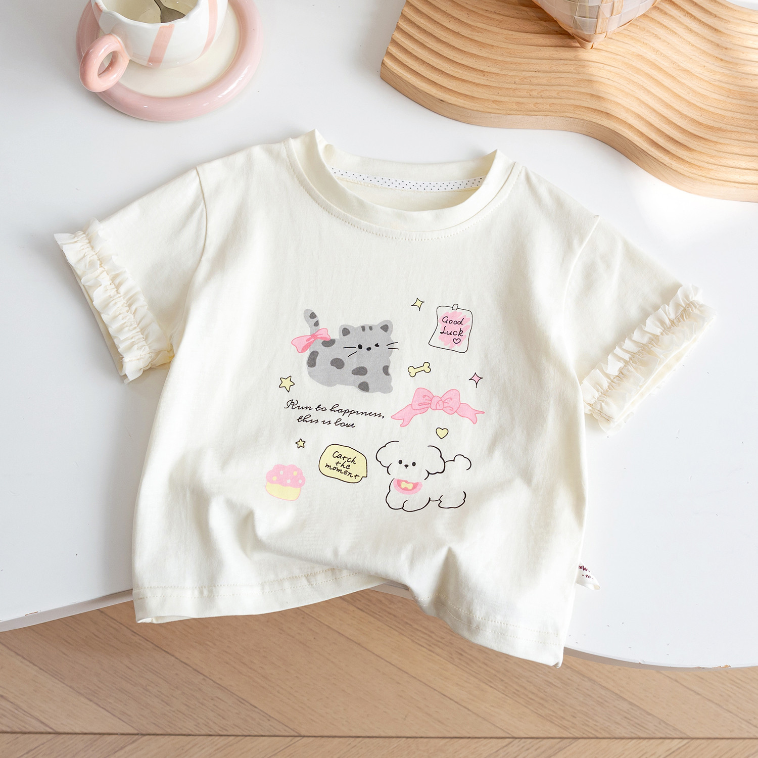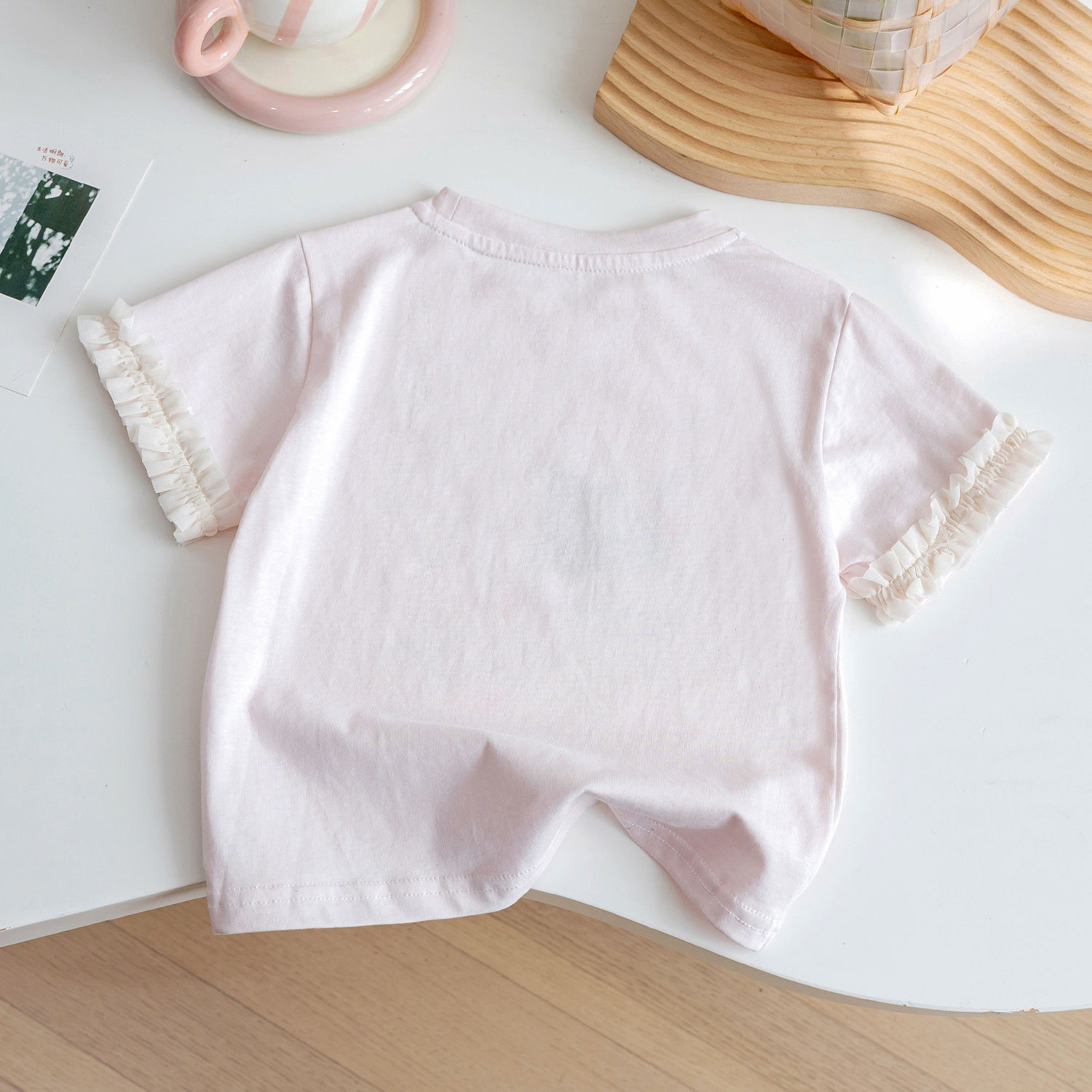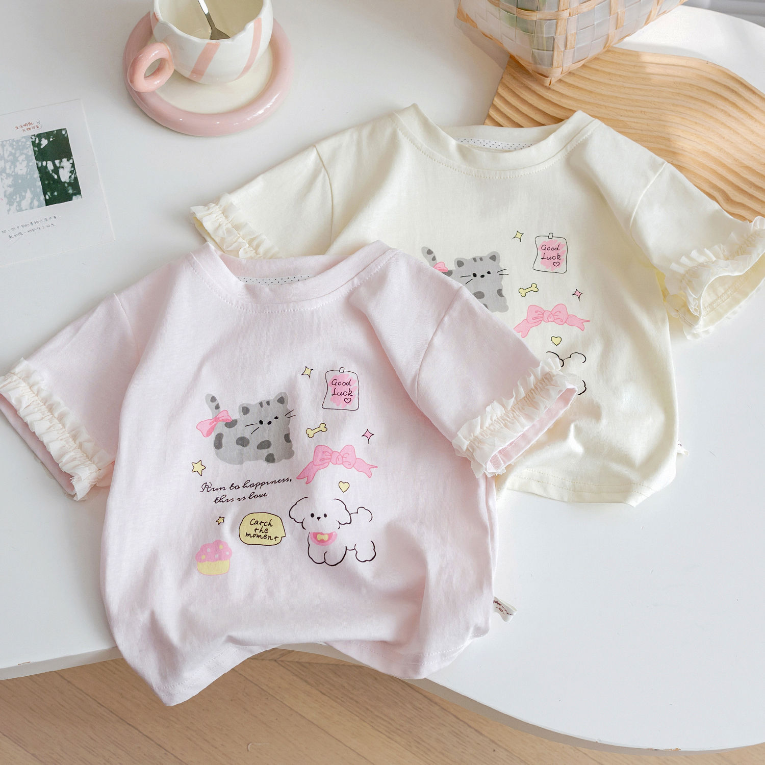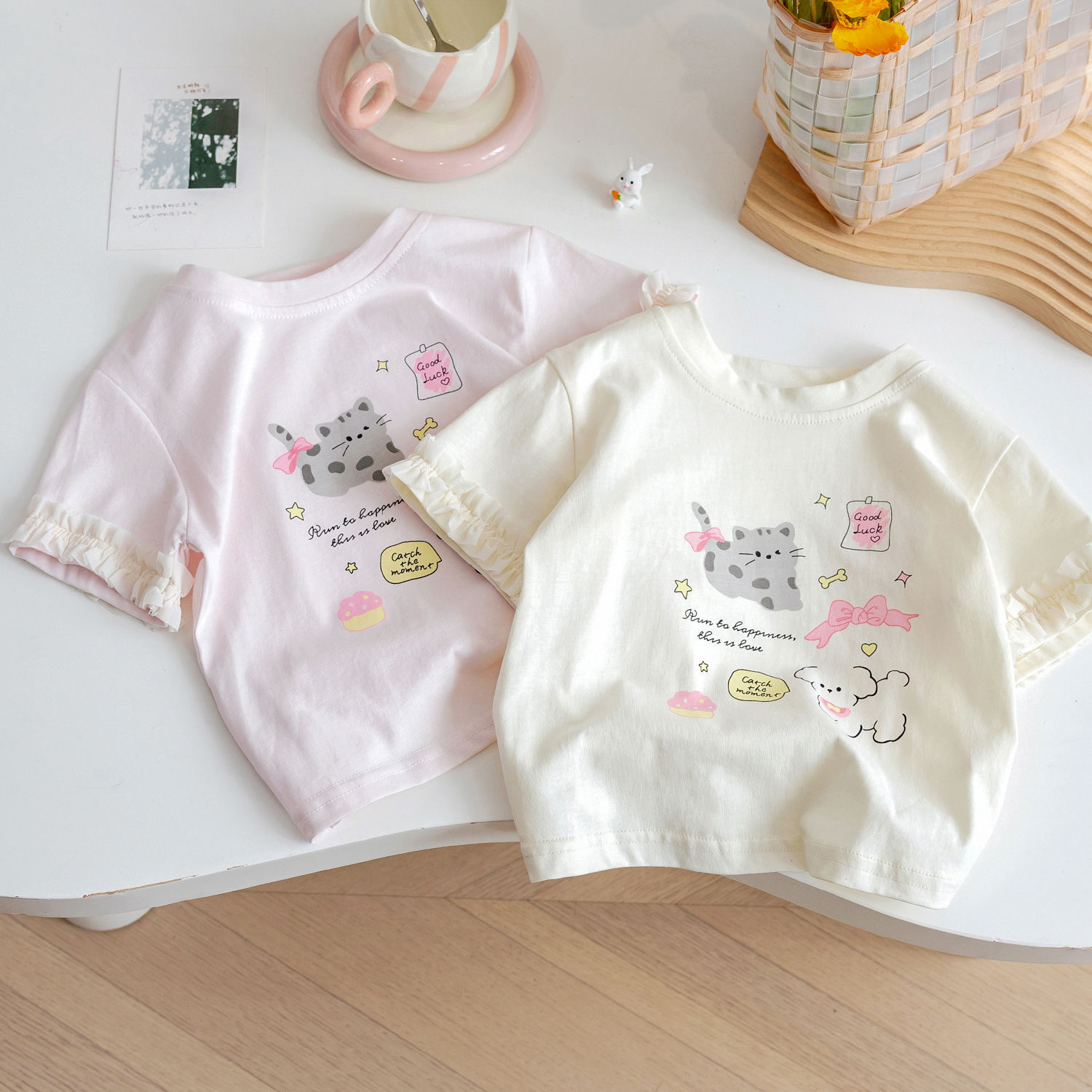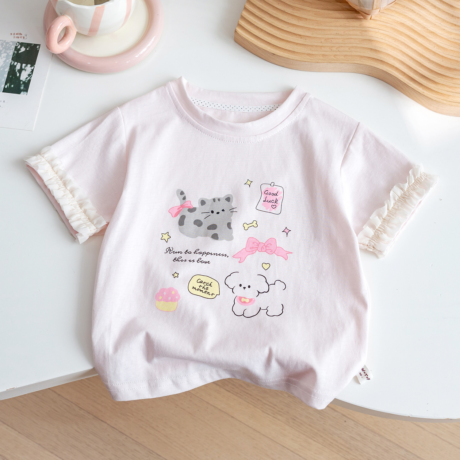 소녀 반팔 티셔츠 여름 2025 새로운 어린이 서양식 풀오버 탑 아기 옷 얇은 여름 옷 아동복