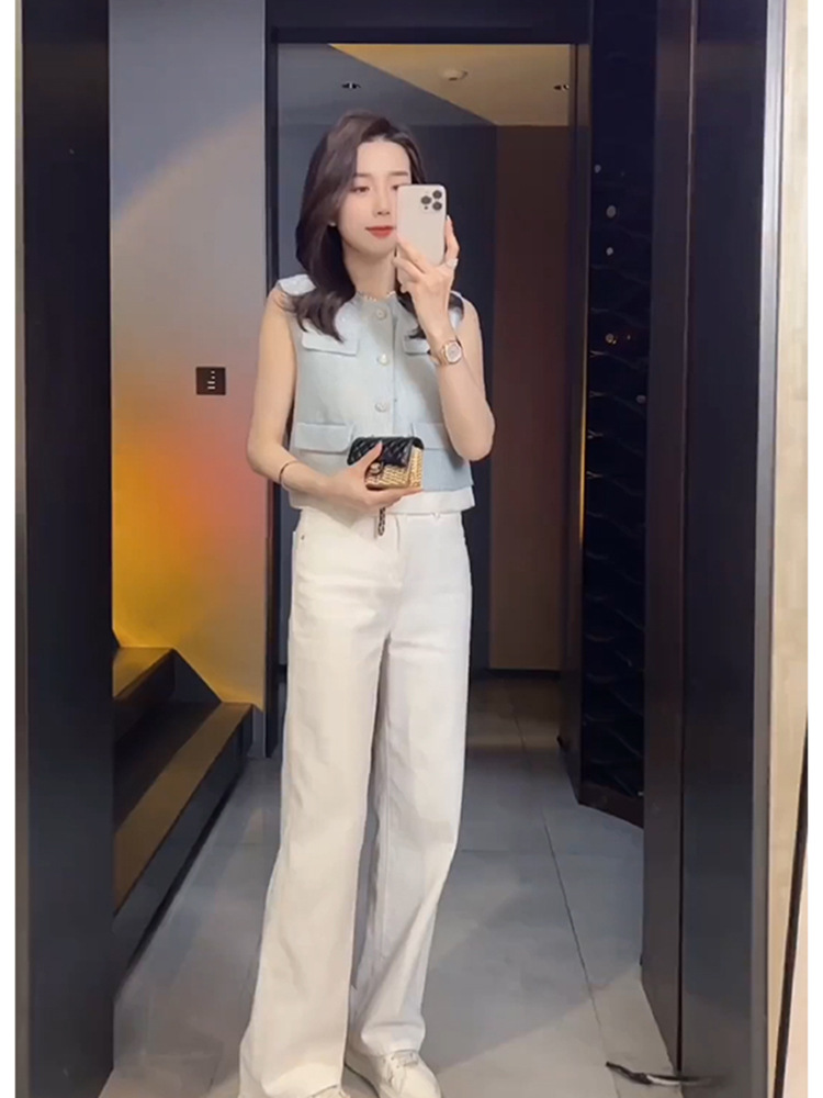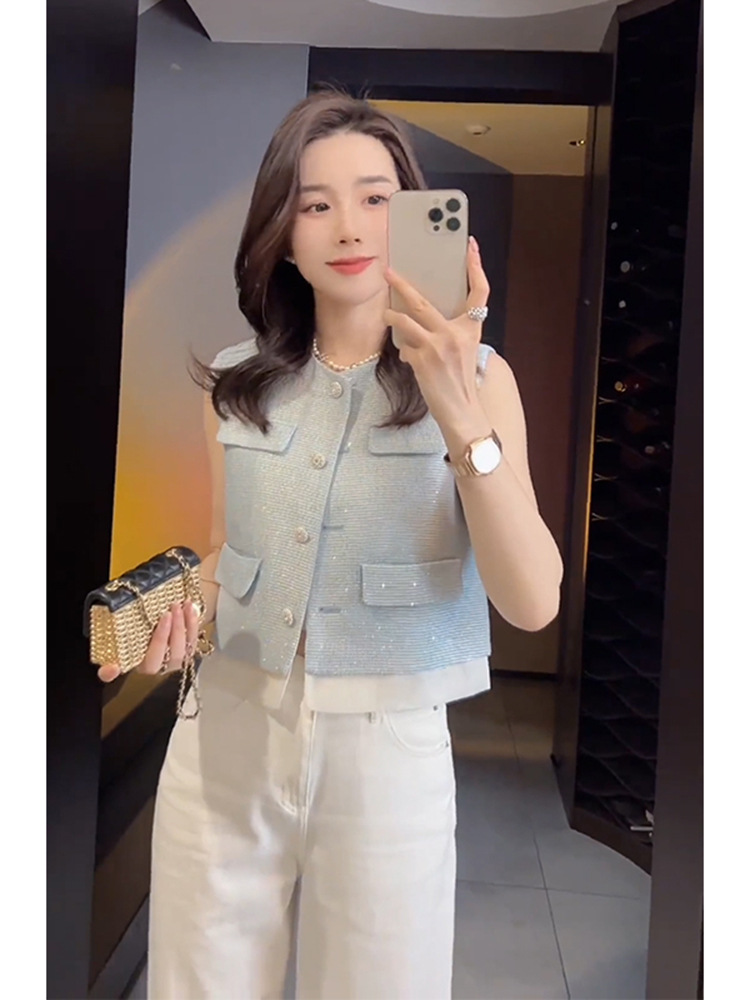 올해 인기있는 쇼트 톱 2025 여름 프랑스 고급 외국 스타일 아름다운 작은 향기로운 스타일 블루 양복 조끼