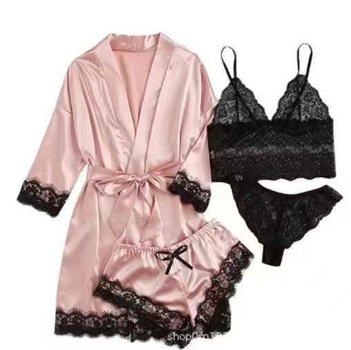 새로운 유럽과 미국의 여성 홈 의류 파자마 4 피스 레이스 새틴 멜빵 여성 여름 세트 잠옷 반바지 도매