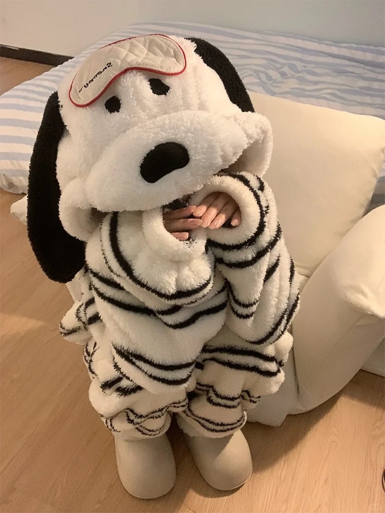 귀여운 소녀 만화 강아지 후드 산호 양털 잠옷 세트 여성의 겨울 새로운 두꺼운 플러스 사이즈 홈 옷스토어 가기