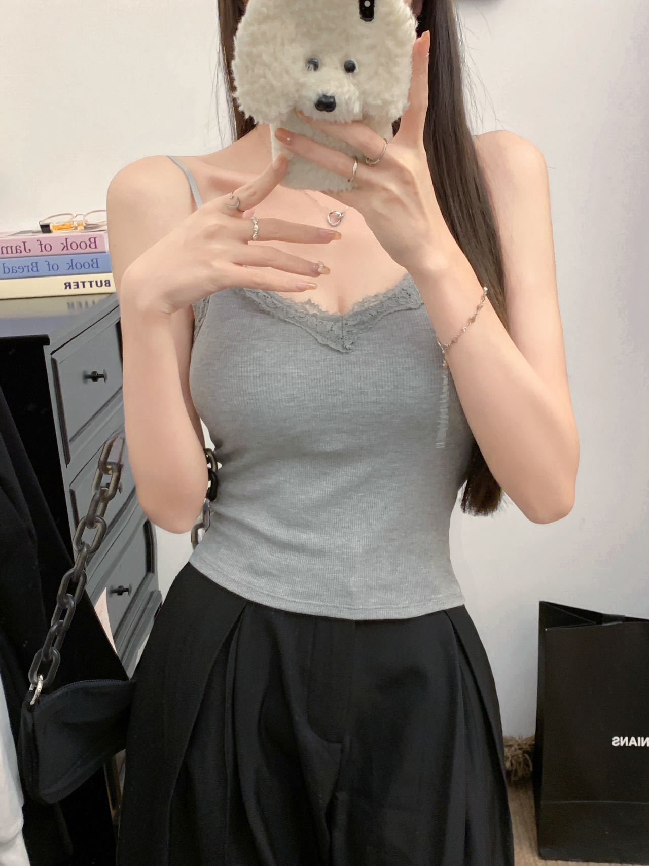 레이스 트림 서스펜더, 편안하고 통기성이 뛰어나며 슬림한 면 조끼, 일체형 고정 컵, 섹시한 브이넥 스몰 서스펜더