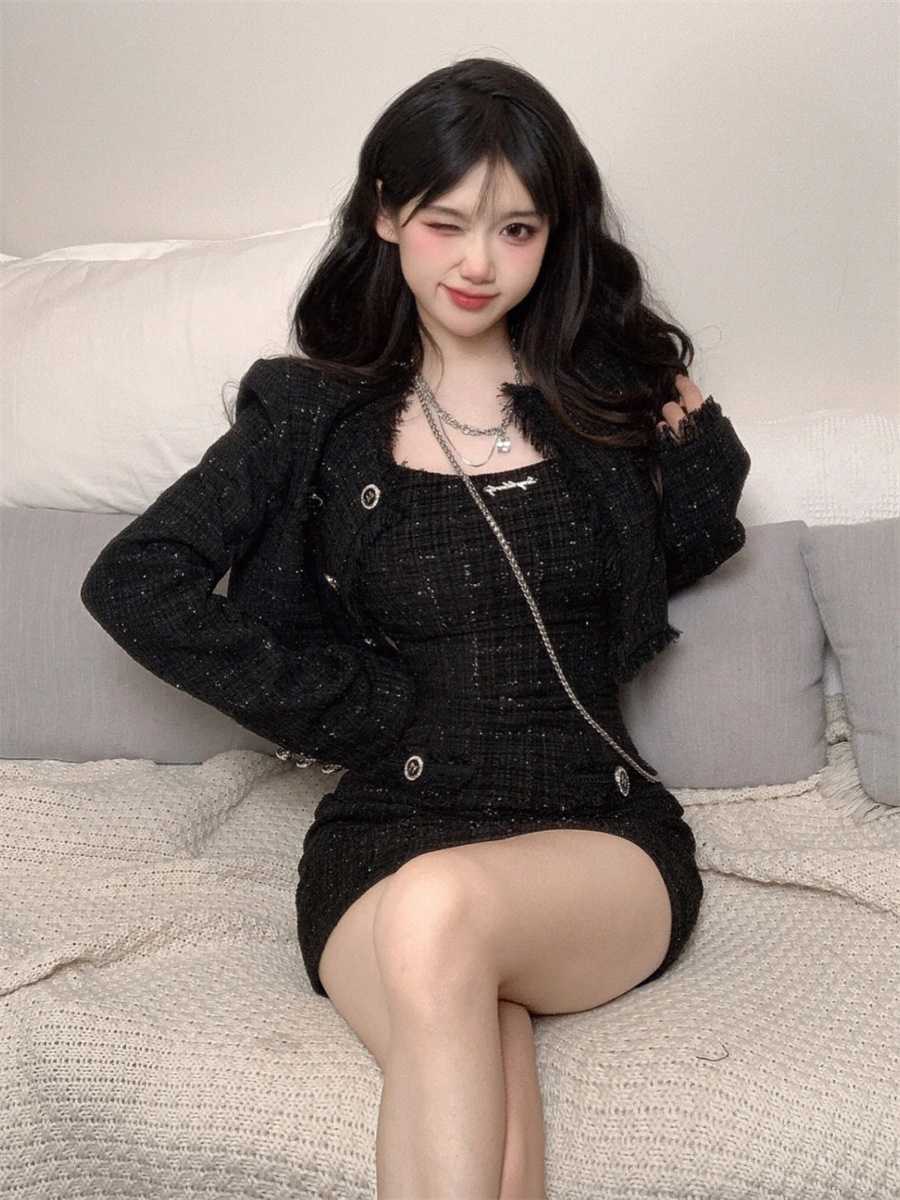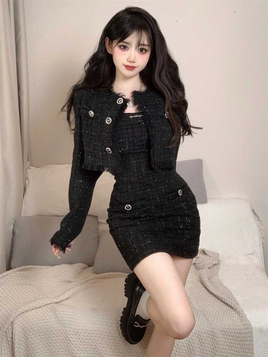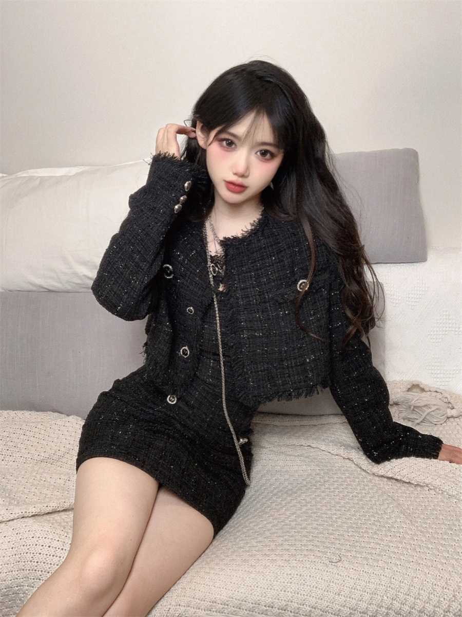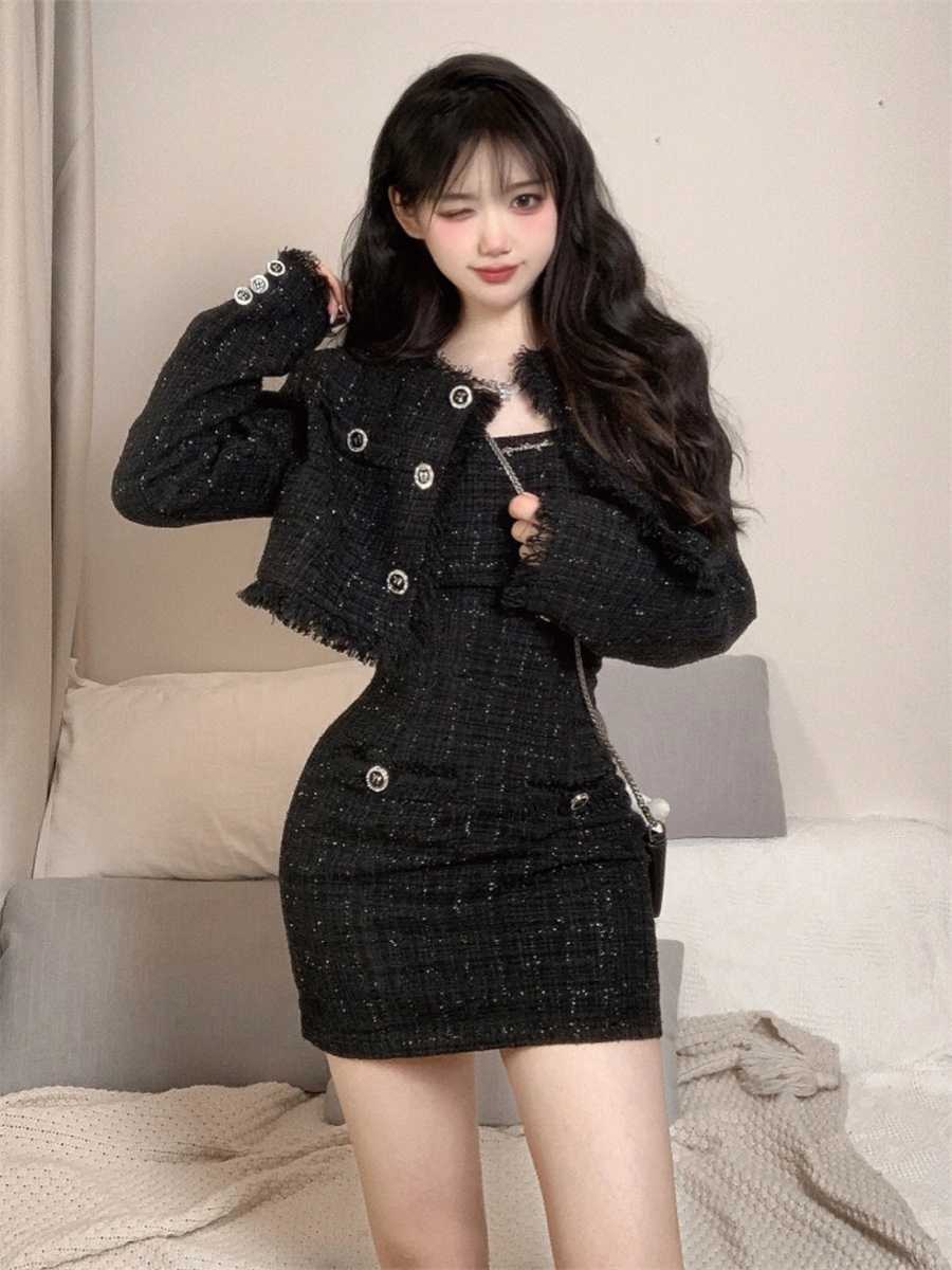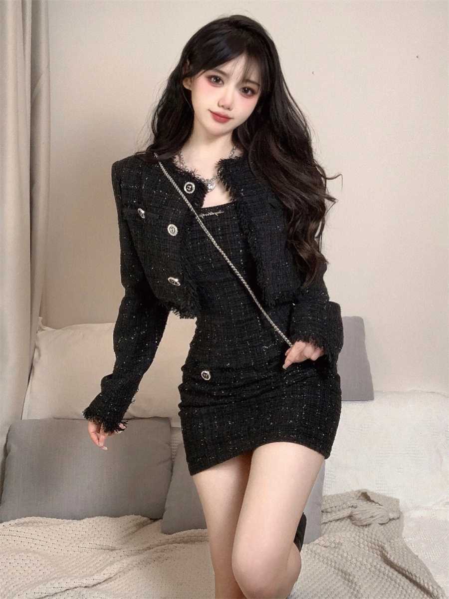여성을 위한 섹시하고 작은 향기로운 패션 슈트, 봄, 가을 디자인, 슬림핏 짧은 재킷, 서스펜더 드레스 투피스 세트스토어 가기