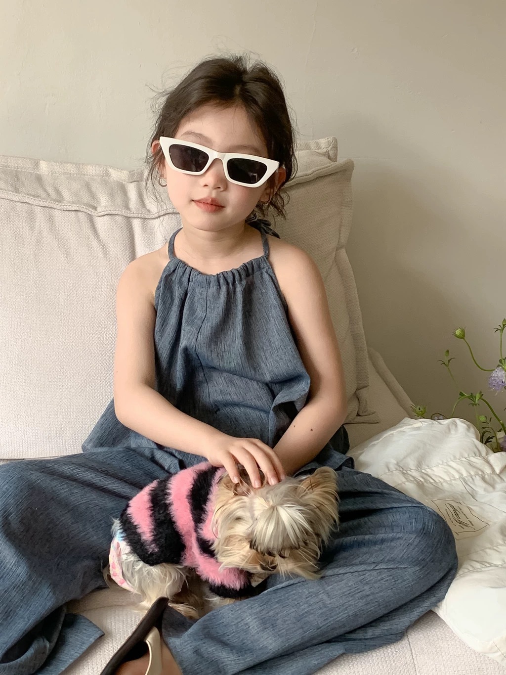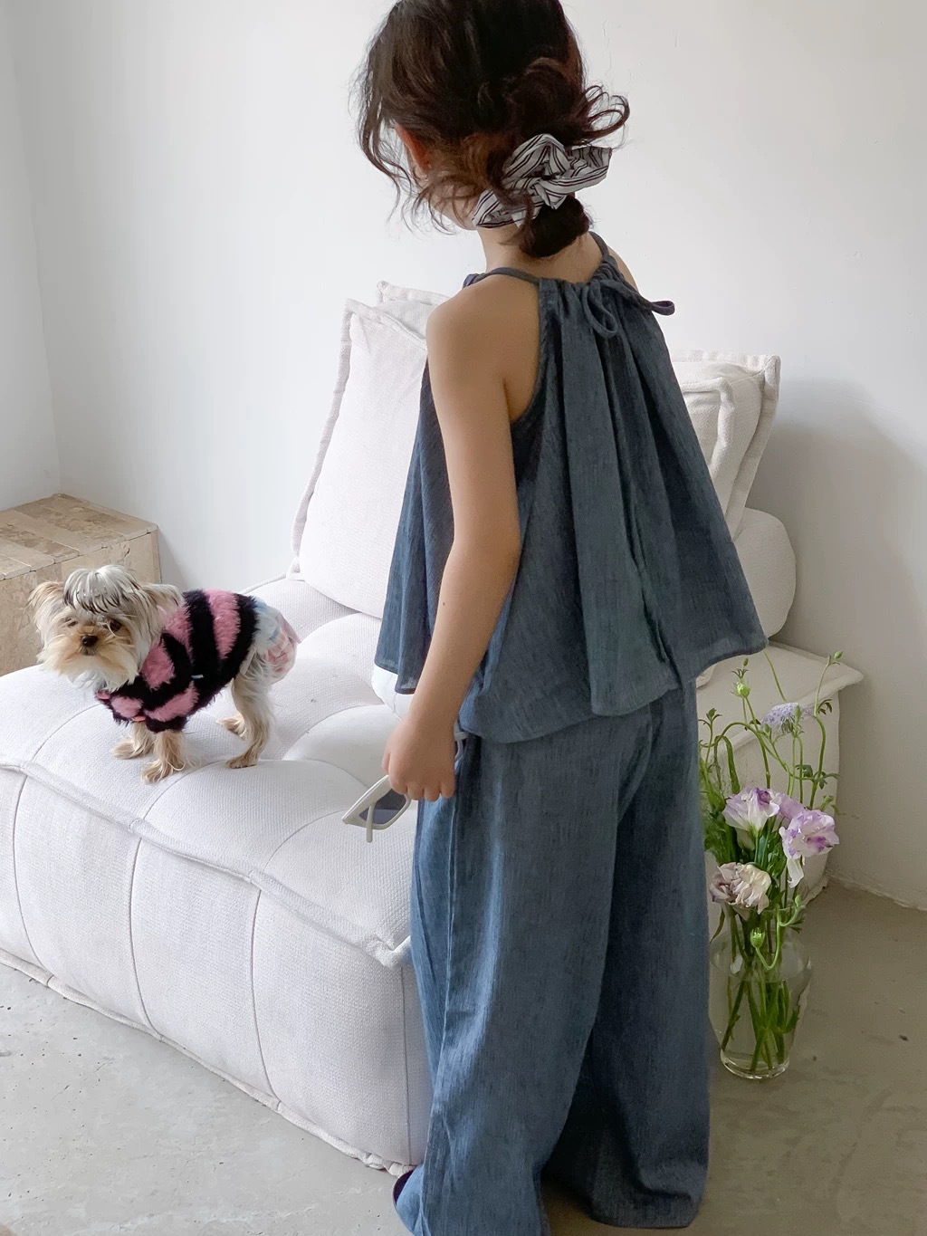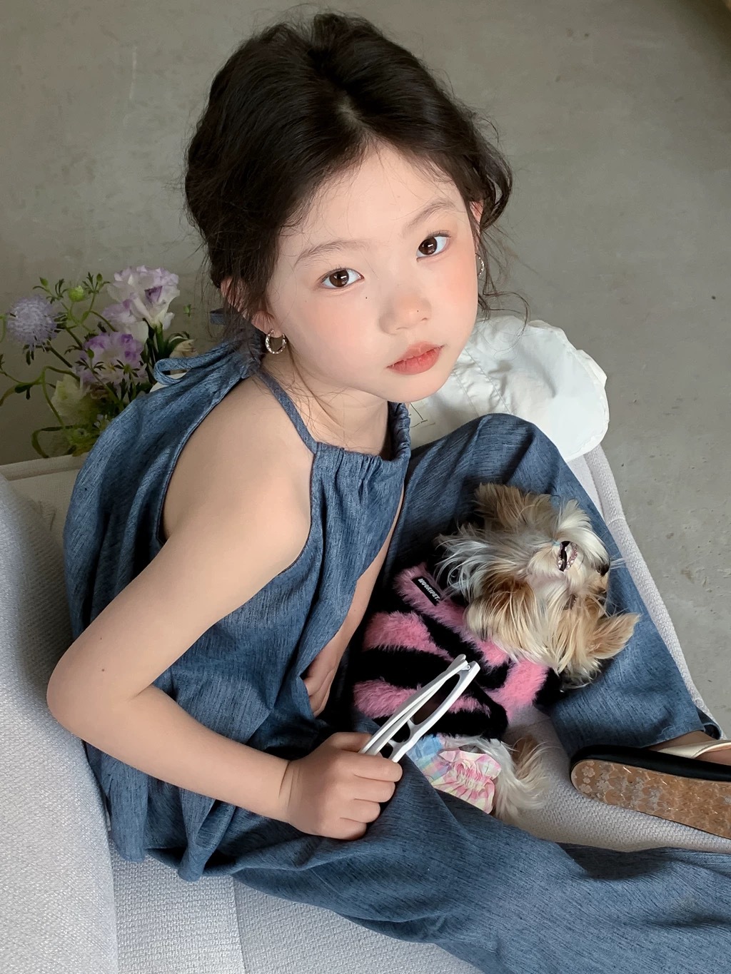 소녀 그물 유명한 튀김 거리 슬링 느슨한 세트 2024 새로운 한국 소녀 서양식 패션 넓은 다리 바지 아동복