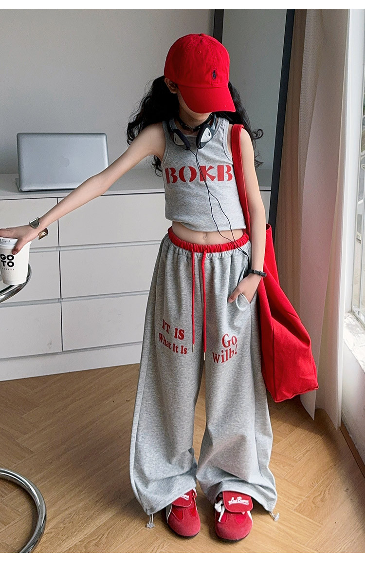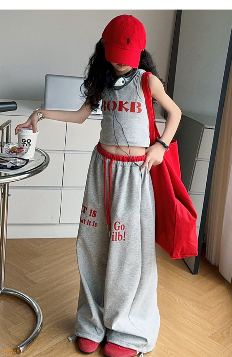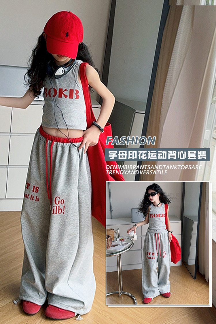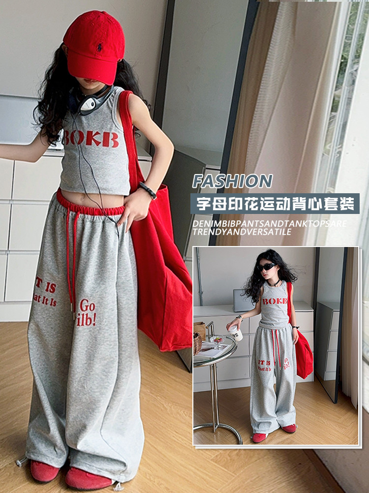 국경 간 소녀 민소매 탑 캐주얼 세트 2025 새로운 어린이 조끼 티셔츠 느슨한 넓은 다리 바지 투피스 세트스토어 가기