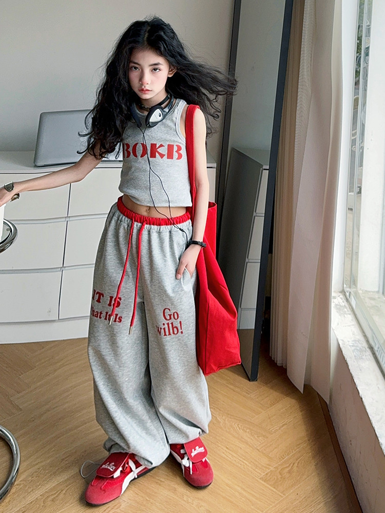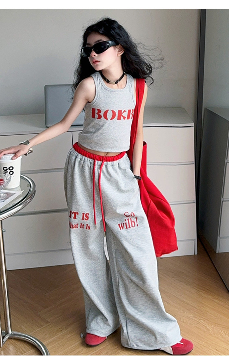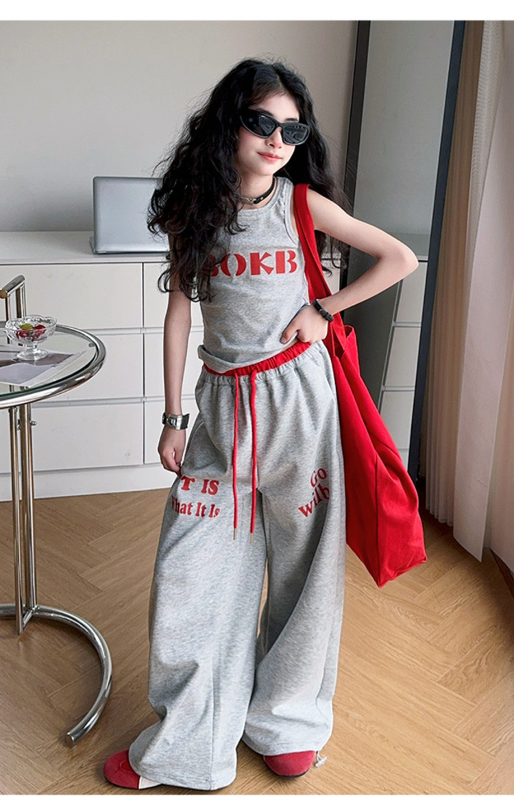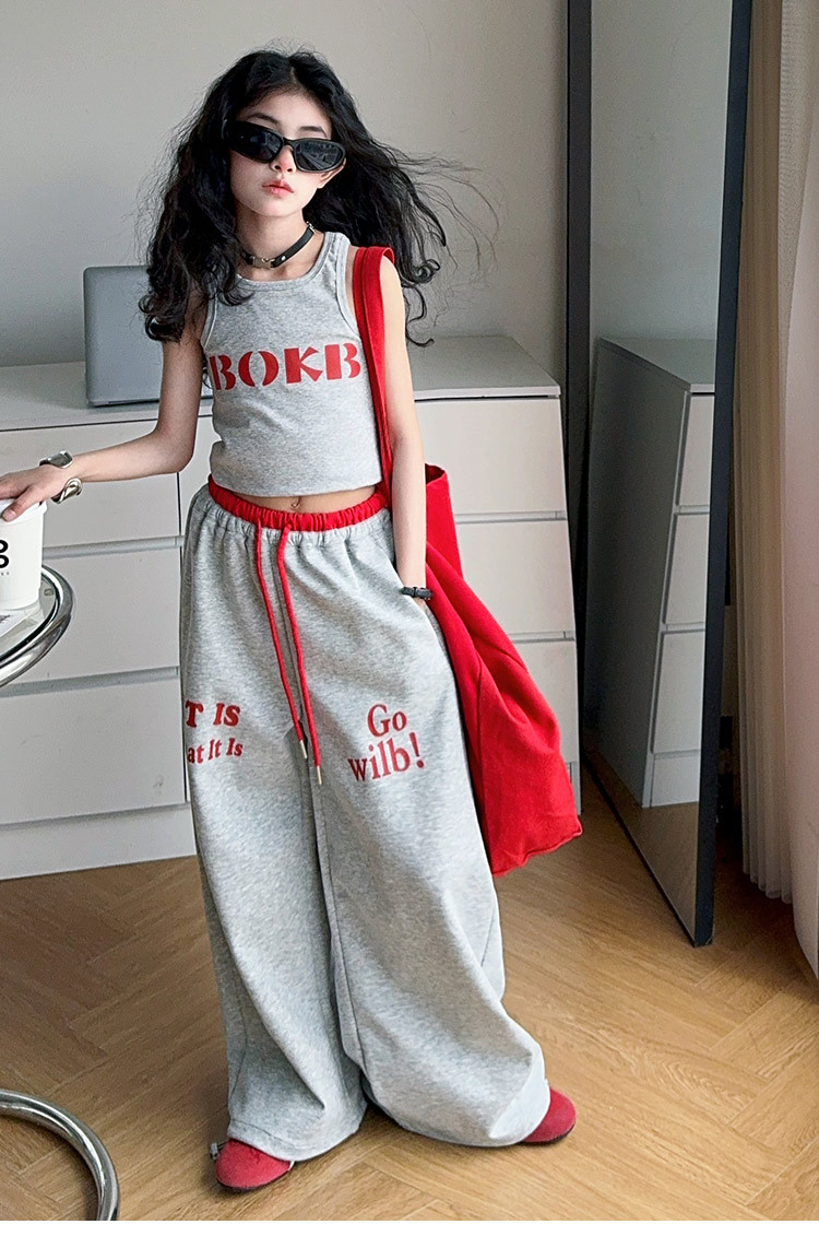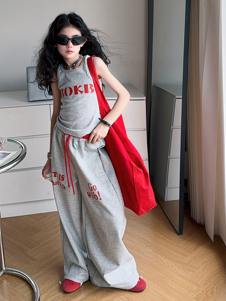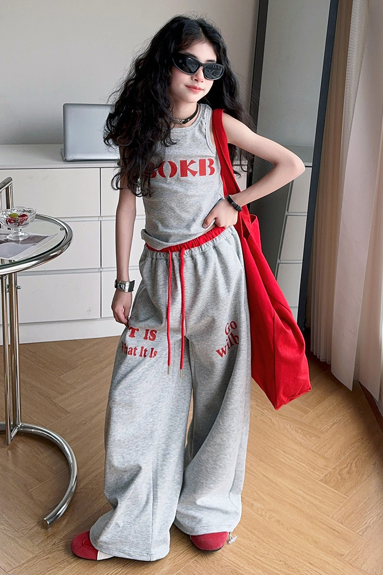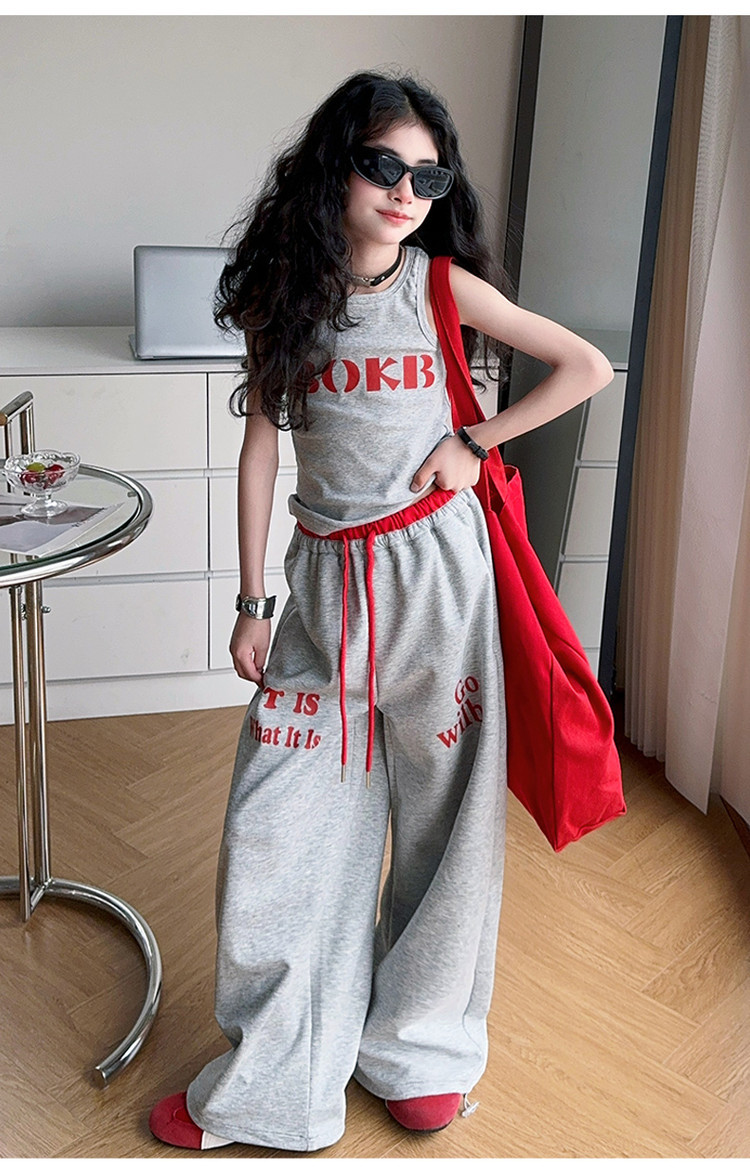 국경 간 소녀 민소매 탑 캐주얼 세트 2025 새로운 어린이 조끼 티셔츠 느슨한 넓은 다리 바지 투피스 세트