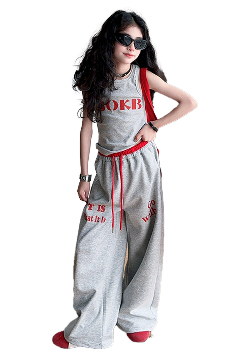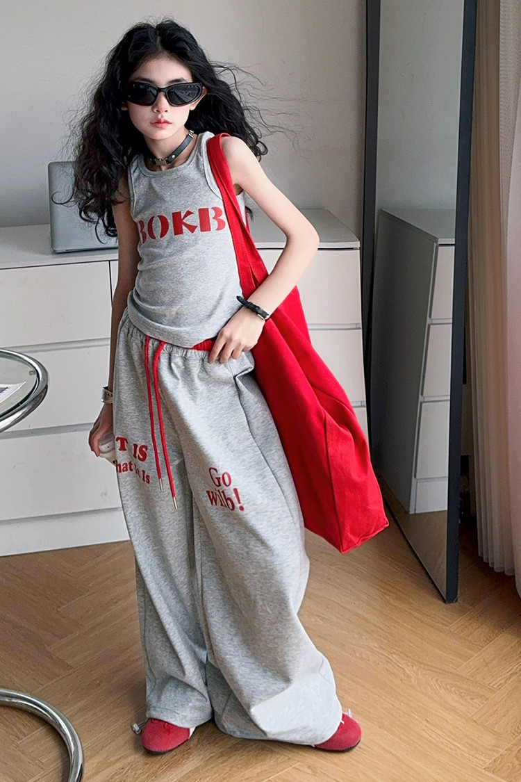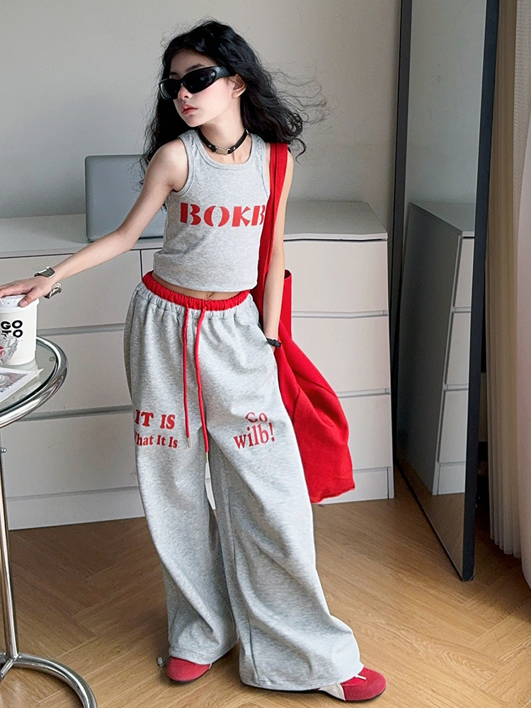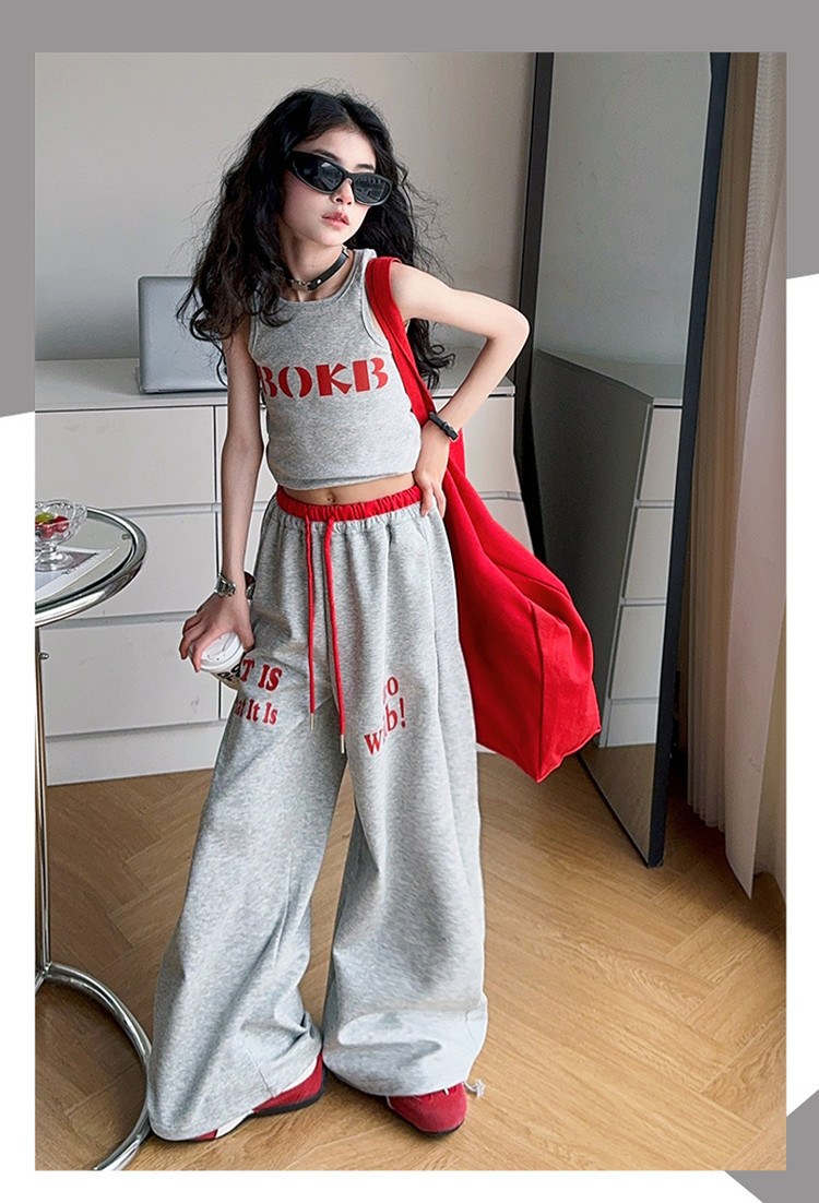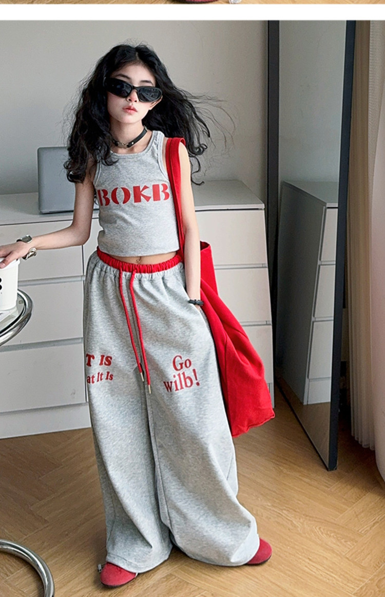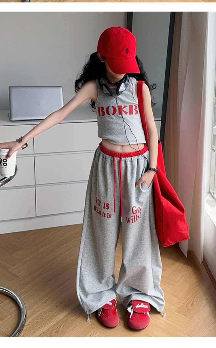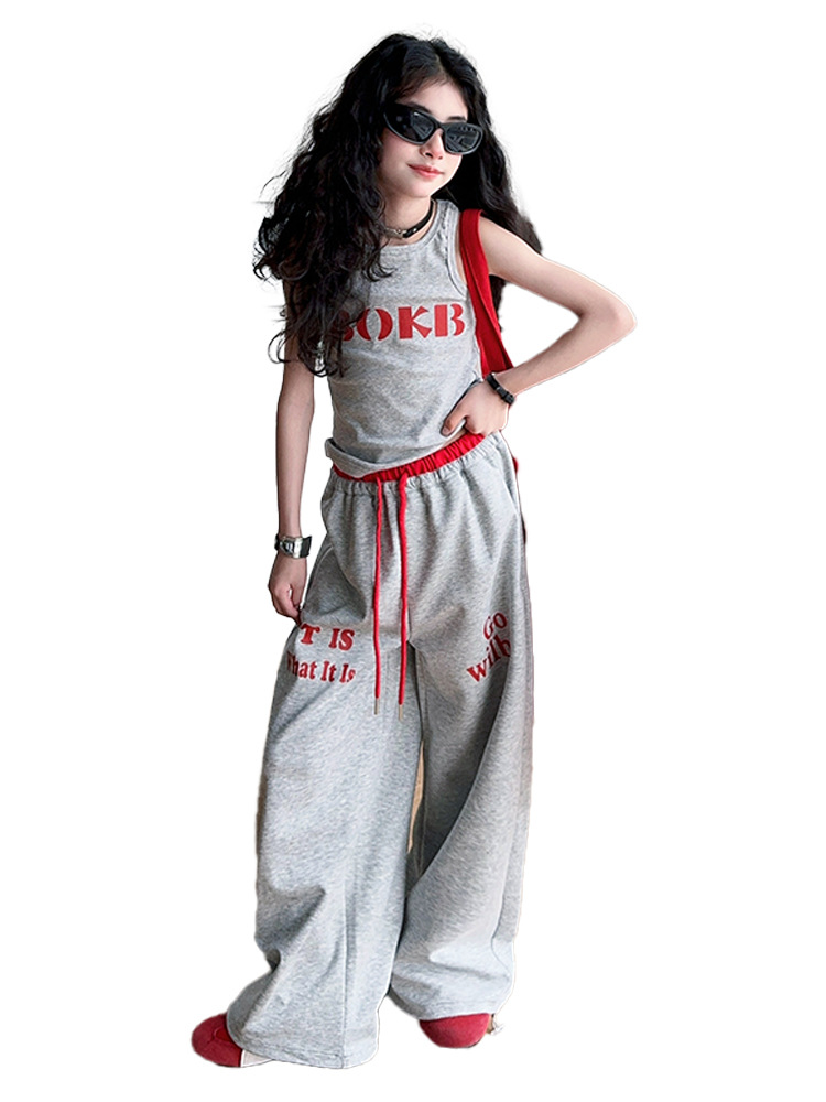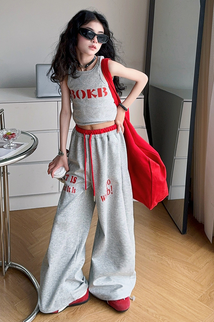 국경 간 소녀 민소매 탑 캐주얼 세트 2025 새로운 어린이 조끼 티셔츠 느슨한 넓은 다리 바지 투피스 세트