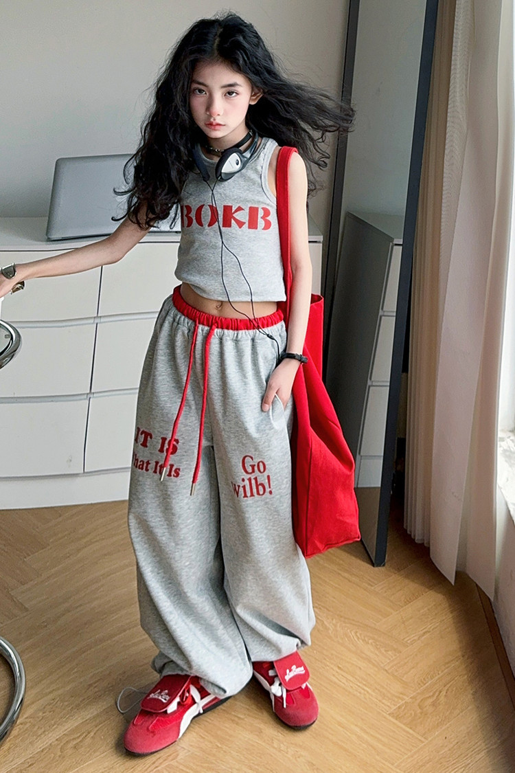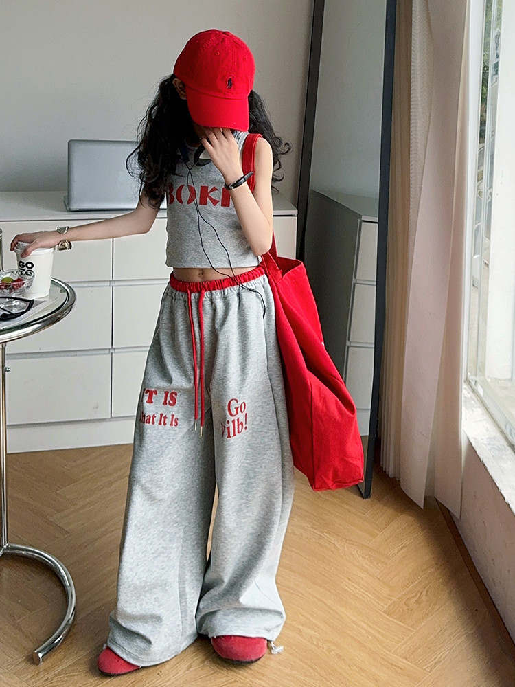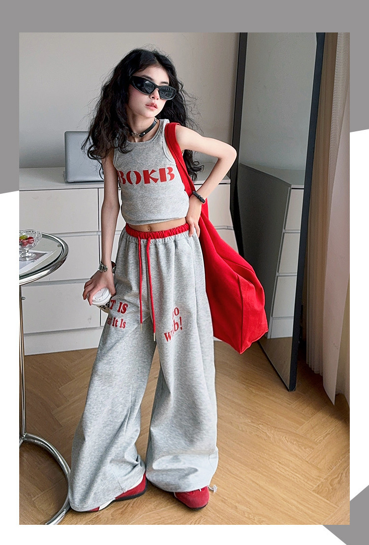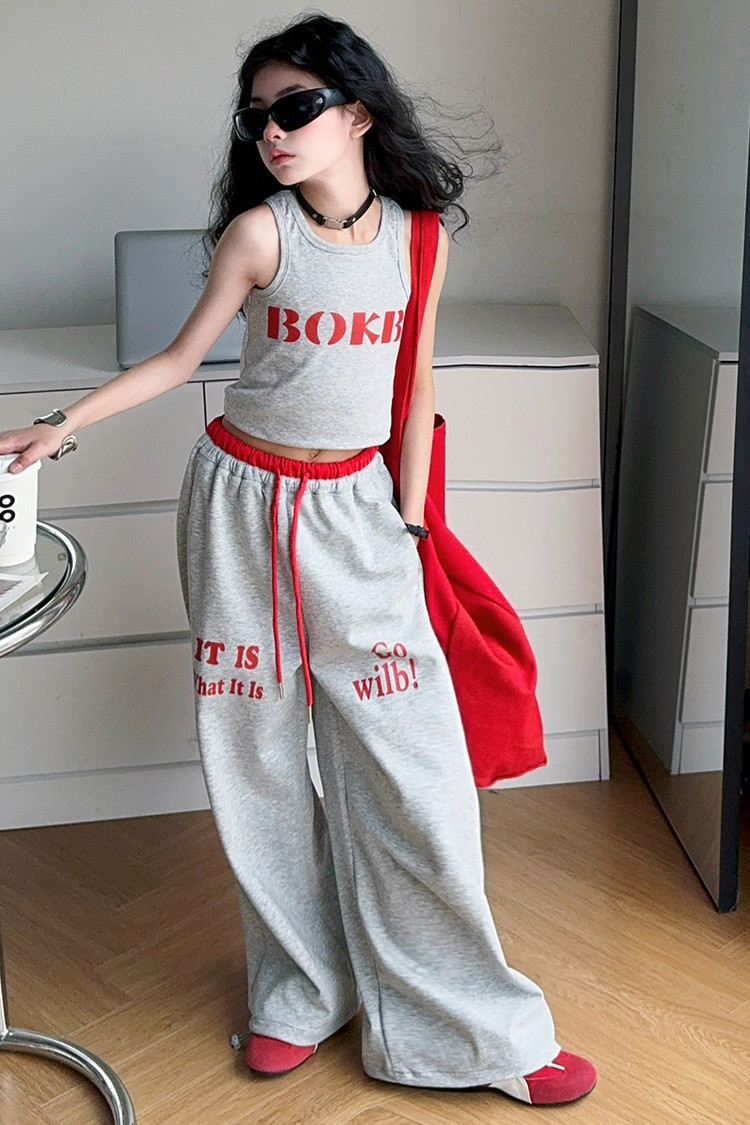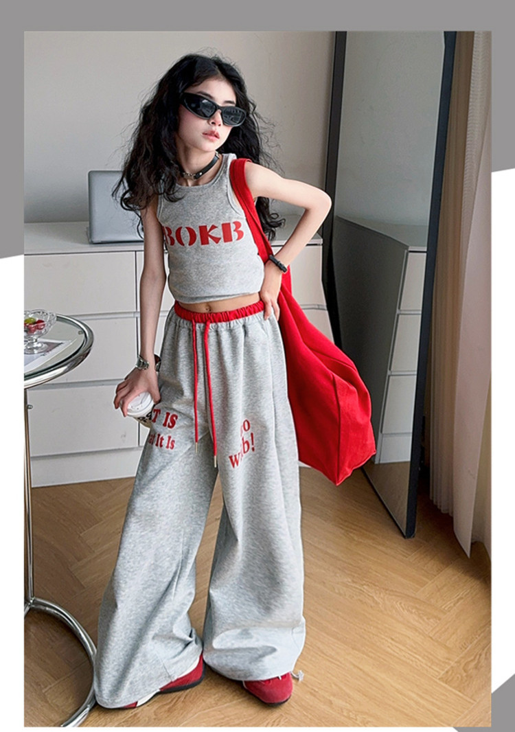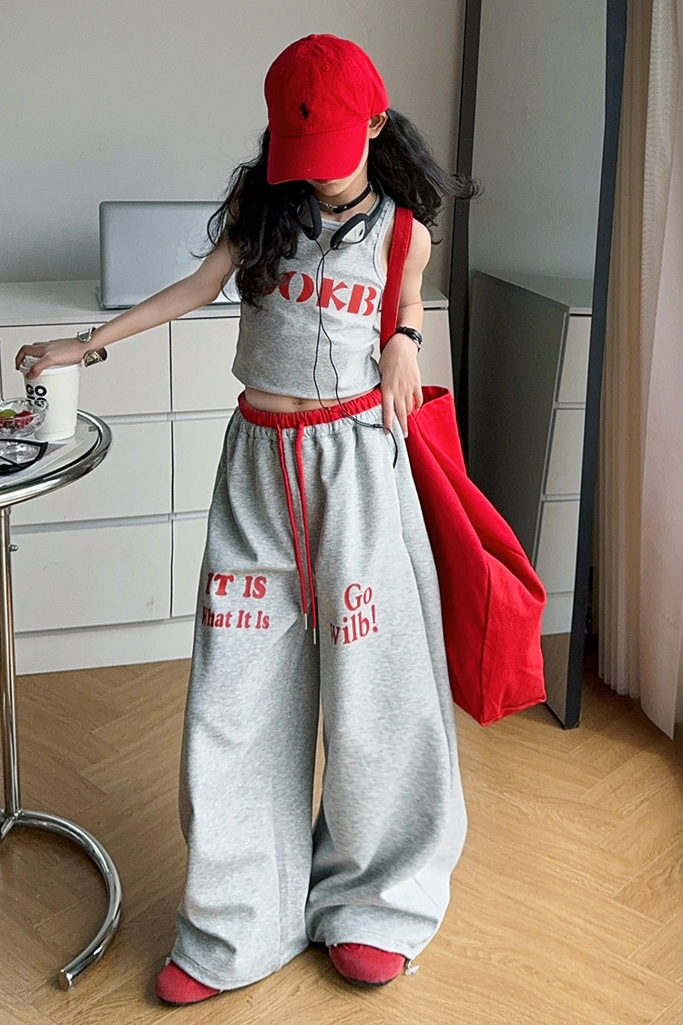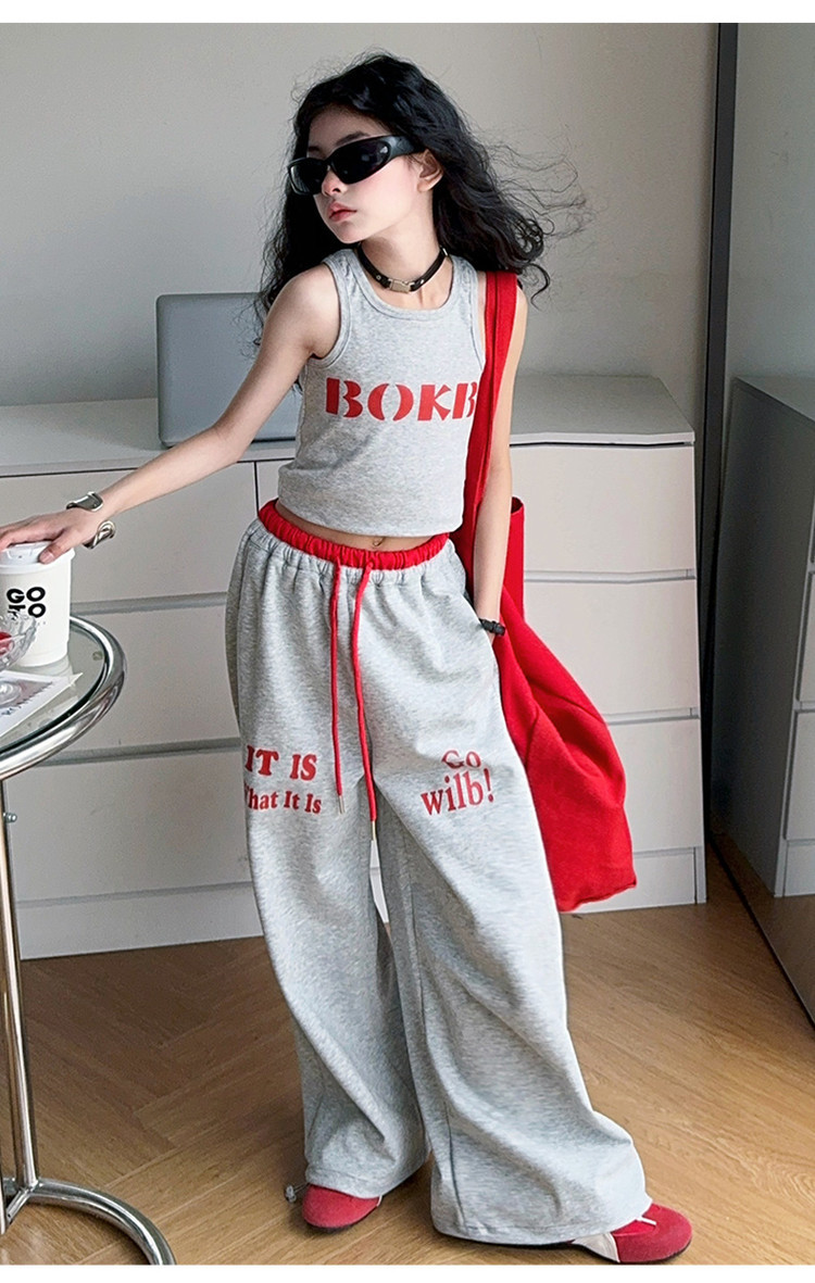 국경 간 소녀 민소매 탑 캐주얼 세트 2025 새로운 어린이 조끼 티셔츠 느슨한 넓은 다리 바지 투피스 세트