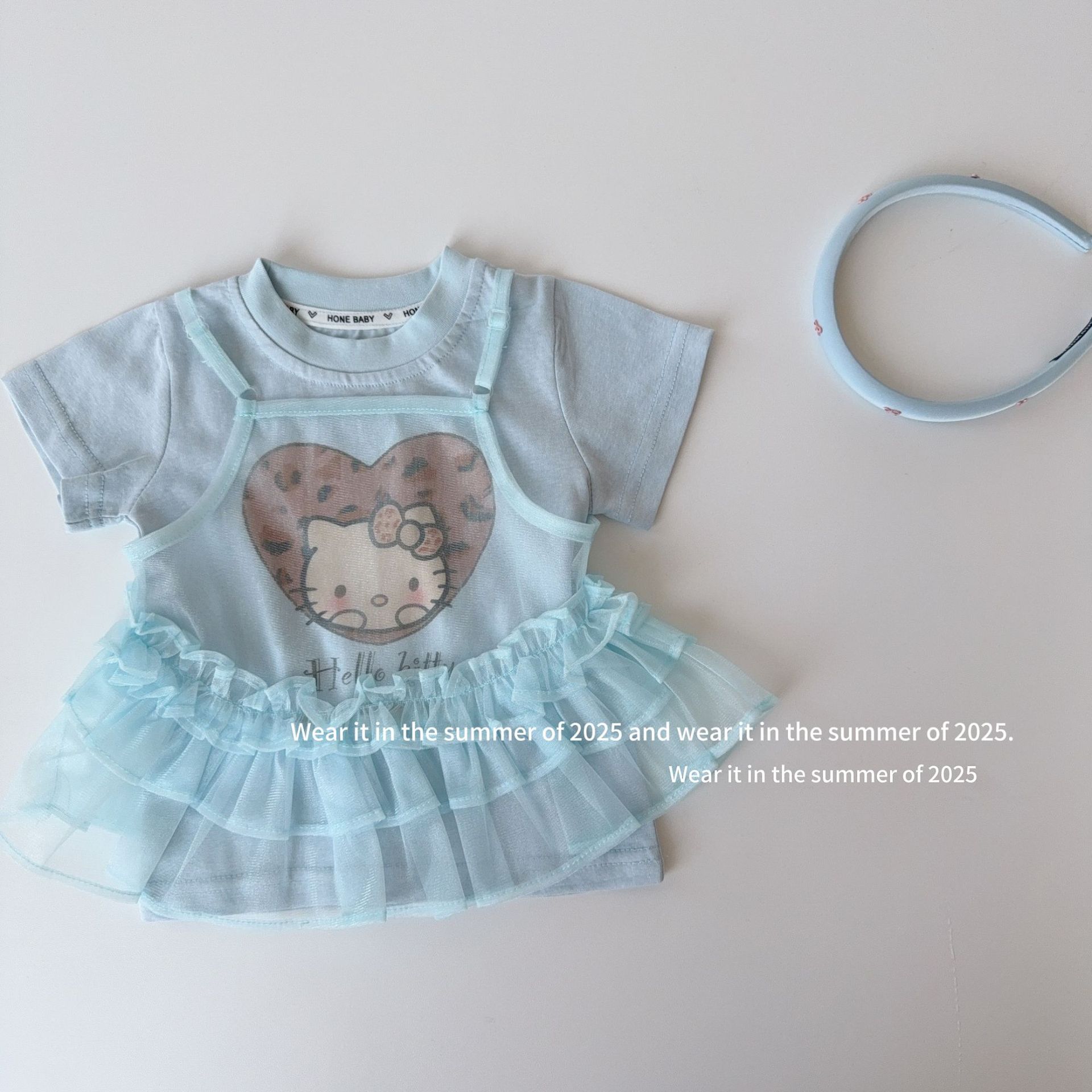 [2 피스 세트] 2025 새로운 소녀 원피스 메쉬 귀여운 헤비 듀티 스커트 반소매 스웨터 스커트 귀여운