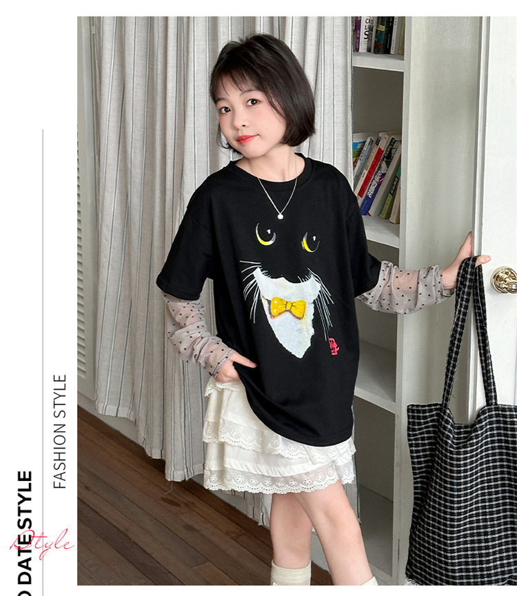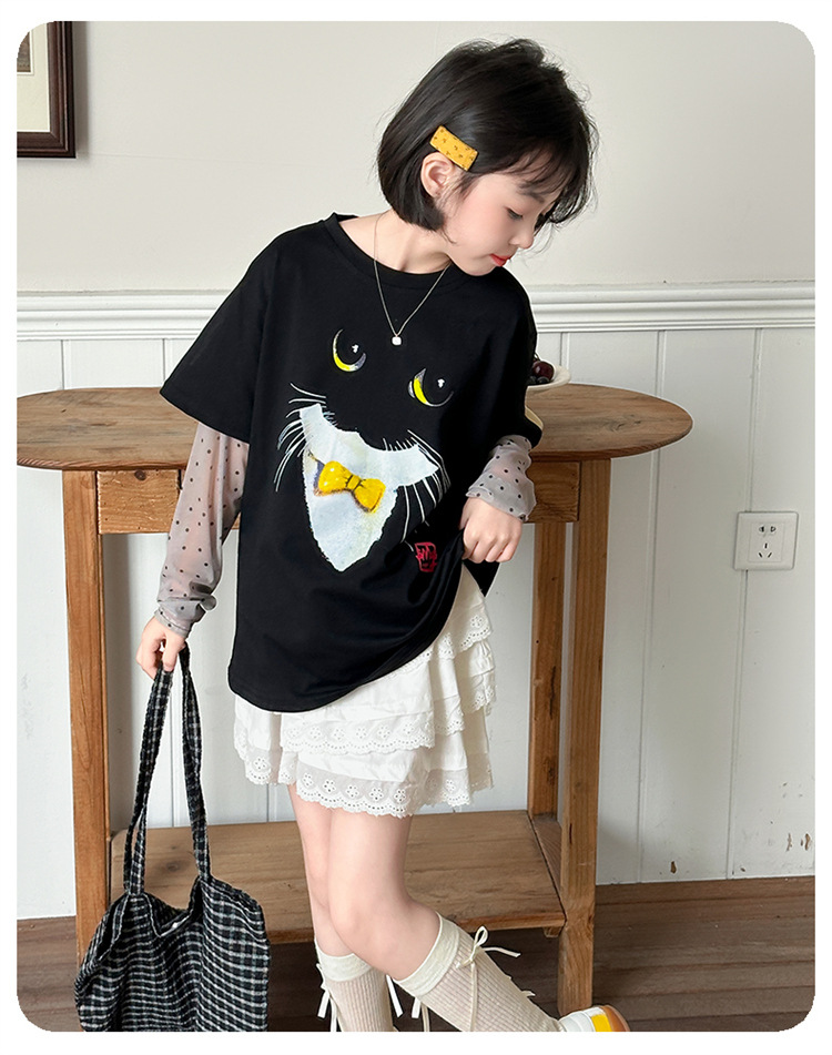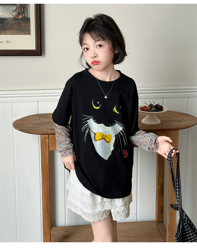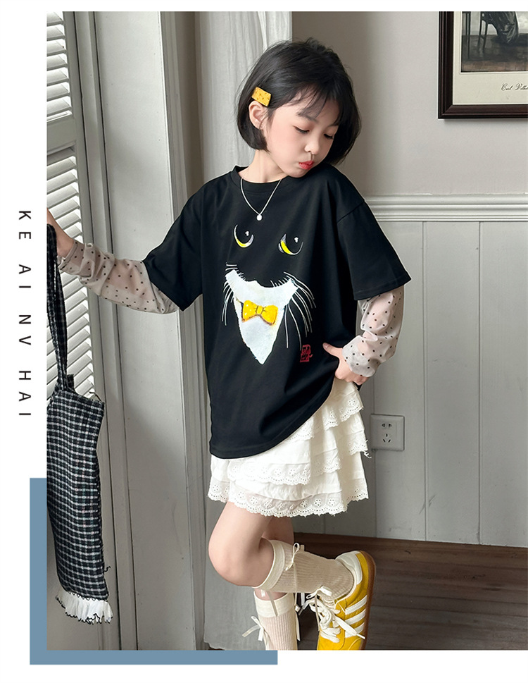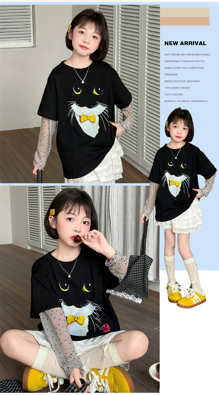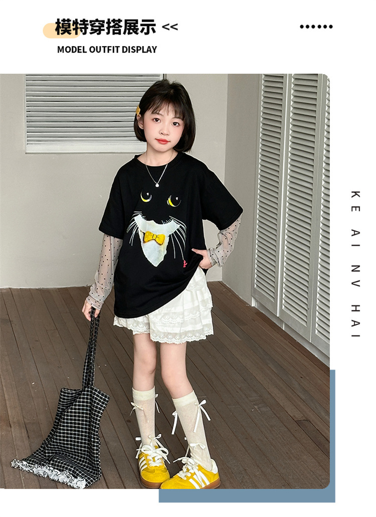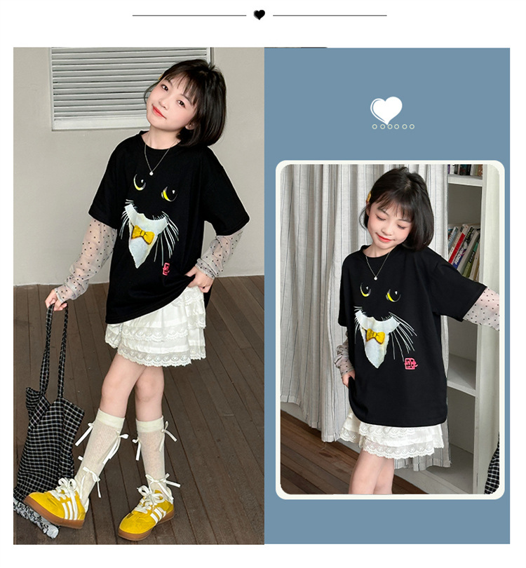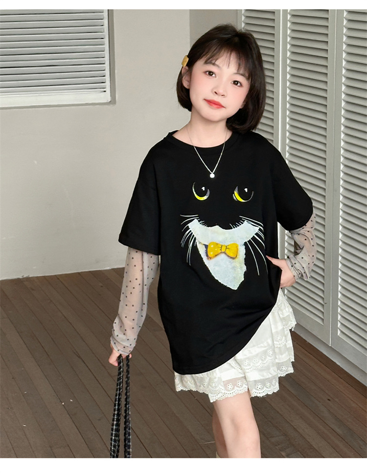 소녀 선 스크린 소매 반팔 티셔츠 블랙 귀여운 고양이 트렌디 쿨 걸스 중 큰 아이 서양식 여름 한국 세트스토어 가기