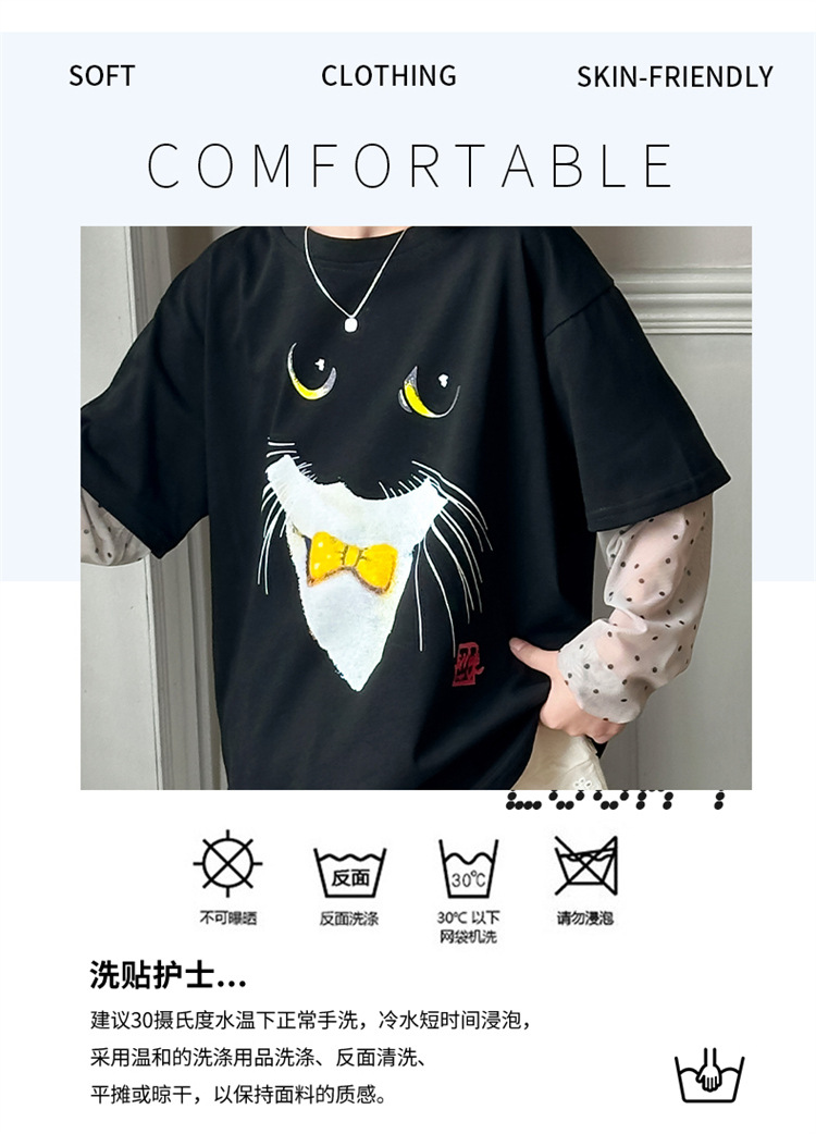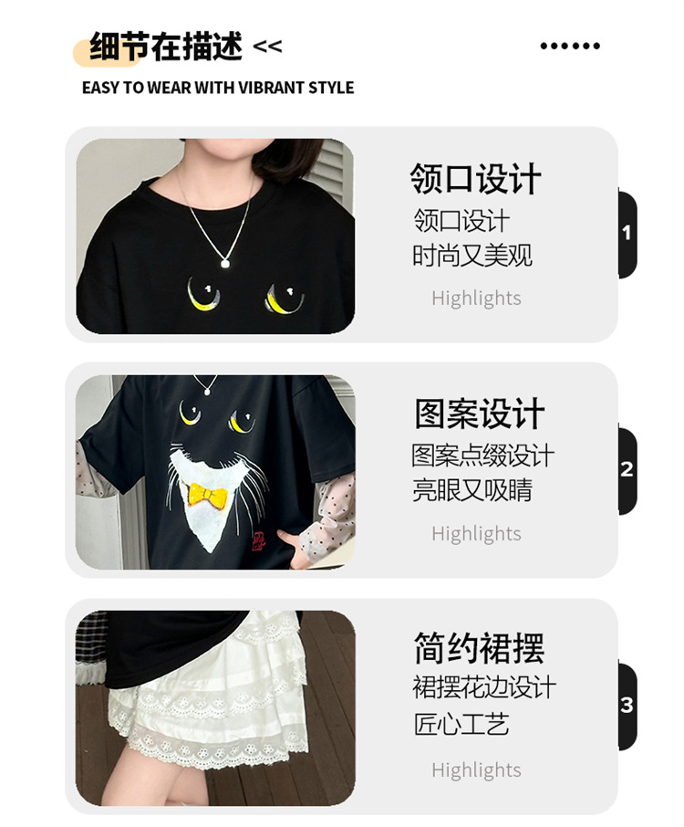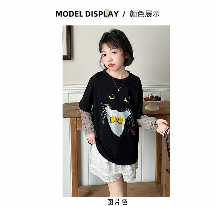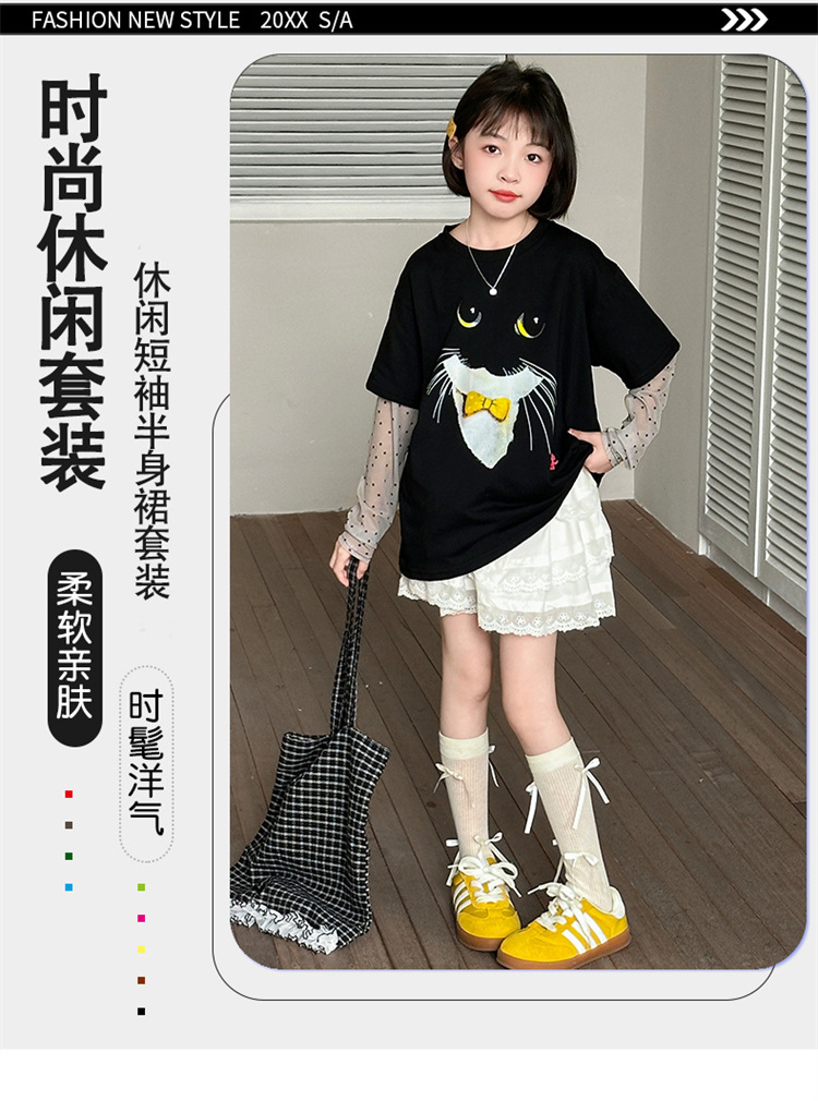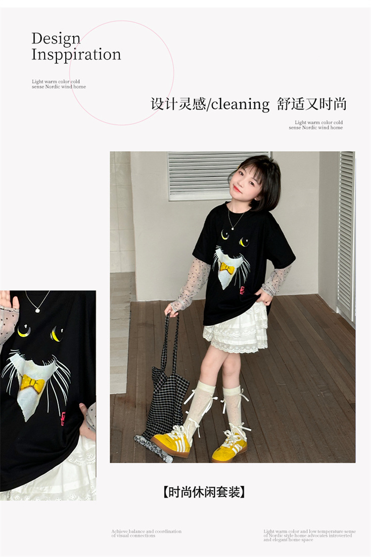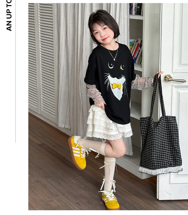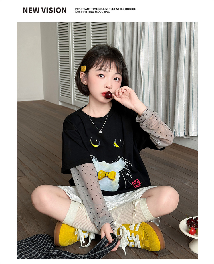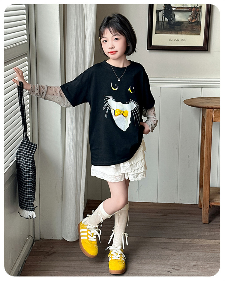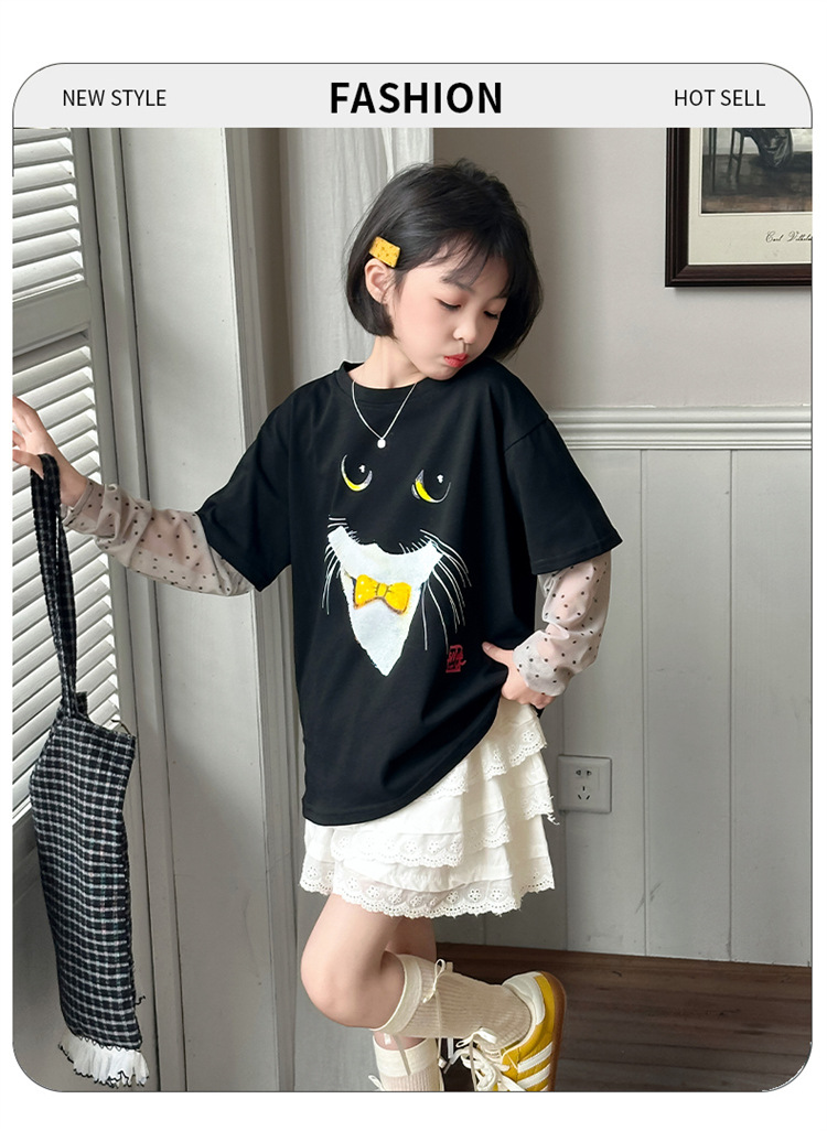 소녀 선 스크린 소매 반팔 티셔츠 블랙 귀여운 고양이 트렌디 쿨 걸스 중 큰 아이 서양식 여름 한국 세트스토어 가기