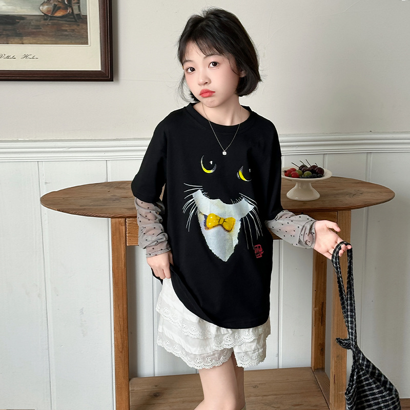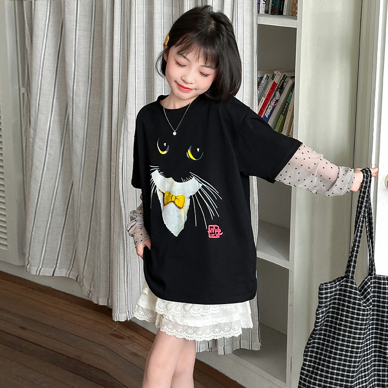 소녀 선 스크린 소매 반팔 티셔츠 블랙 귀여운 고양이 트렌디 쿨 걸스 중 큰 아이 서양식 여름 한국 세트