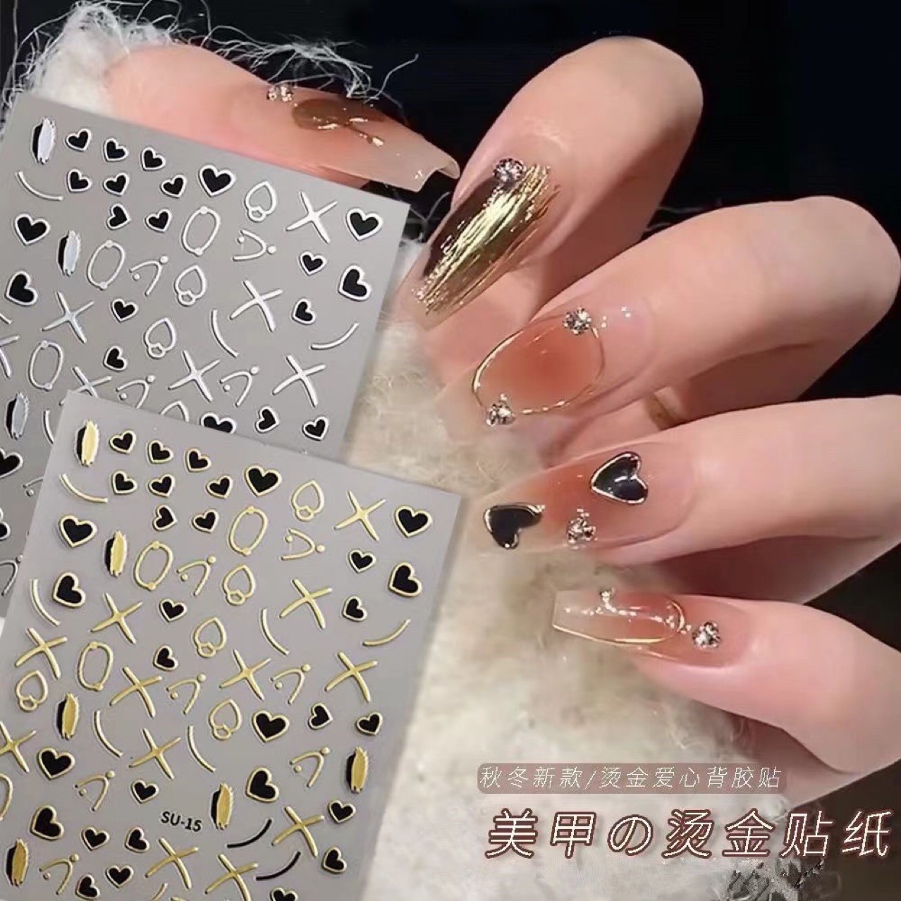 그물 붉은 청동 사랑 네일 아트 스티커 스트로크 잠금 하트 골드 가장자리 중공 기하학적 금속 네일 데칼 장식 도매스토어 가기