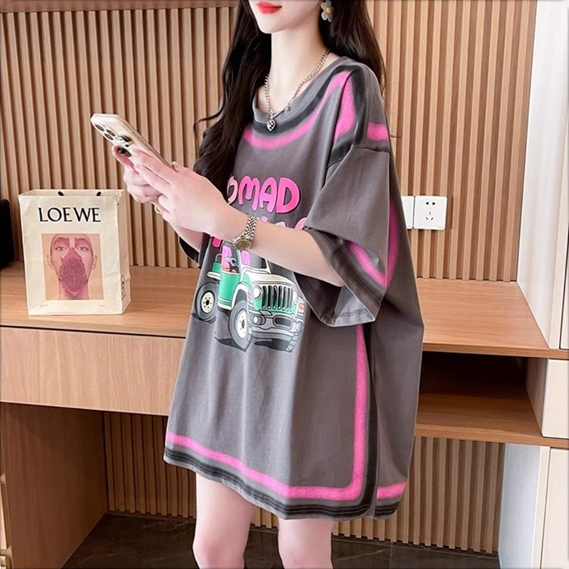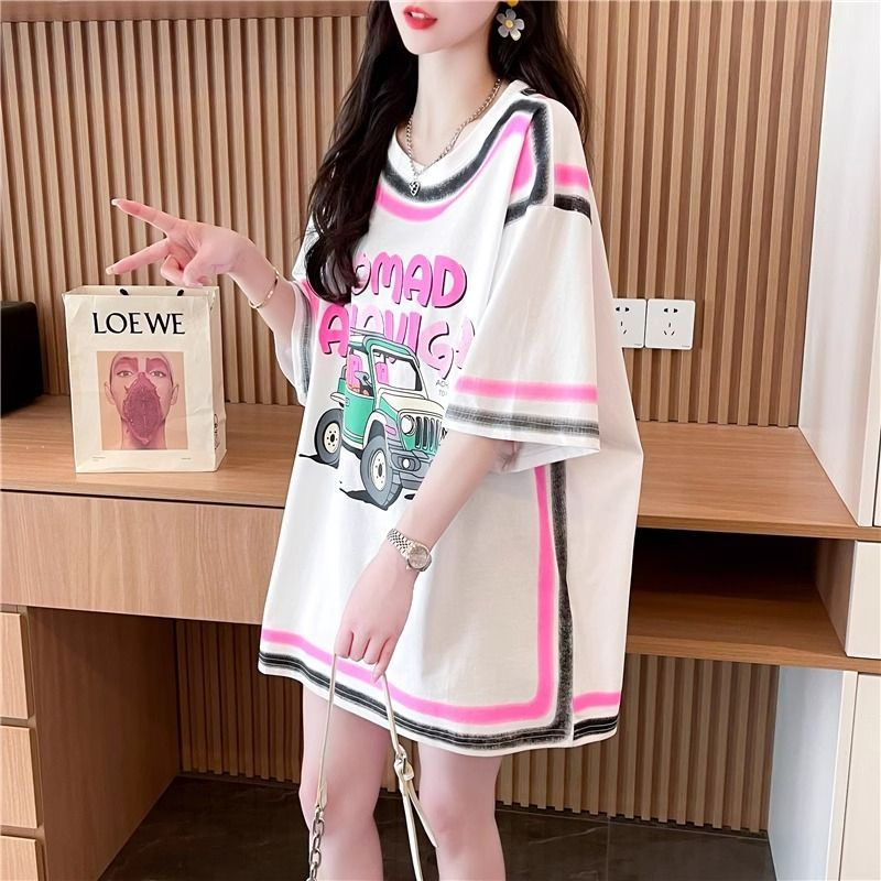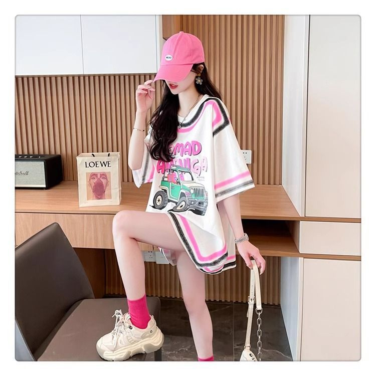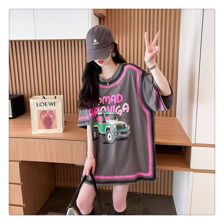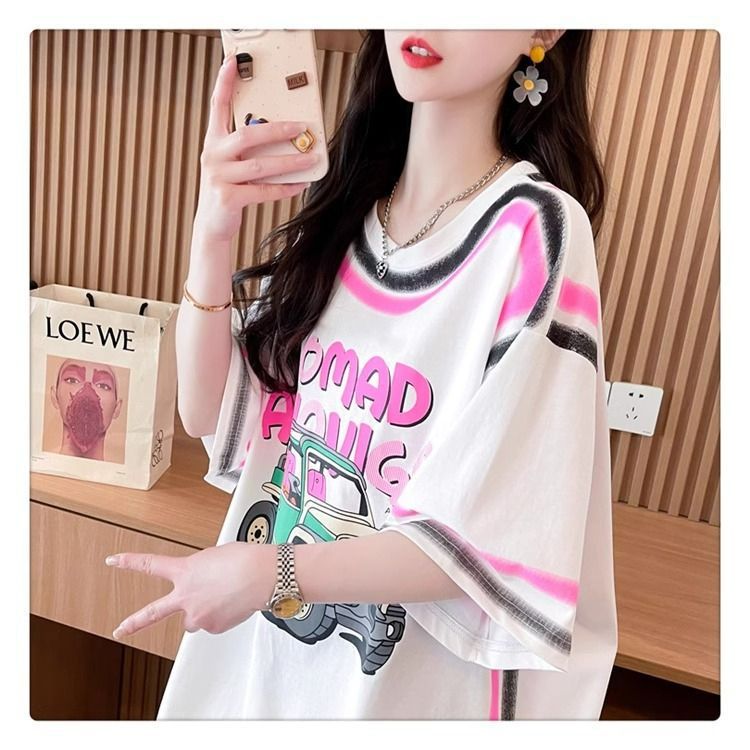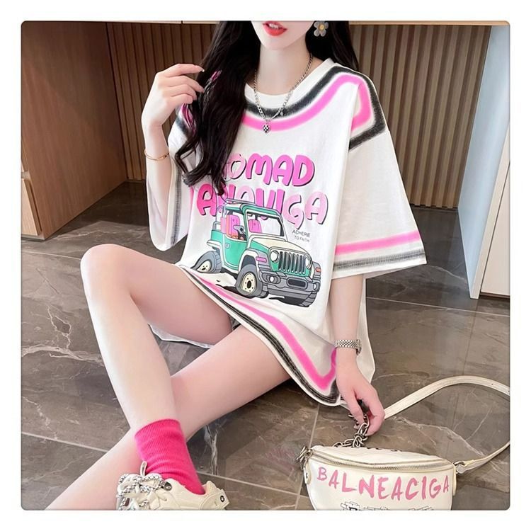 퓨어 코튼 버트 커버 반팔 티셔츠 여성용 여름 새로운 중간 길이의 폭발적인 느슨한 서양식 디자인 인쇄 탑