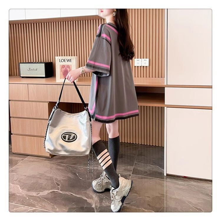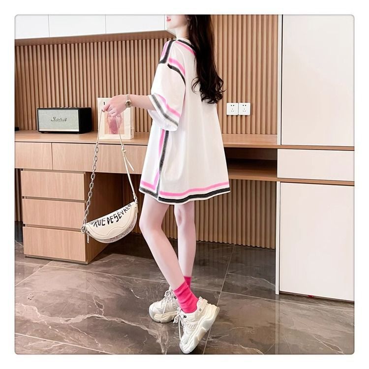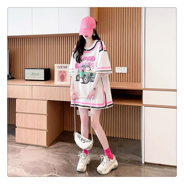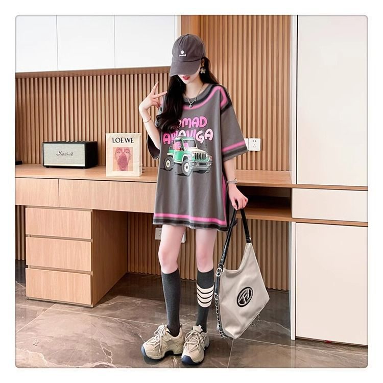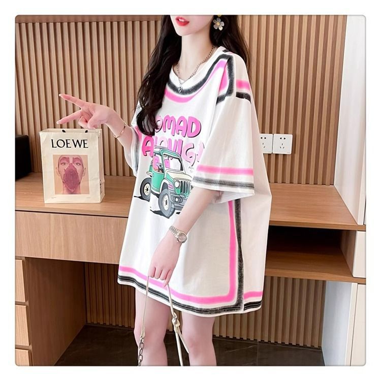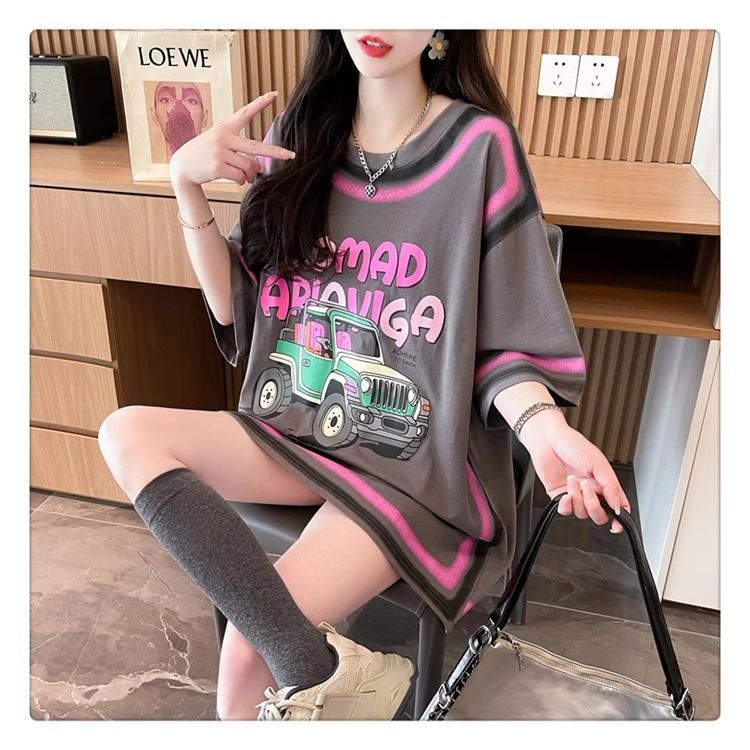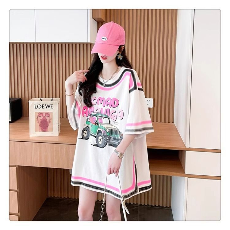 퓨어 코튼 버트 커버 반팔 티셔츠 여성용 여름 새로운 중간 길이의 폭발적인 느슨한 서양식 디자인 인쇄 탑