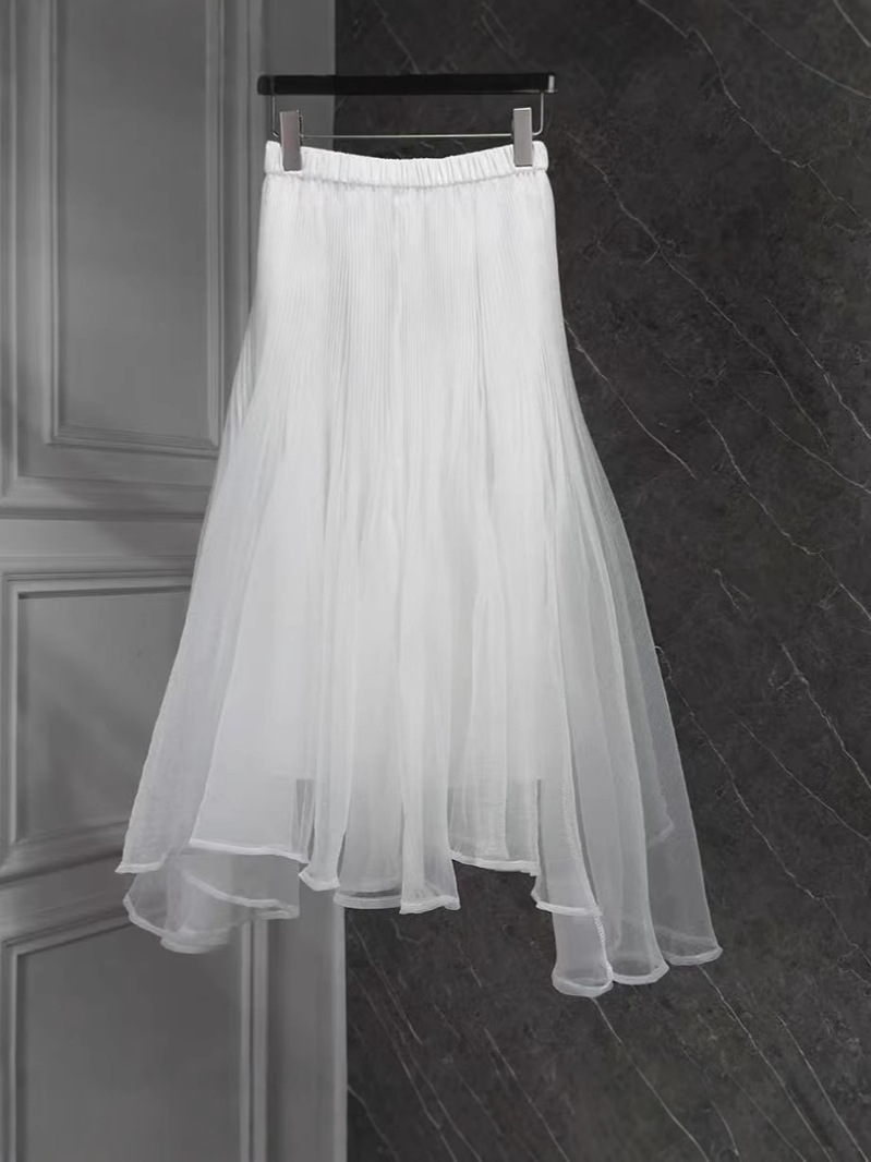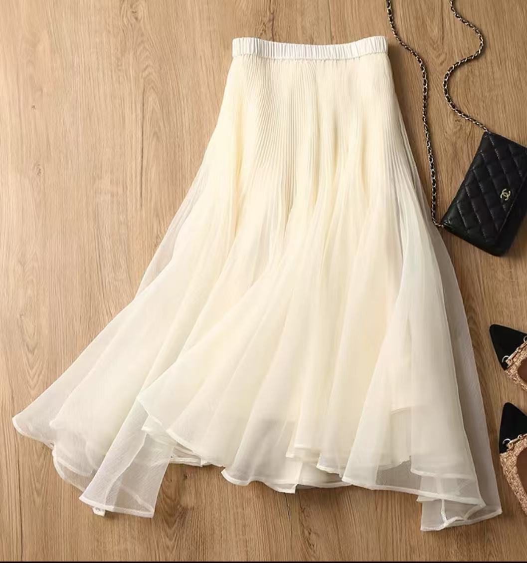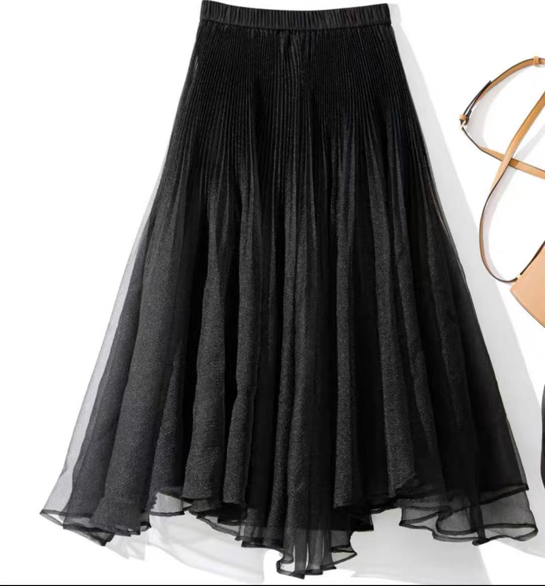 메쉬 스커트 새로운 하이 웨이스트 플리츠 슬리밍 중간 길이 피쉬테일 거즈 스커트 롱 스커트 여성 우아한 A 라인 스커트