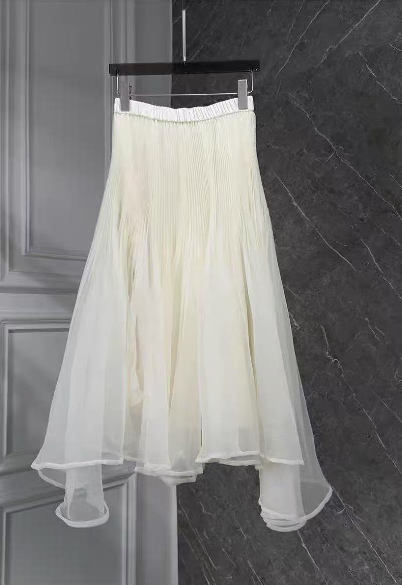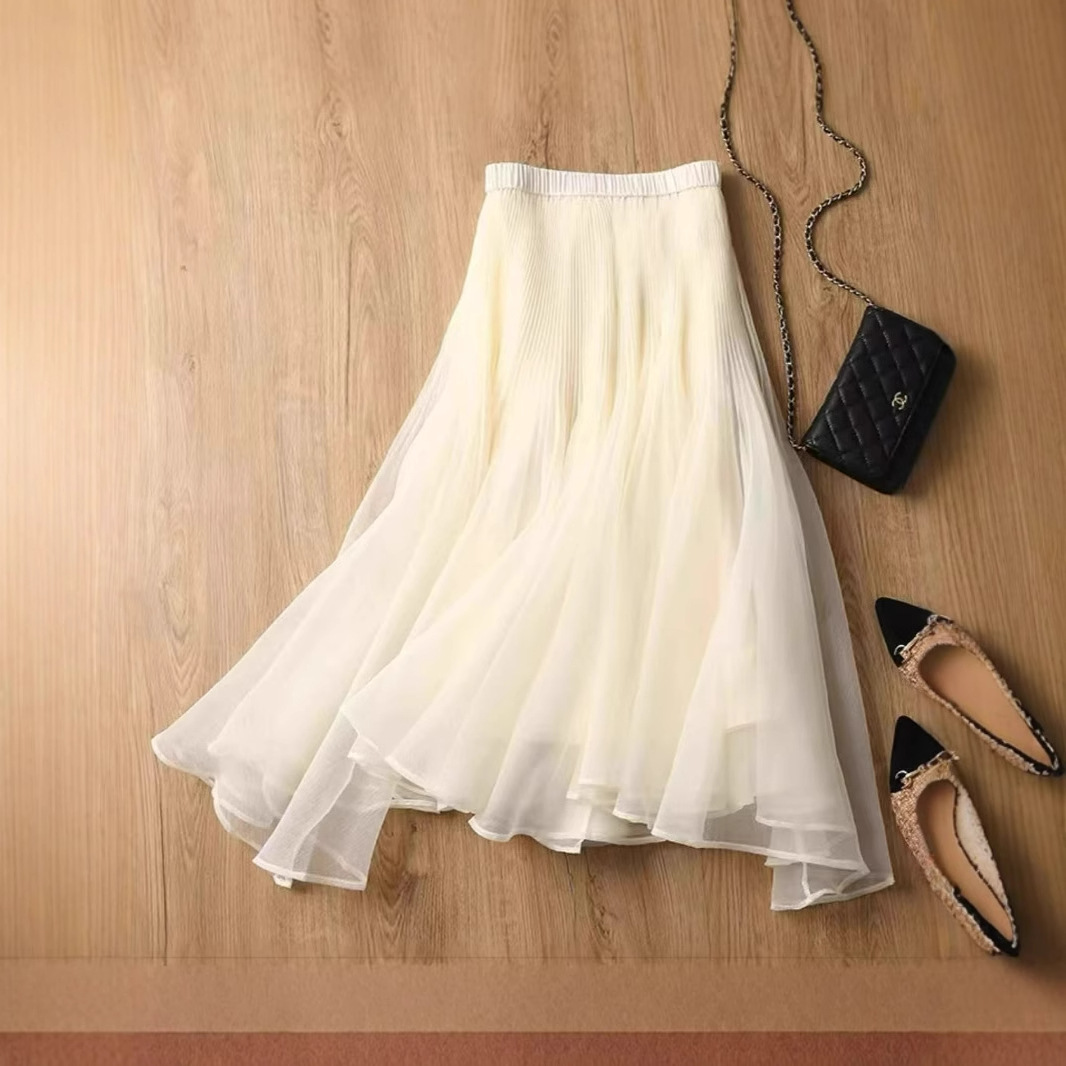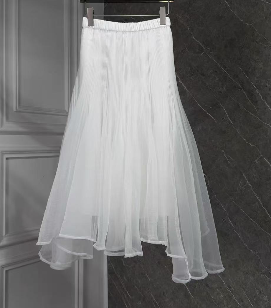 메쉬 스커트 새로운 하이 웨이스트 플리츠 슬리밍 중간 길이 피쉬테일 거즈 스커트 롱 스커트 여성 우아한 A 라인 스커트