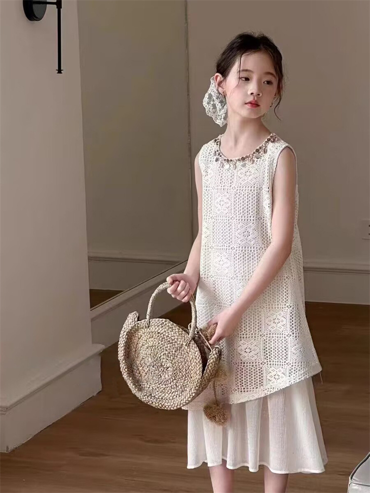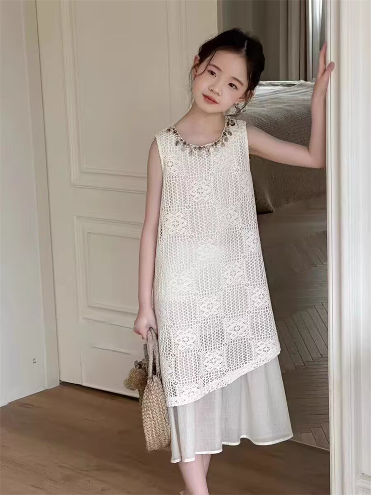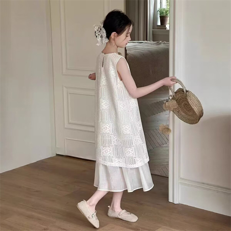 불규칙한 레이스 바느질 가짜 투피스 더블 레이어 원피스 2025 여름 민소매 할로우 디자인 우아한 긴 원피스스토어 가기