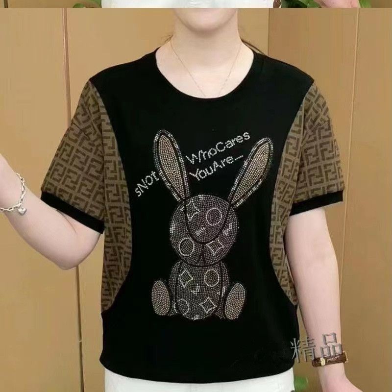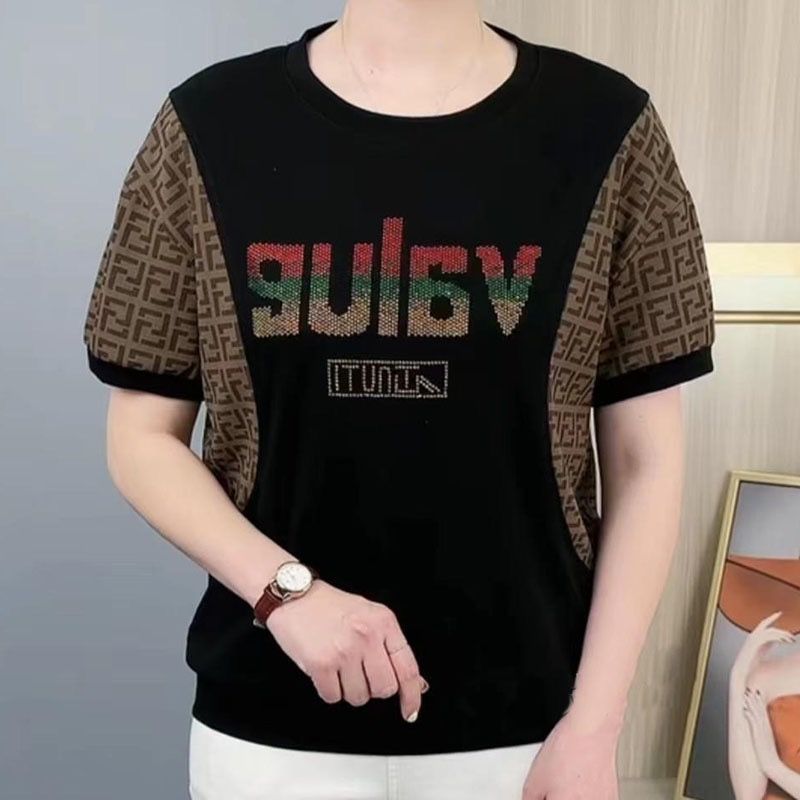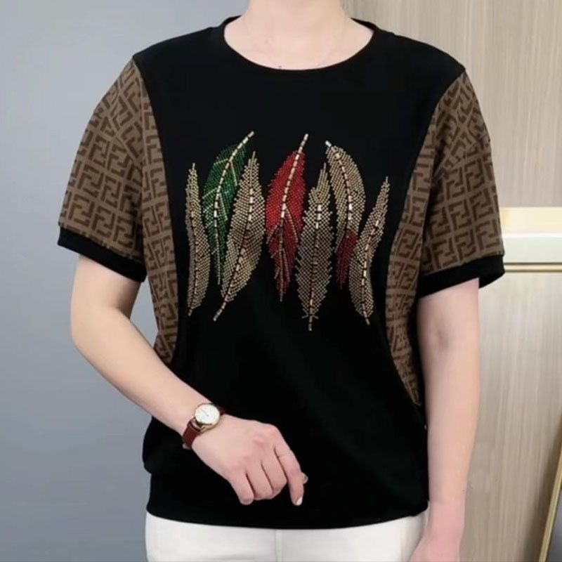 플러스 사이즈 100.00kg 반팔 여성 티셔츠 여름 새로운 도착 중년 어머니 느슨한 배꼽 커버 핫 드릴링 스타일 올 매치 탑