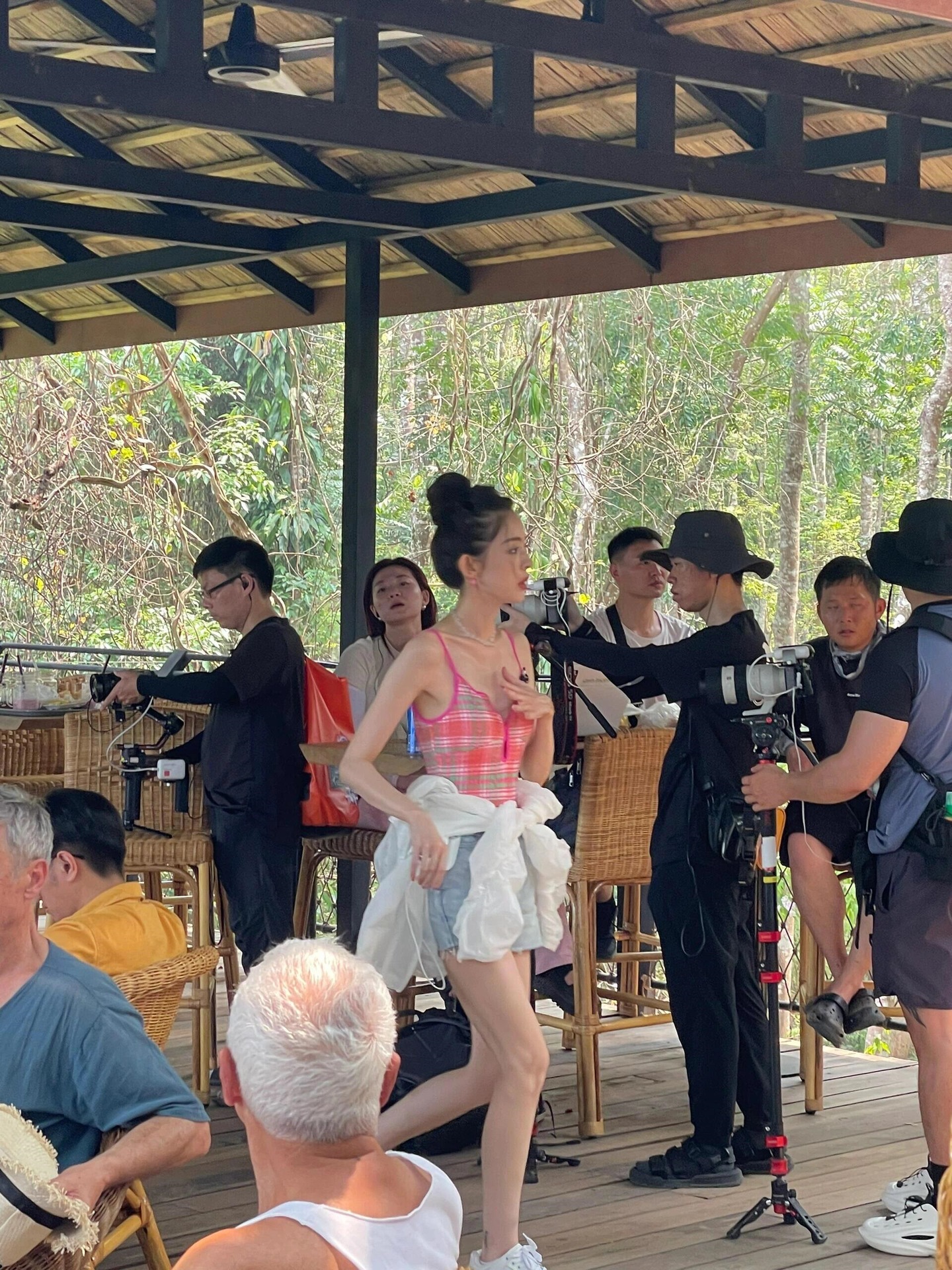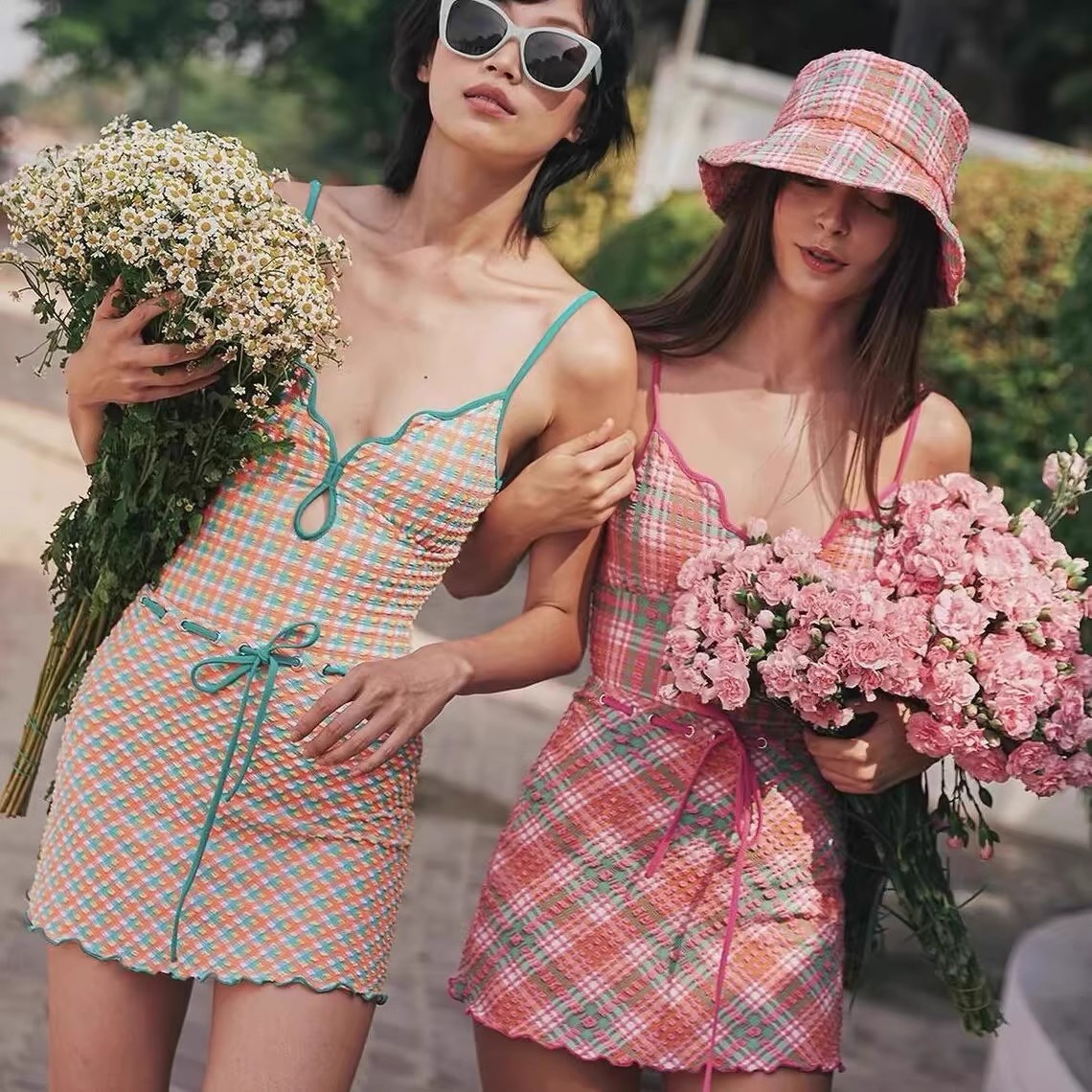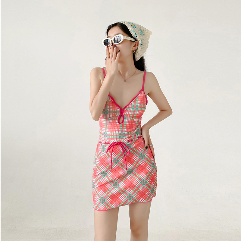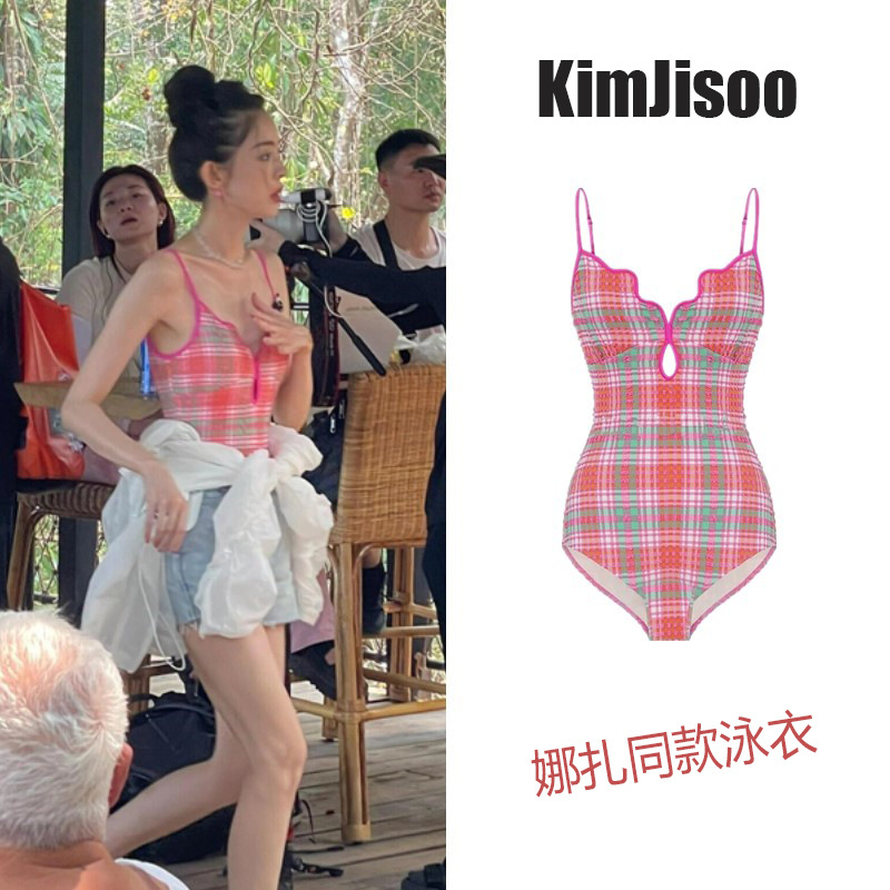 수영복 여성 Gulinaza 같은 스타일 비키니 2025 원피스 핑크 격자 무늬 온천 휴가 수영복스토어 가기