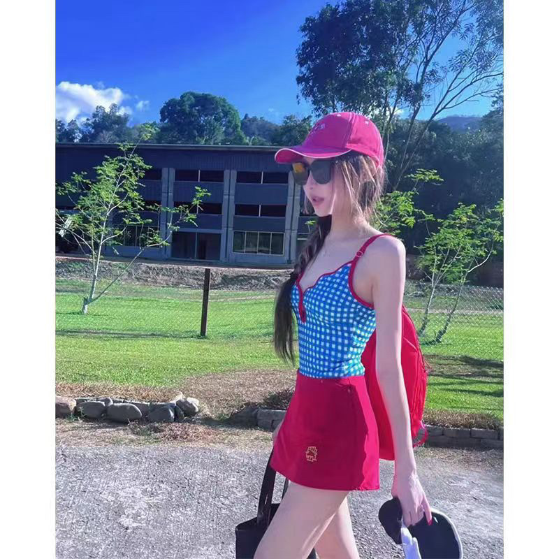 • 블루 체크무늬 수영복+레드 스커트 투피스 세트