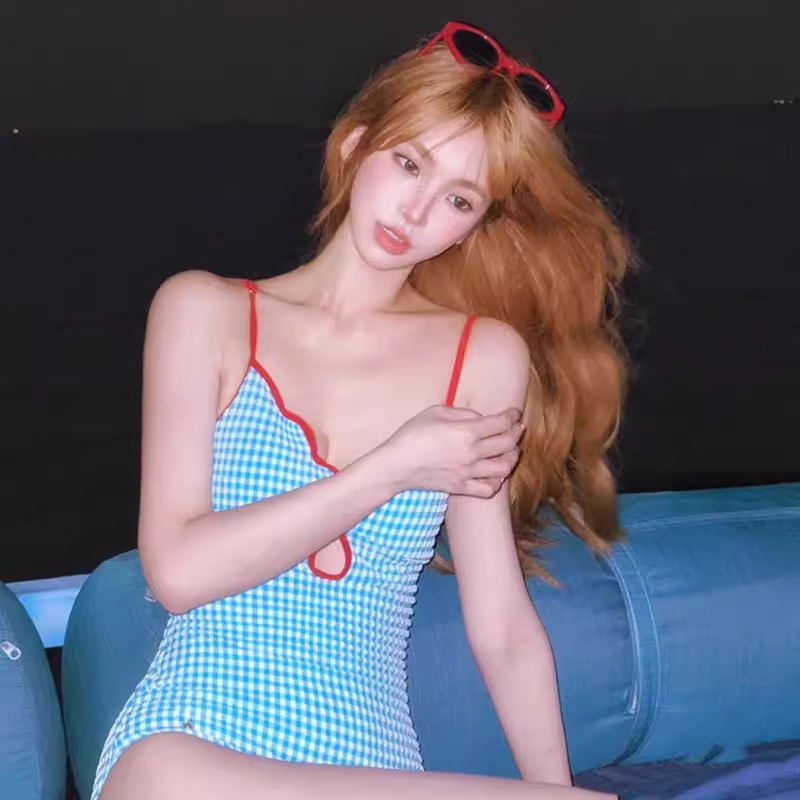 수영복 여성 Gulinaza 같은 스타일 비키니 2025 원피스 핑크 격자 무늬 온천 휴가 수영복