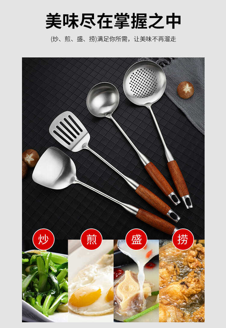 Huali 나무 손잡이 304 스테인레스 스틸 대형 수프 스푼 가정용 Wok 스푼 주방 긴 손잡이 수프 죽 쌀 볶음 숟가락