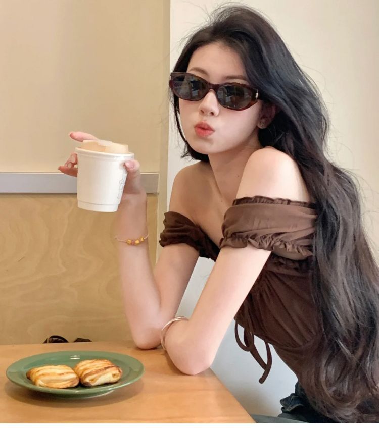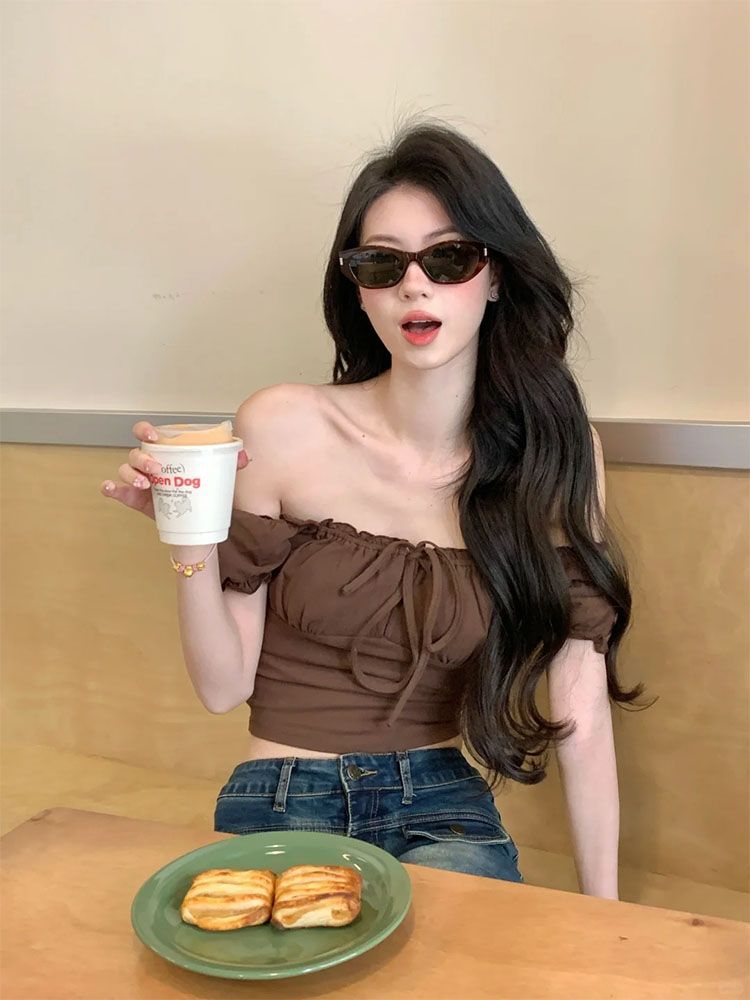 스퀘어 칼라 버블 슬리브 반팔 티셔츠 여성용 여름 작은 슬림 핏 슬리밍 캐주얼 올 매치 쇼트 콜라본 공개 탑