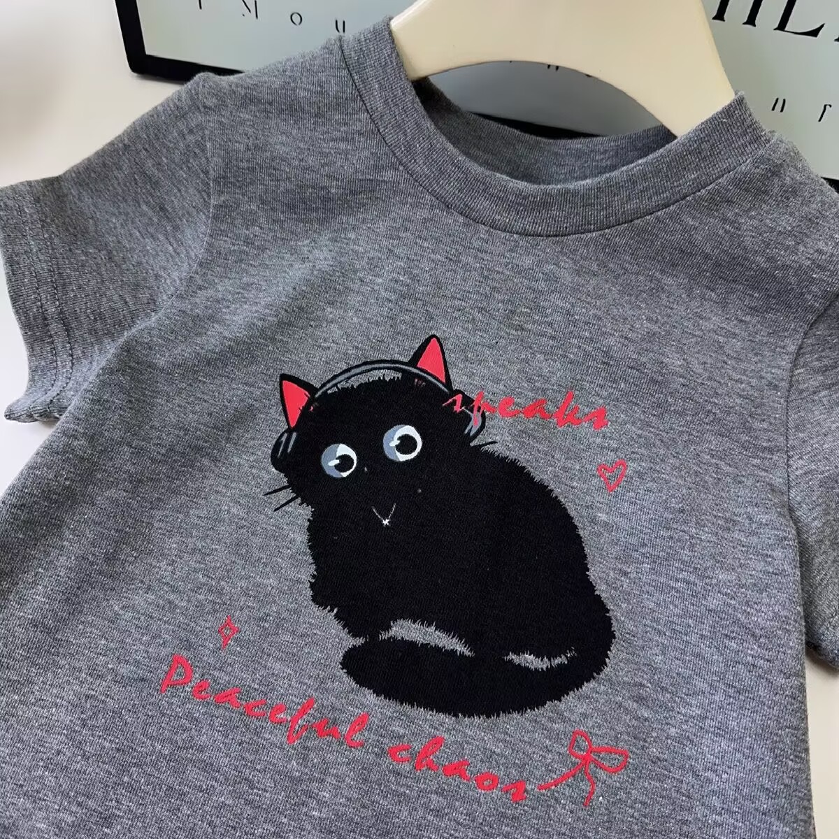 여름 소녀 세트 2025 새로운 만화 고양이 반팔 티셔츠 레이스 컬롯 투피스 크로스 보더 헤어스토어 가기