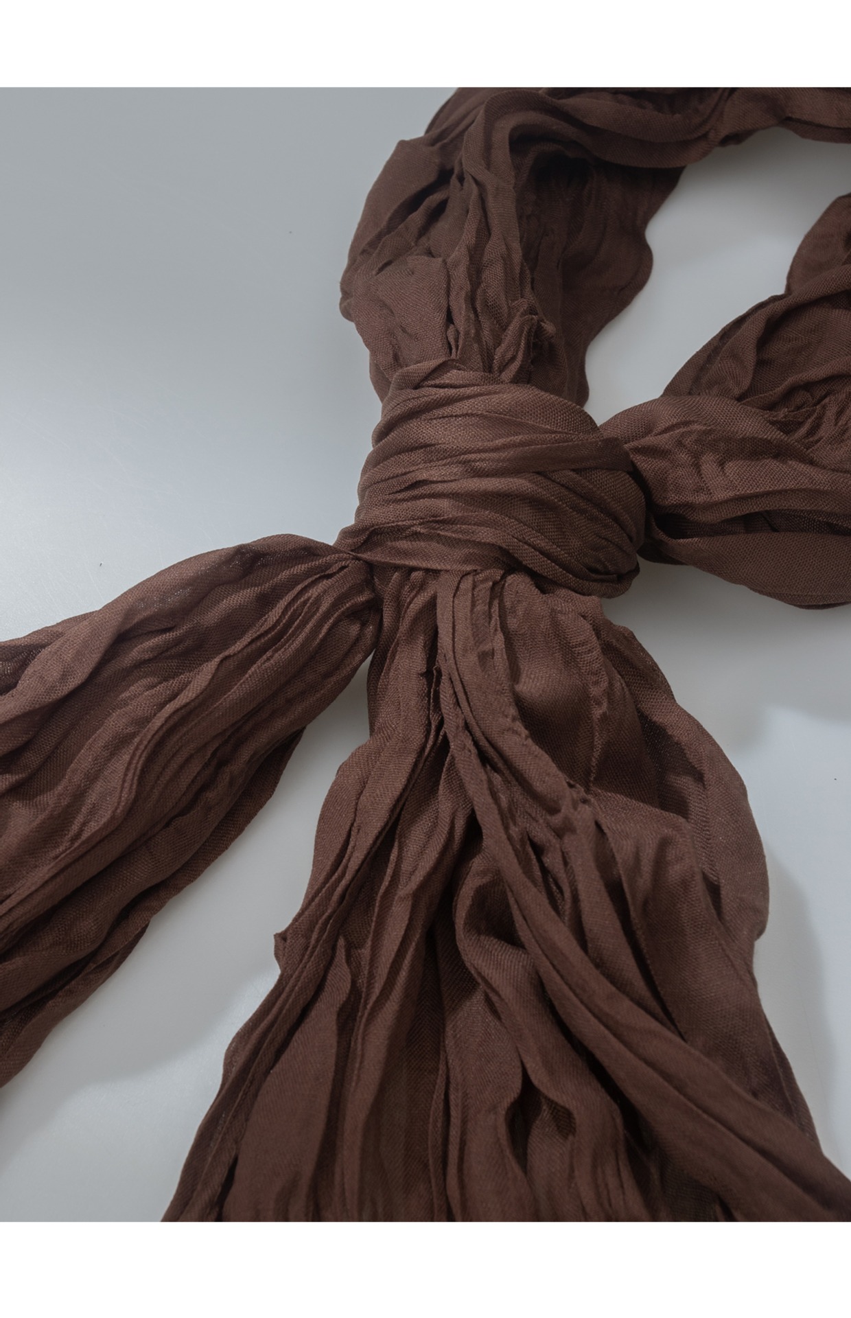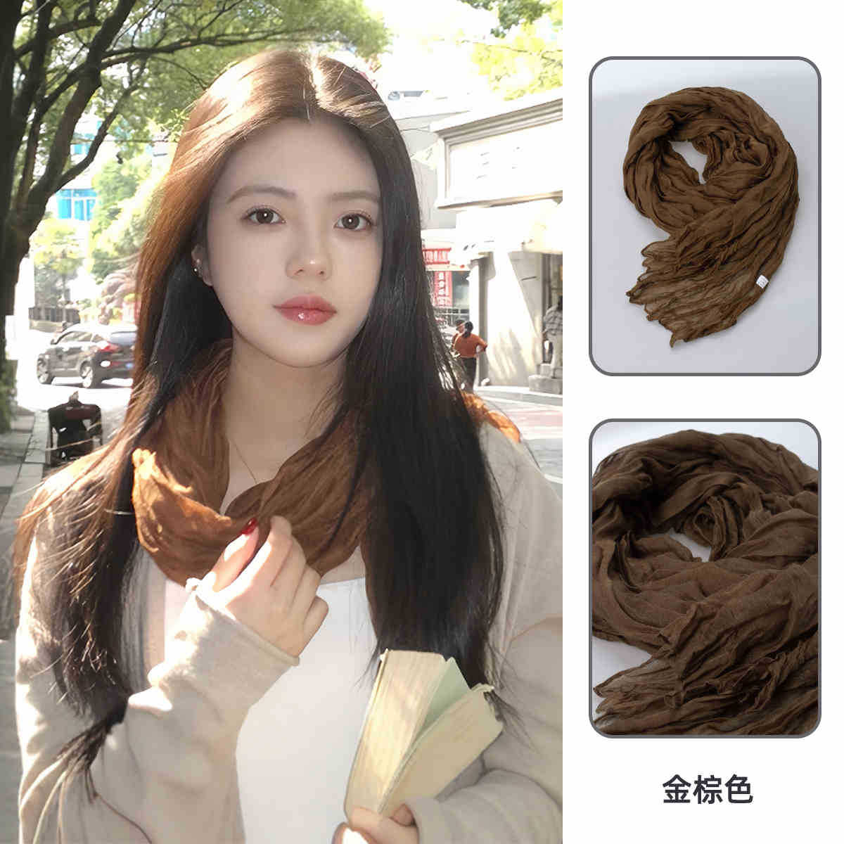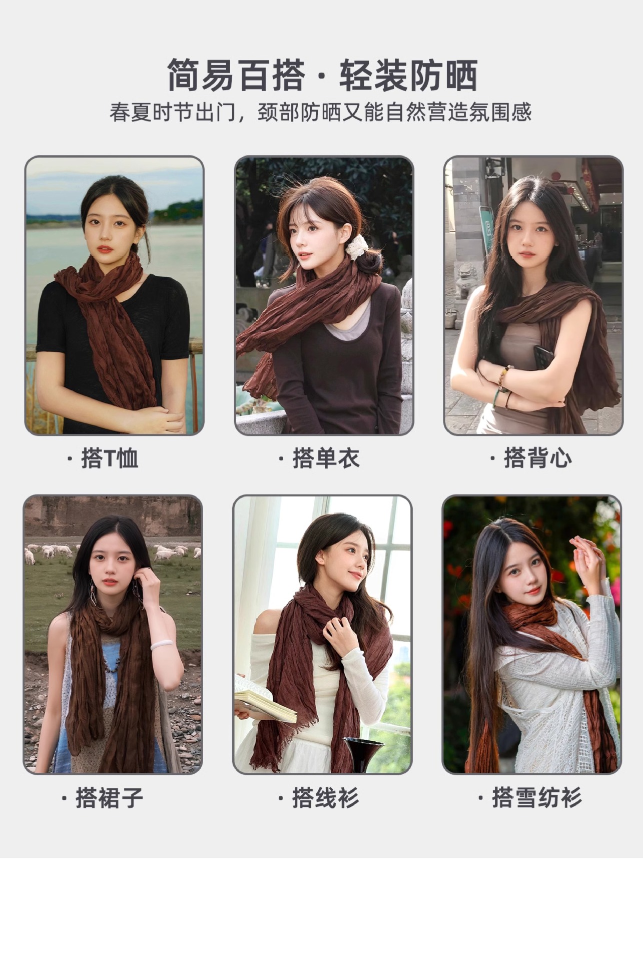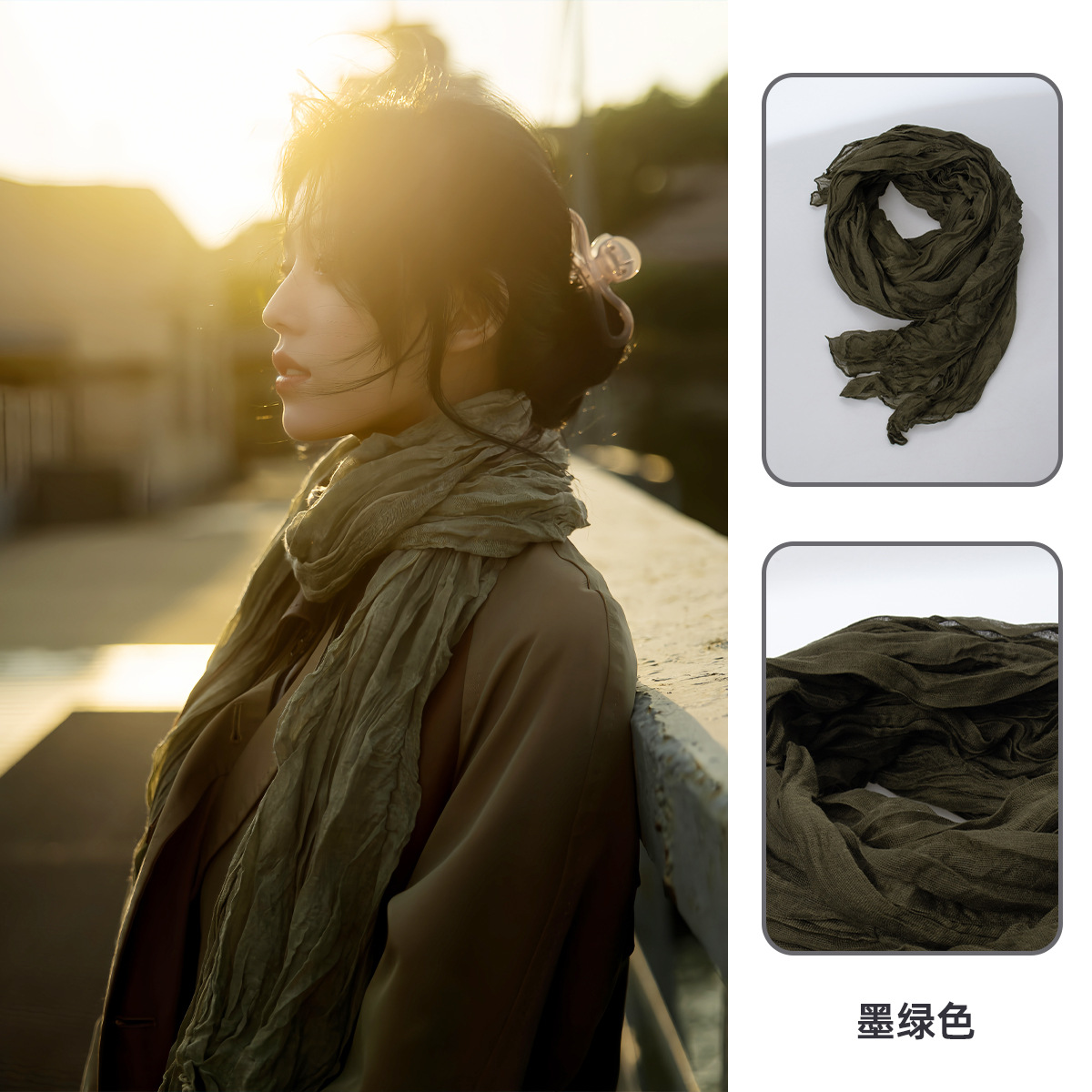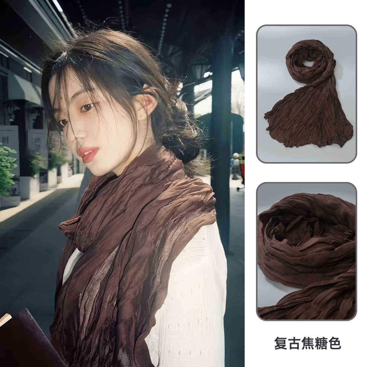 빈티지 코튼 및 리넨 스카프 여성의 2025 년 봄과 여름 예술 다크 브라운 고대 주름 선 스크린 스카프 목 높은 수준의 분위기 감각스토어 가기