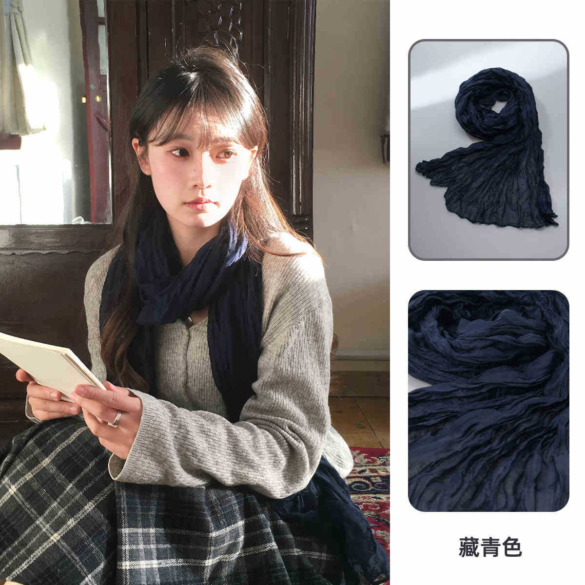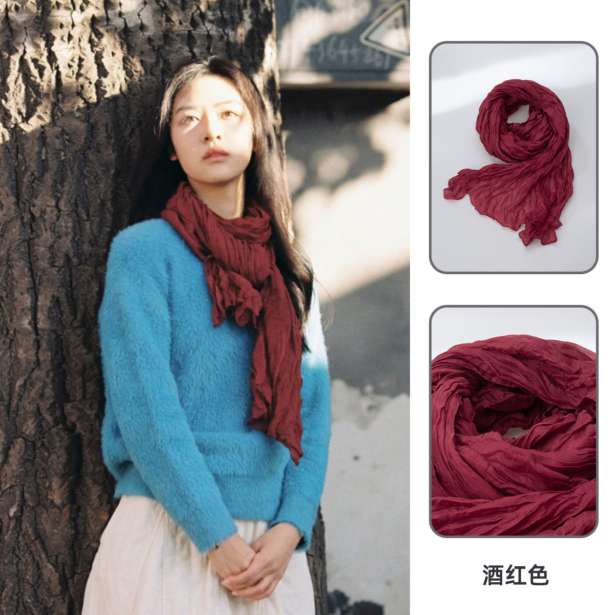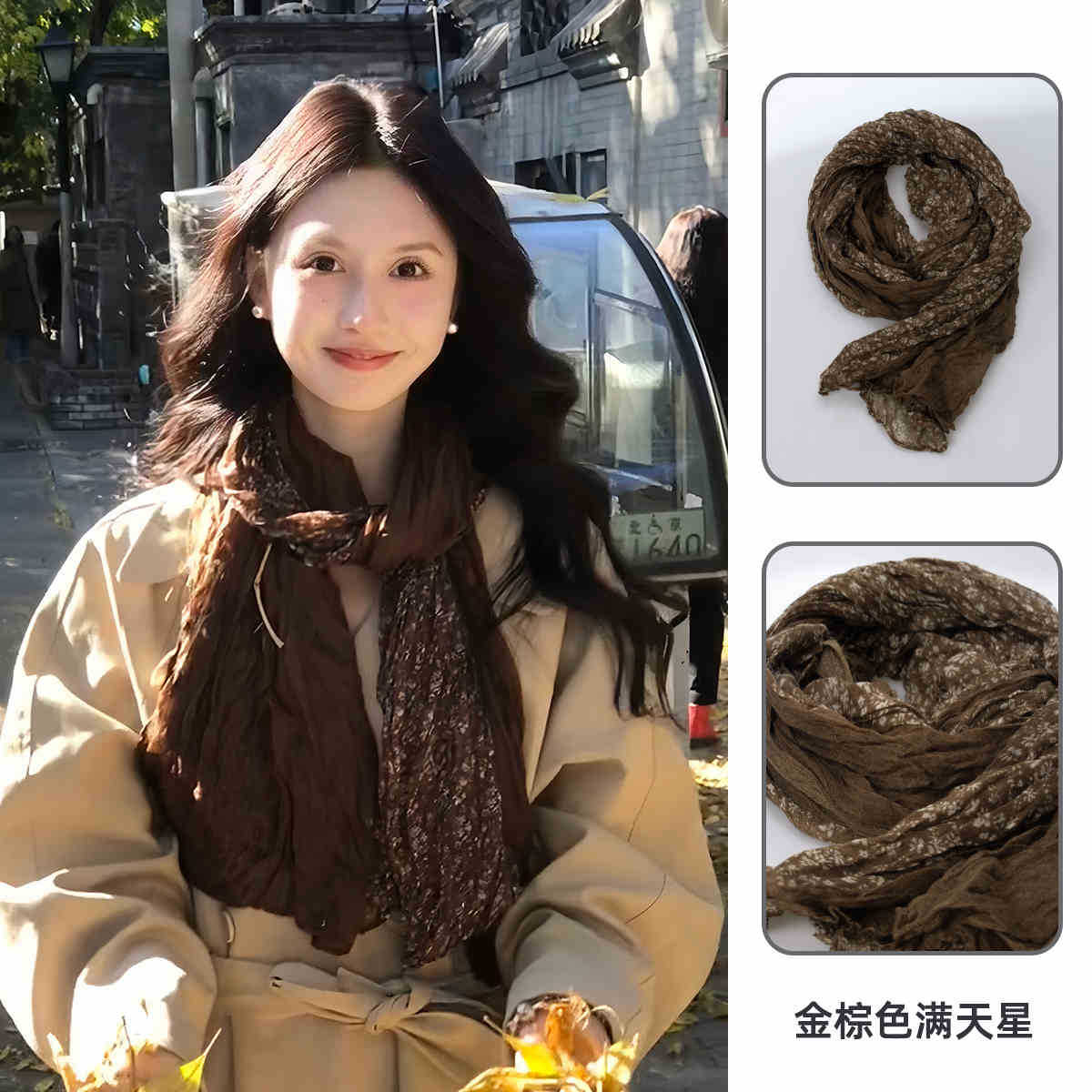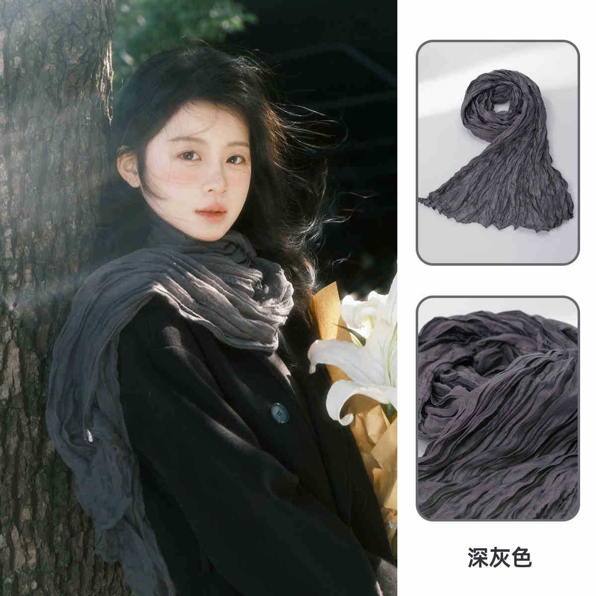 빈티지 코튼 및 리넨 스카프 여성의 2025 년 봄과 여름 예술 다크 브라운 고대 주름 선 스크린 스카프 목 높은 수준의 분위기 감각스토어 가기