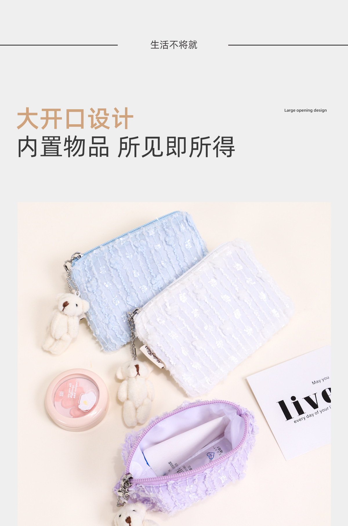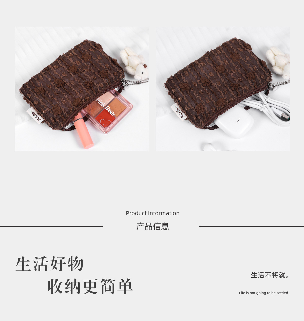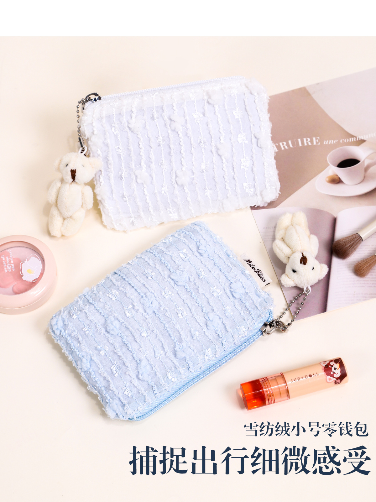한국 스타일 인스타 감성 화장품 가방, 휴대용 외출용 화장품 수납 가방, 곰돌이 펜던트가 달린 쉬폰 벨벳 수납 가방스토어 가기