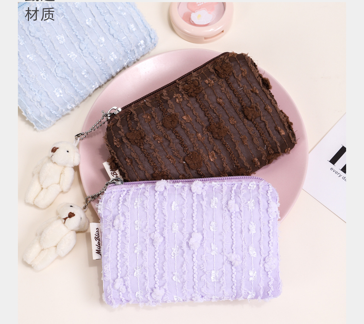 한국 스타일 인스타 감성 화장품 가방, 휴대용 외출용 화장품 수납 가방, 곰돌이 펜던트가 달린 쉬폰 벨벳 수납 가방