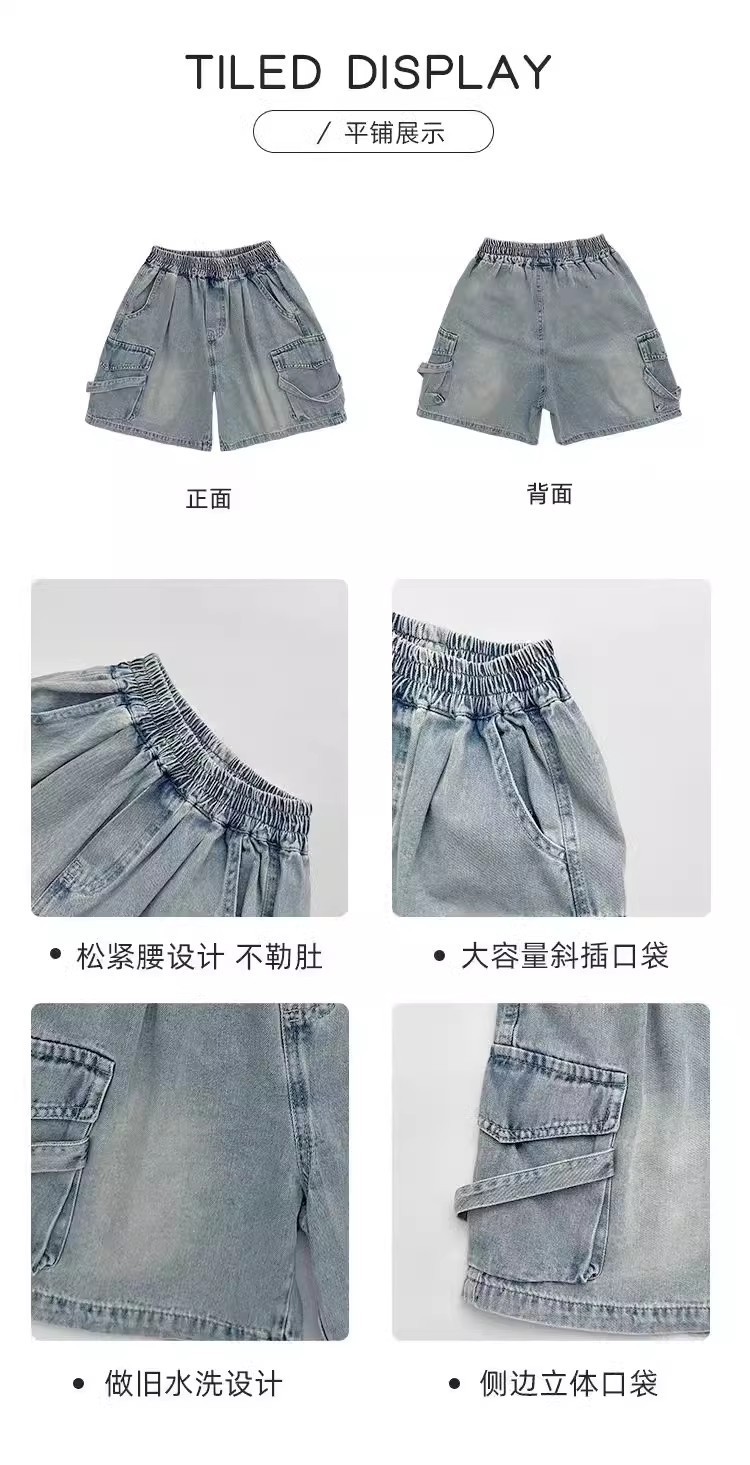 2024 여름 어린이 데님 반바지 유럽과 미국의 복고풍 파란색 스트립 찢어진 소년 아기 유행 5부 바지스토어 가기
