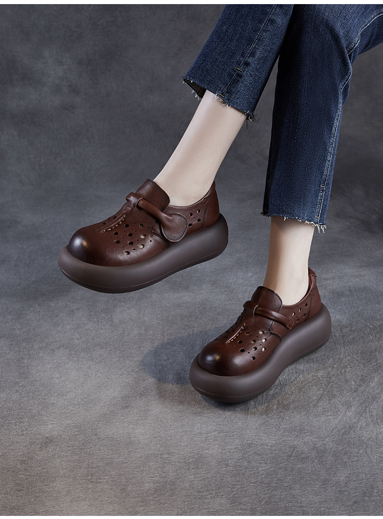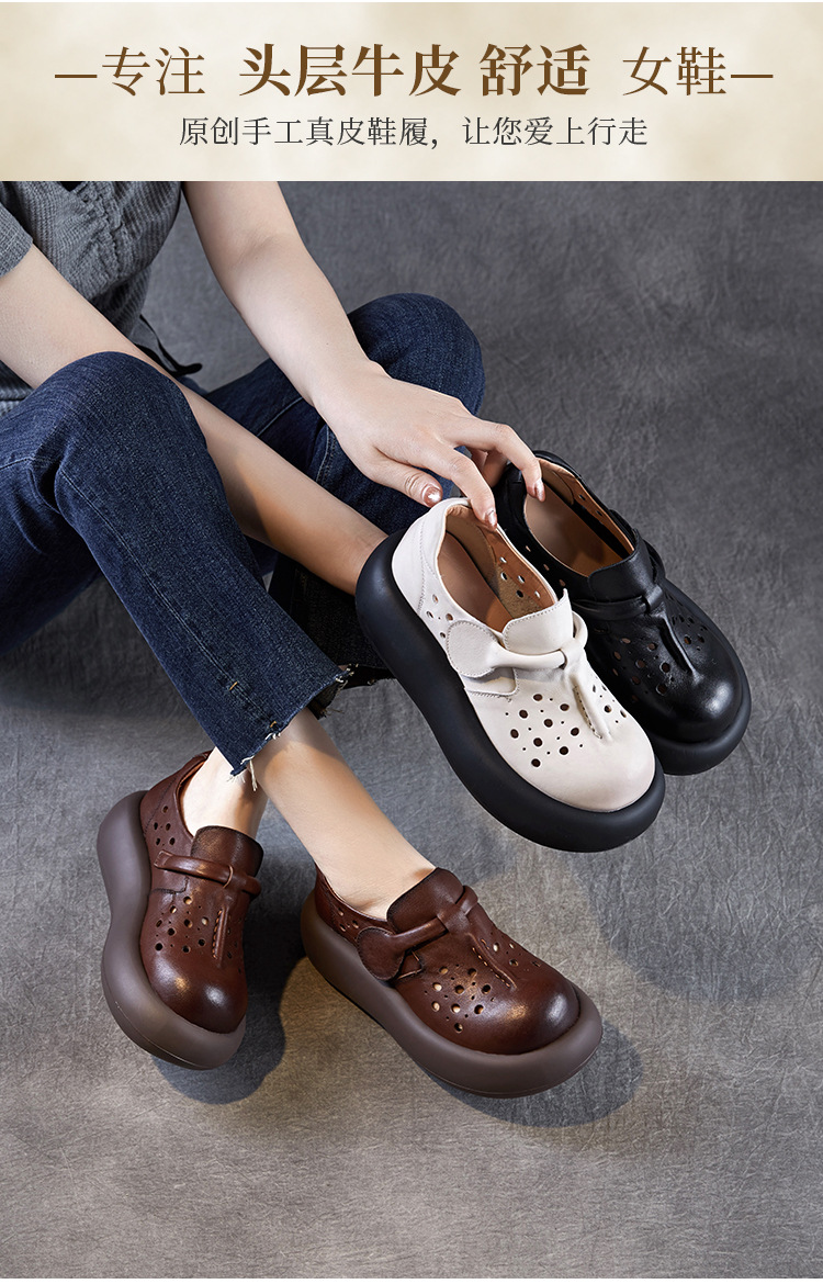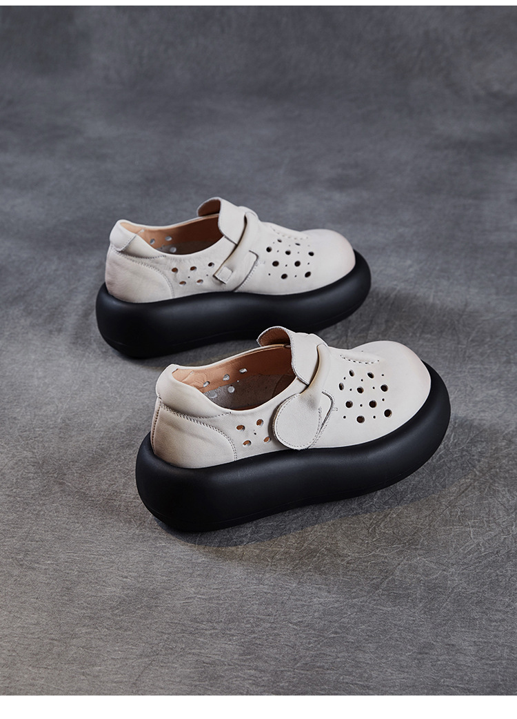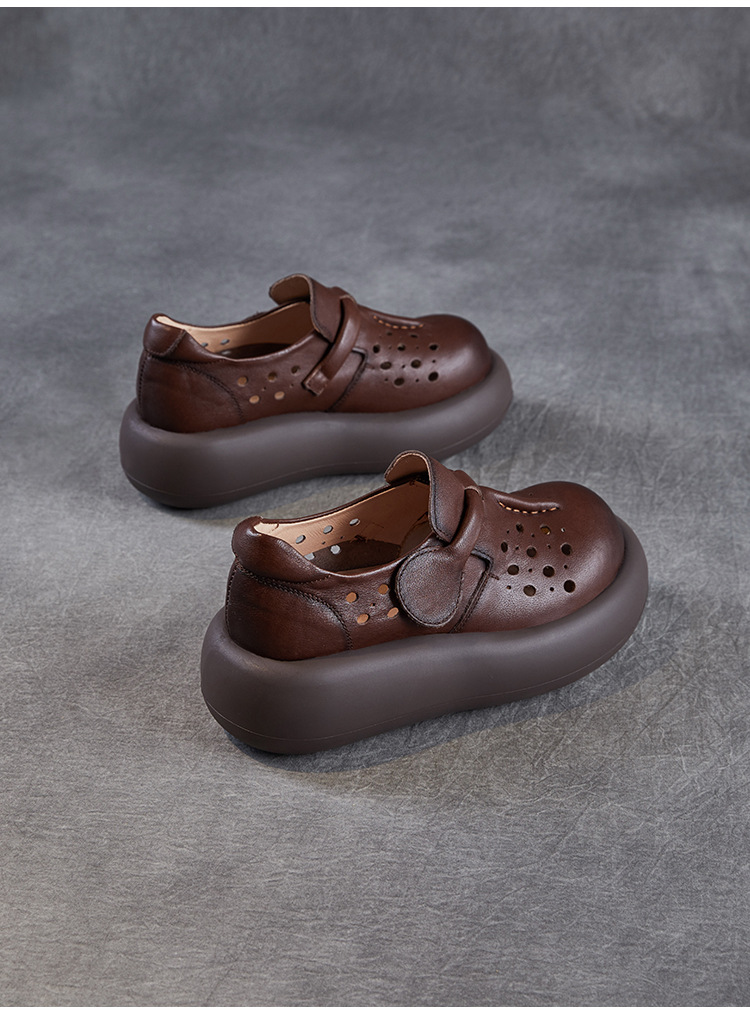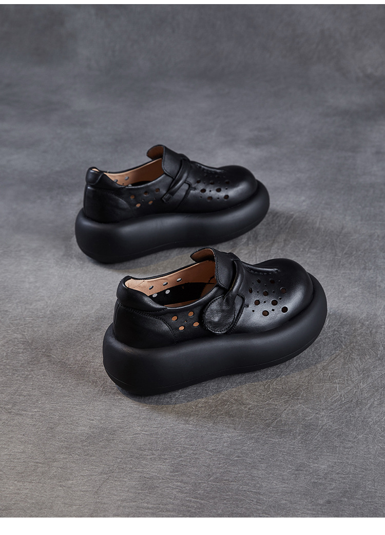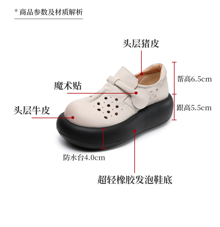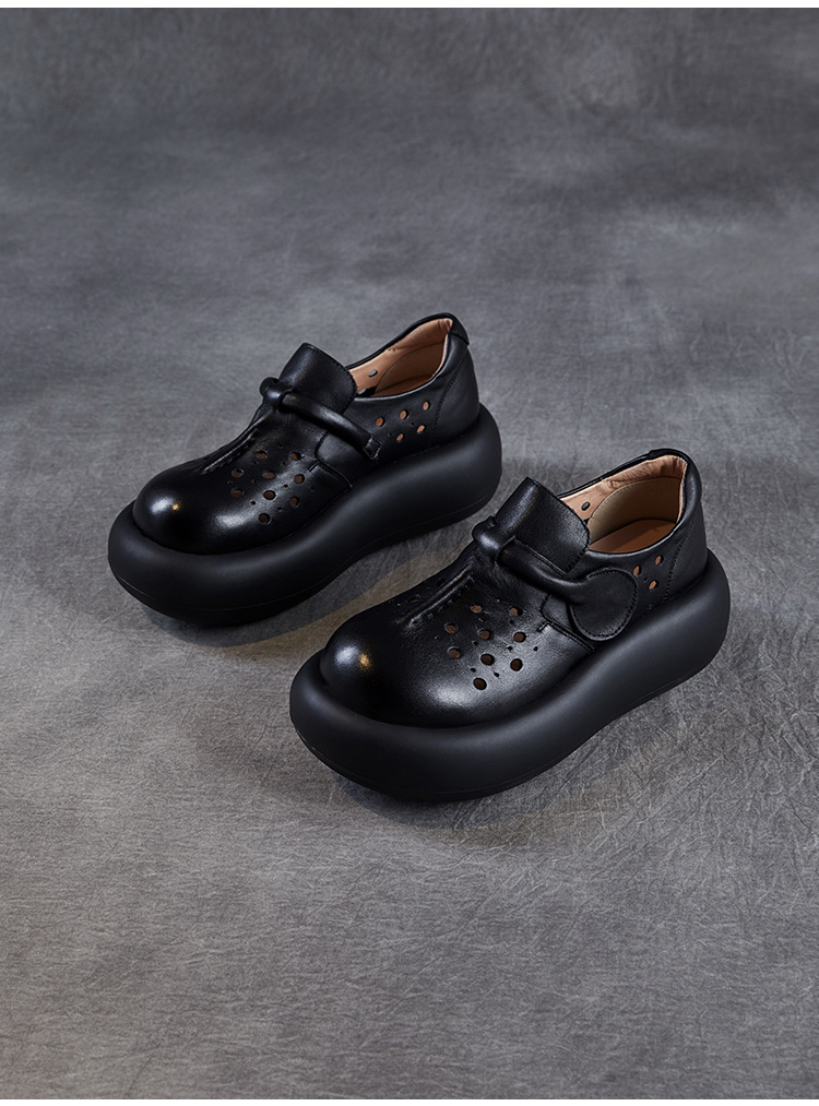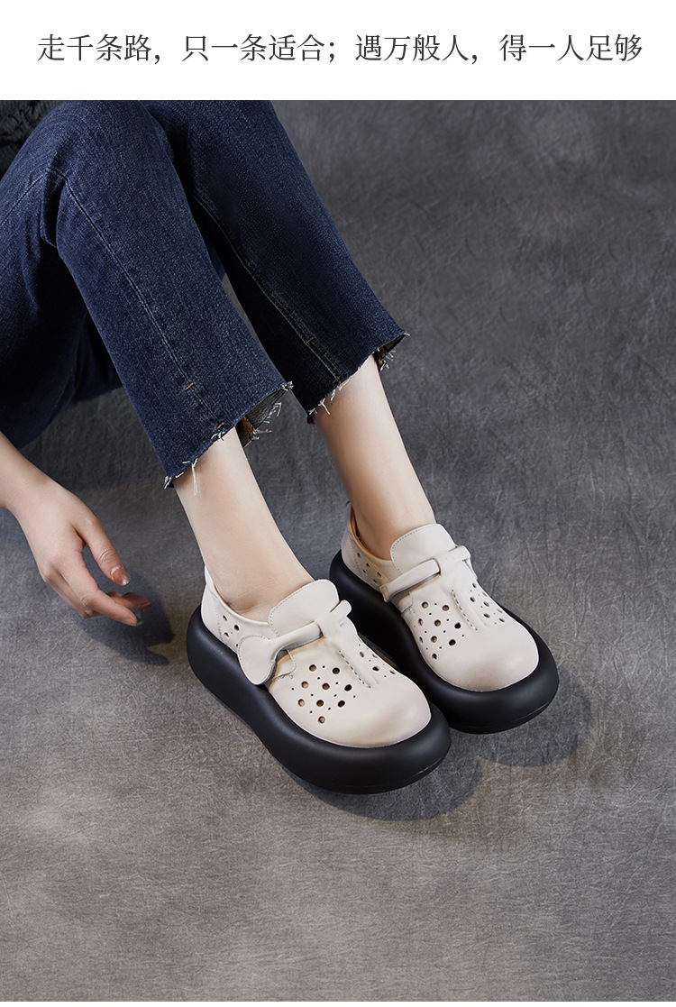 2025 여름 중공 고층 두꺼운 구멍 여성 신발 정품 가죽 귀여운 큰 머리 Cowhide 여성용 샌들