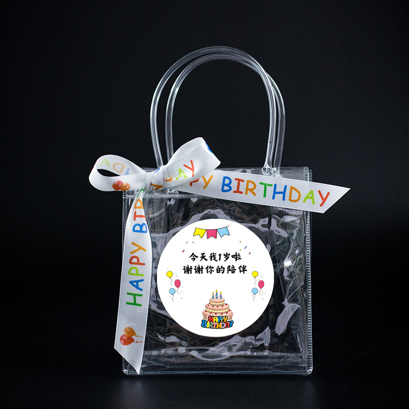 • 빨간 리본 생일 파티 스티커가 달린 투명 가방