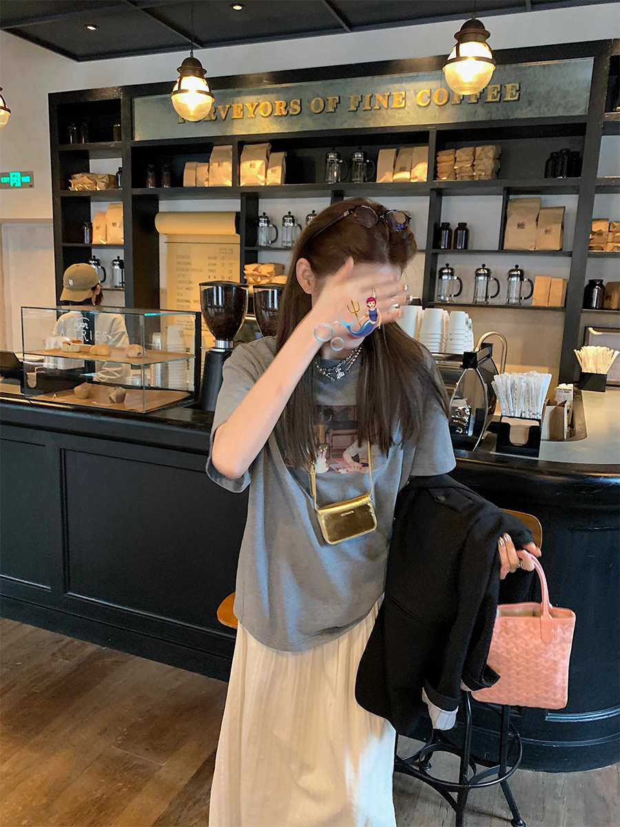 Aaaaxbbb Nine-Cm 안개 3 색 면 인쇄 티셔츠 반소매 올 매치 느슨한 피부 친화적 인 내부 상단