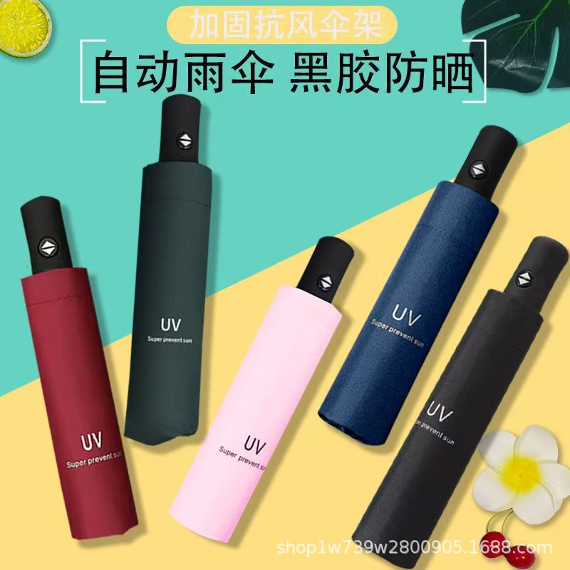 Uv 우산 여성의 높은 수준의 선 스크린 태양 우산 자동 접이식 검은 고무 비와 빛나는 이중 목적 인쇄 로고 광고 우산스토어 가기