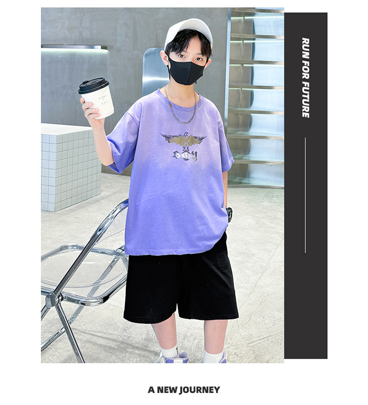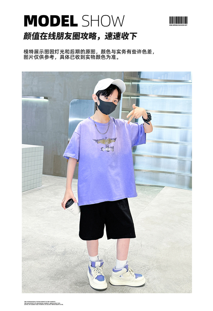 남아 여름 반팔 양복, 얇은 티셔츠, 5부 바지, 투피스 세트, 2025 새로운 스타일, 중대형 아동복 트렌드스토어 가기