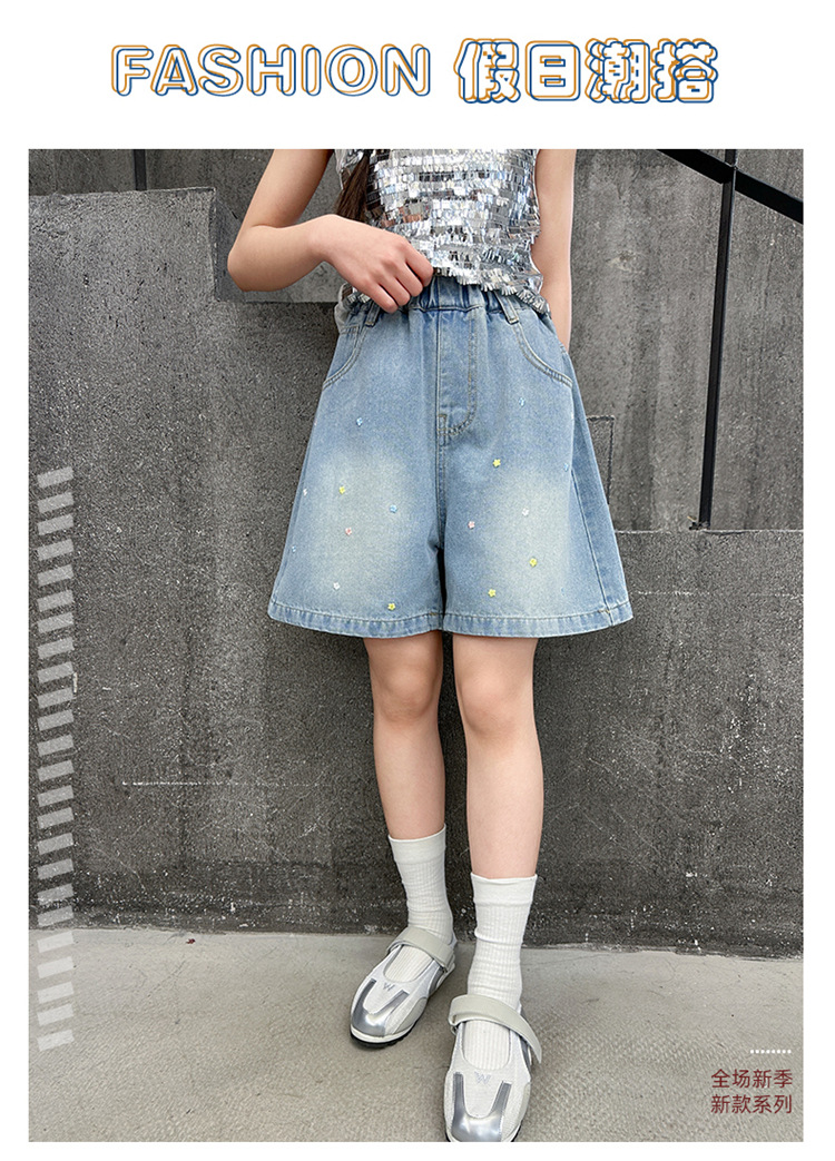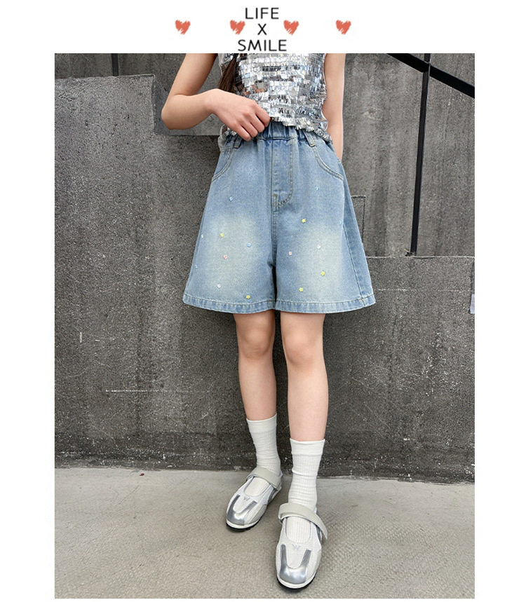여아용 자수 데님 반바지, 여아용 중대형 아동용 2025 여름 새 스타일 루즈핏 청바지 반바지스토어 가기