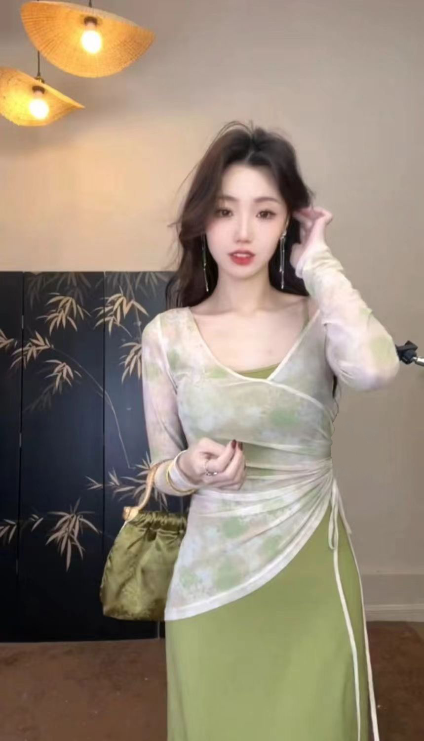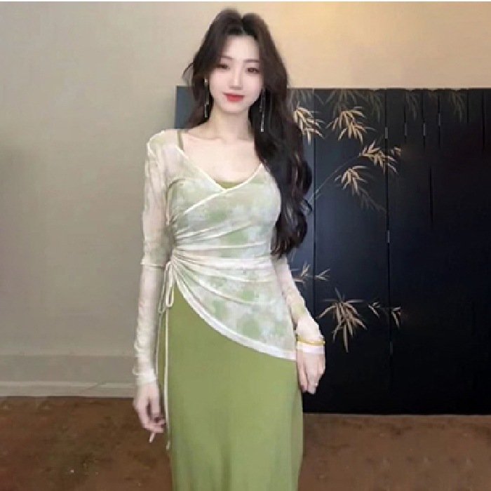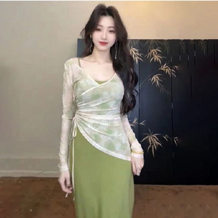 새로운 중국 스타일 국가 스타일 원피스 여성의 봄 긴팔 블라우스 녹색 우아한 분할 슬링 슬림 핏 원피스 긴 원피스스토어 가기