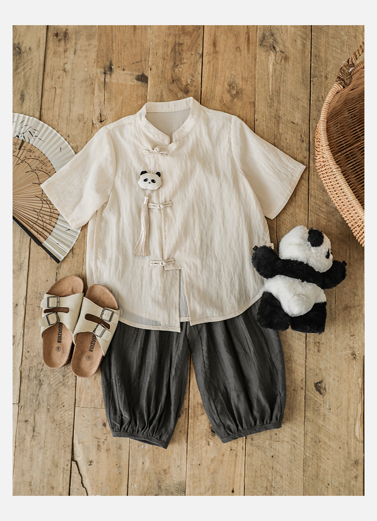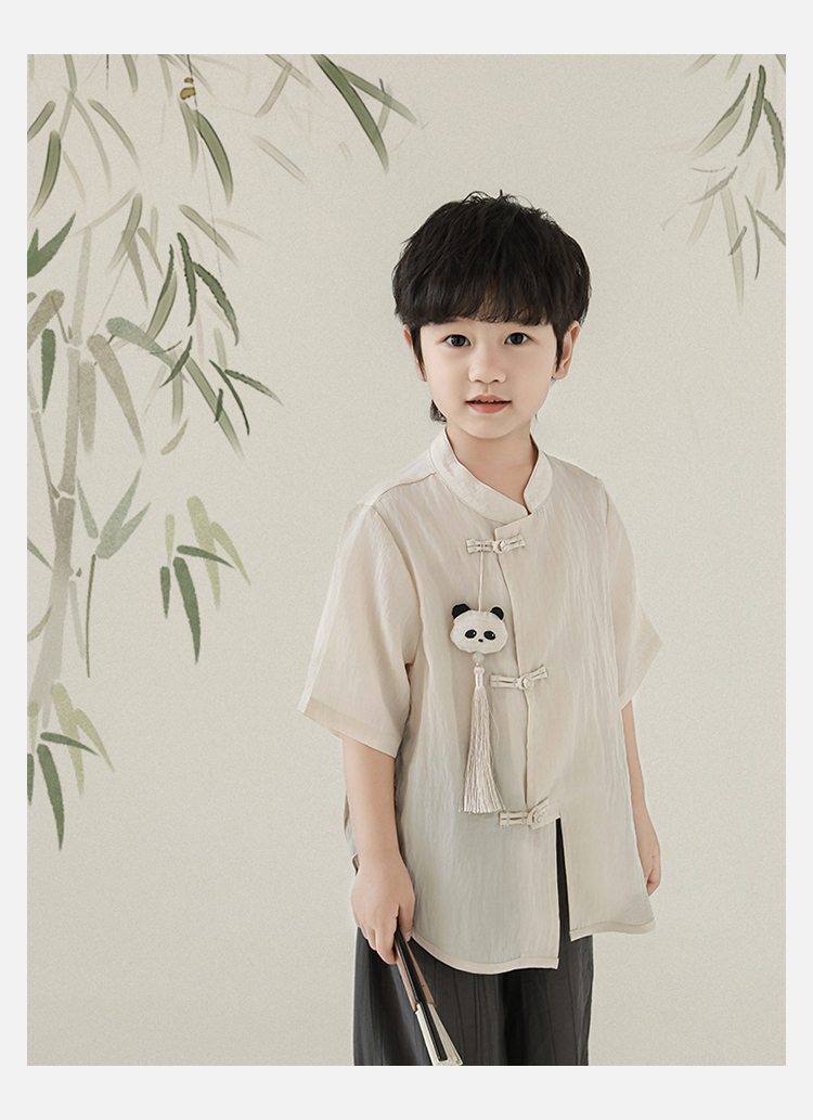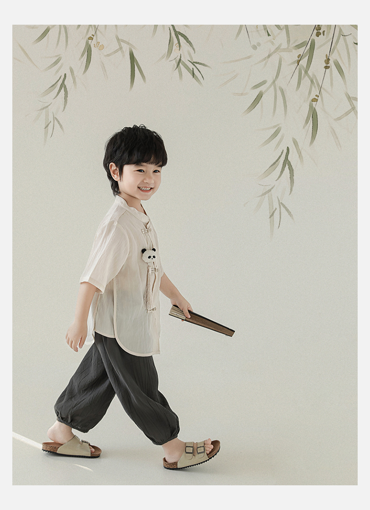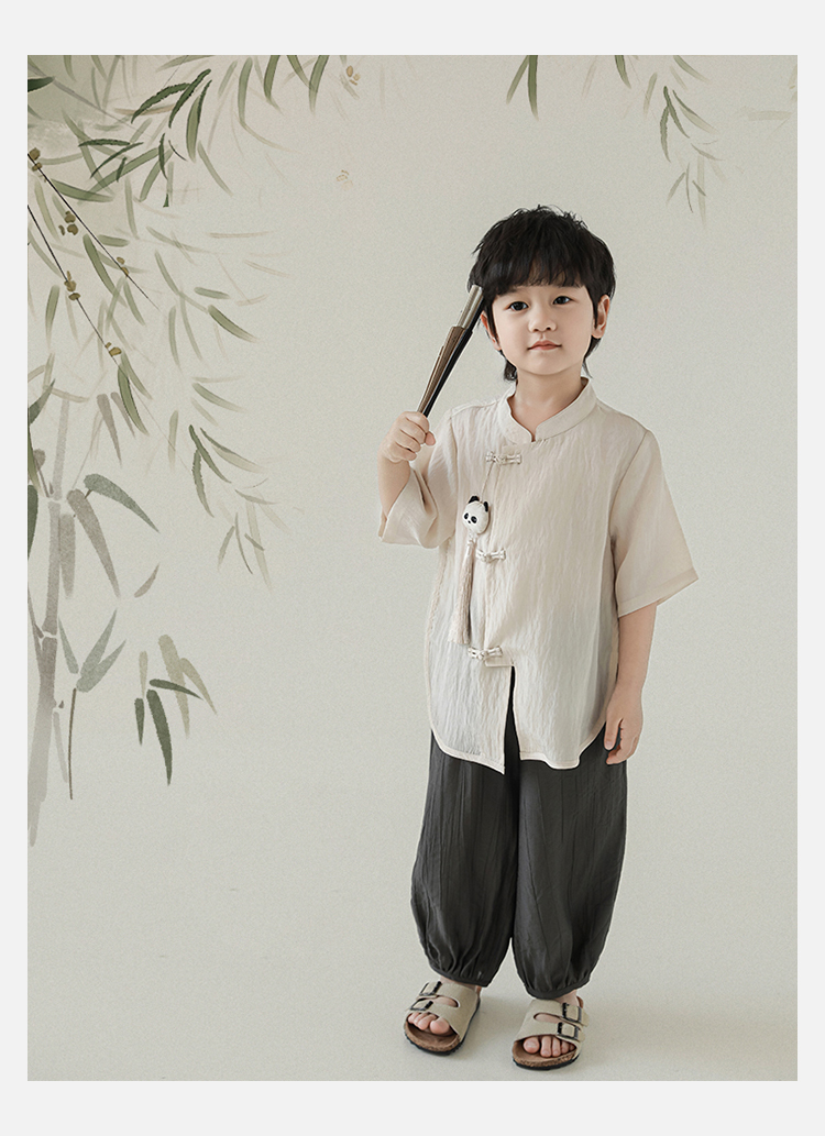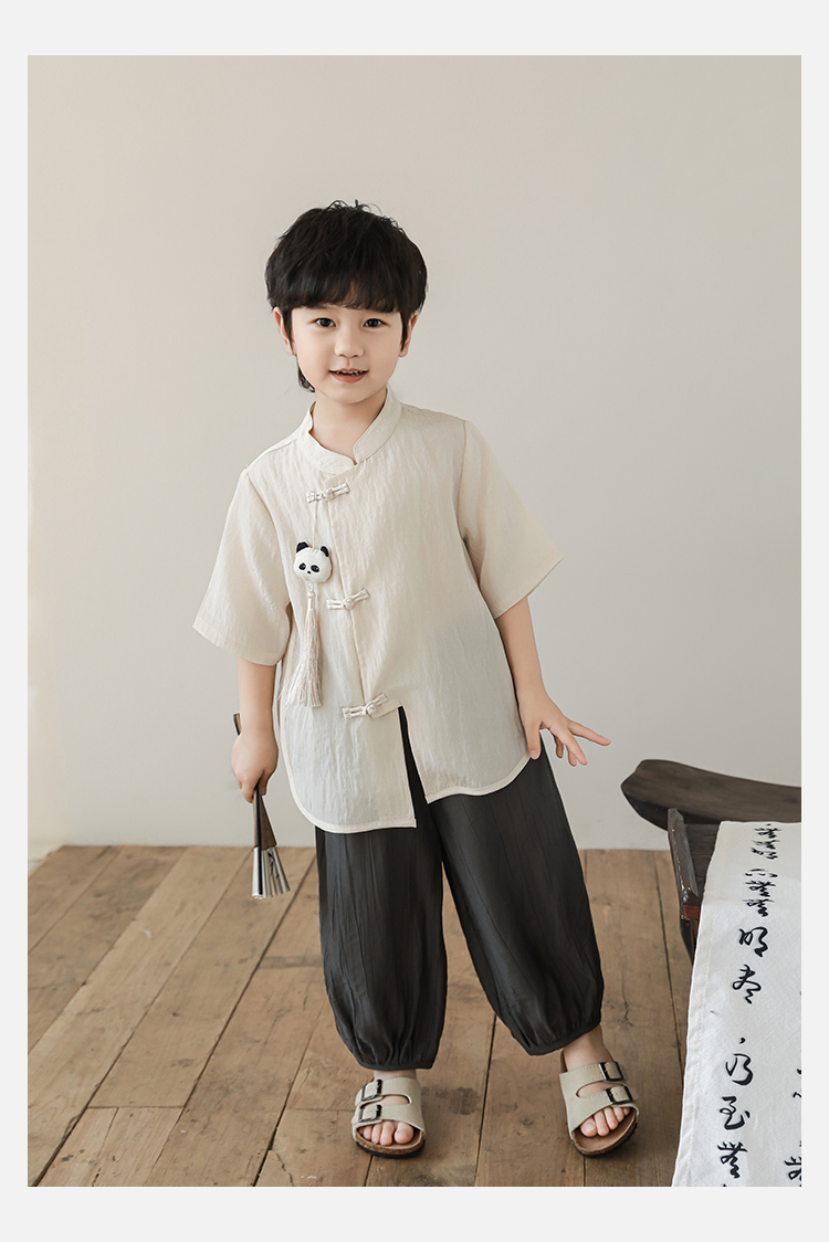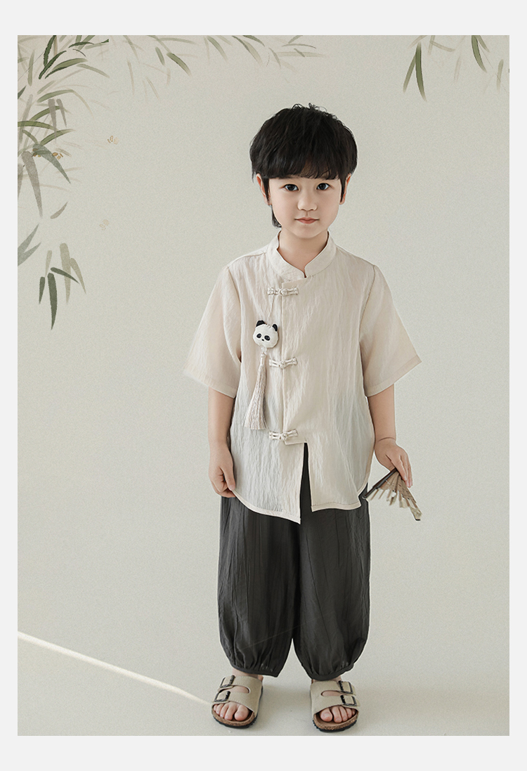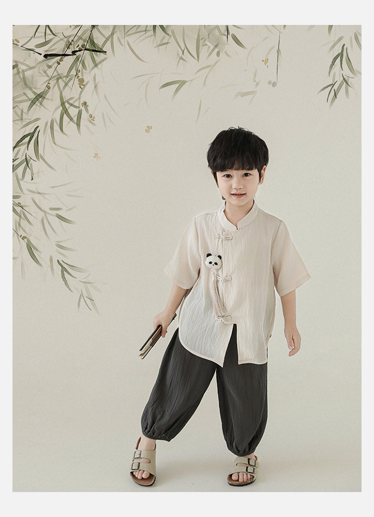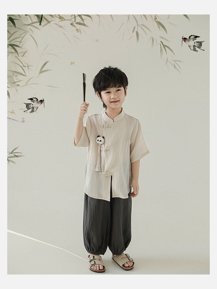 2025 년 여름 새로운 중국 스탠드 칼라 팬더 짧은 소매 셔츠 느슨한 캐주얼 바지 세트 소년