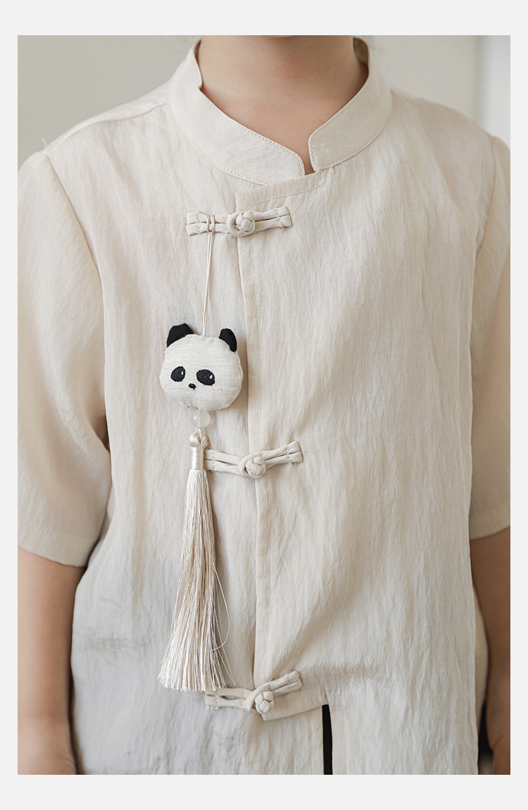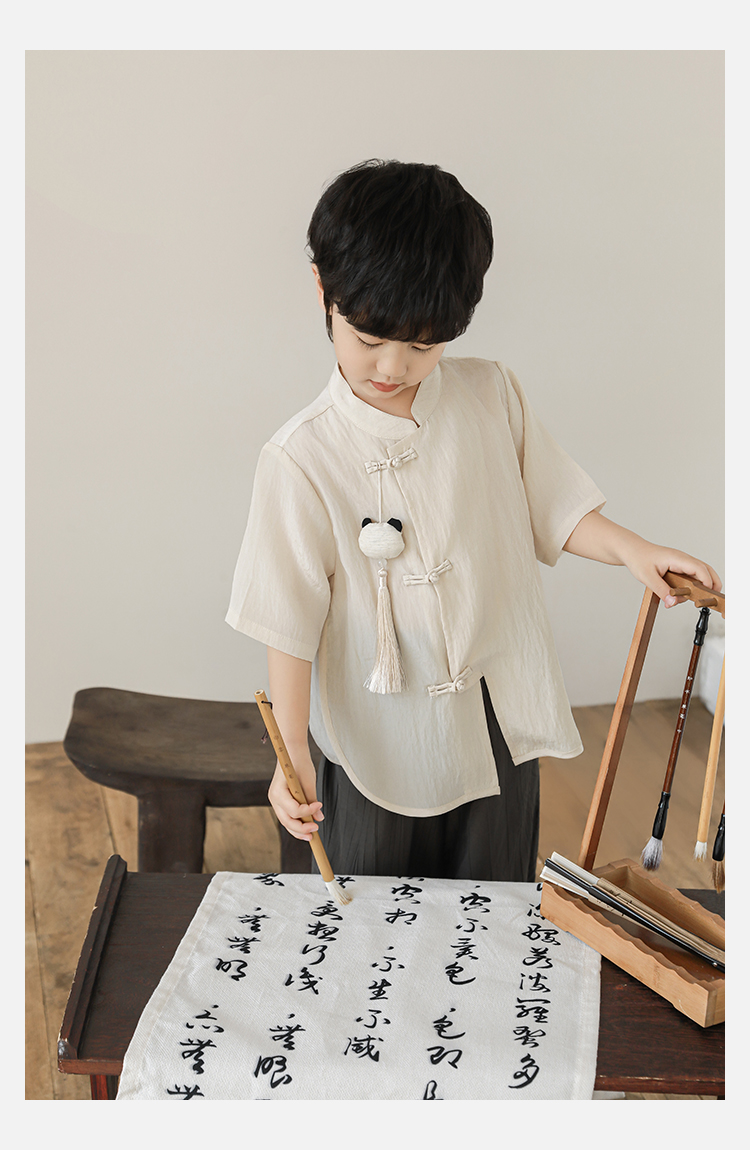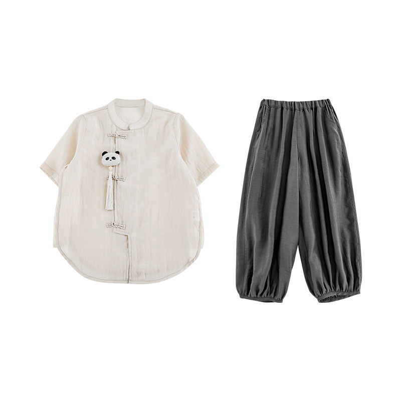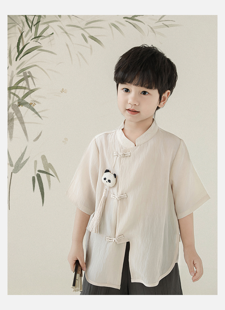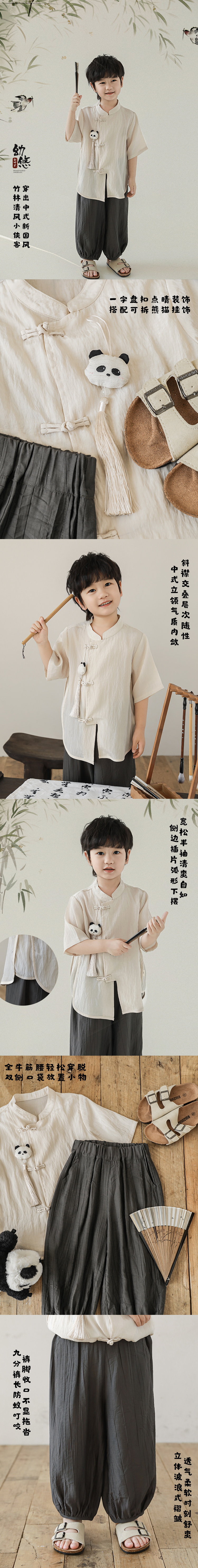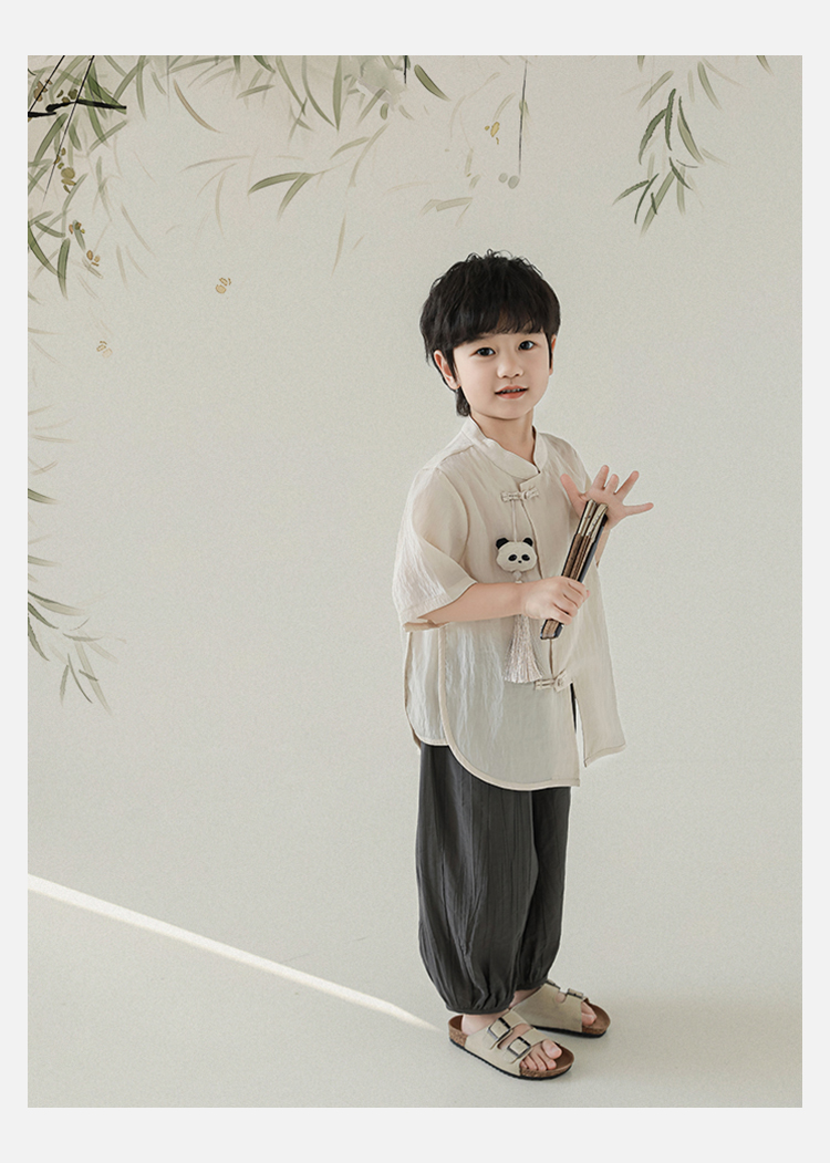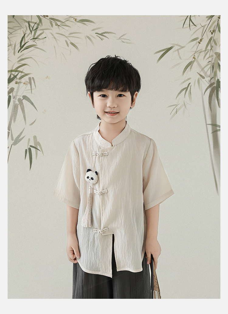 2025 년 여름 새로운 중국 스탠드 칼라 팬더 짧은 소매 셔츠 느슨한 캐주얼 바지 세트 소년