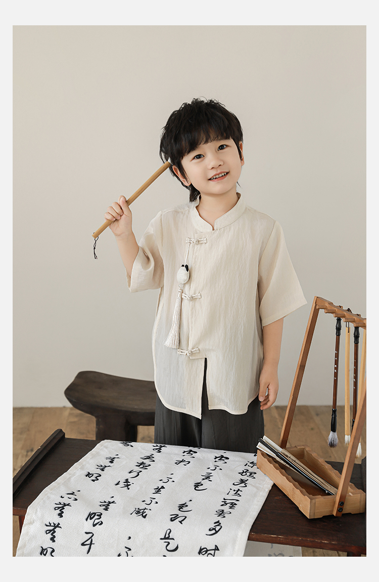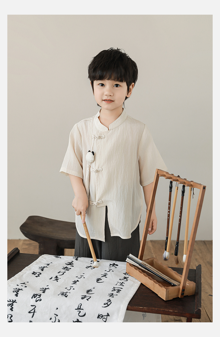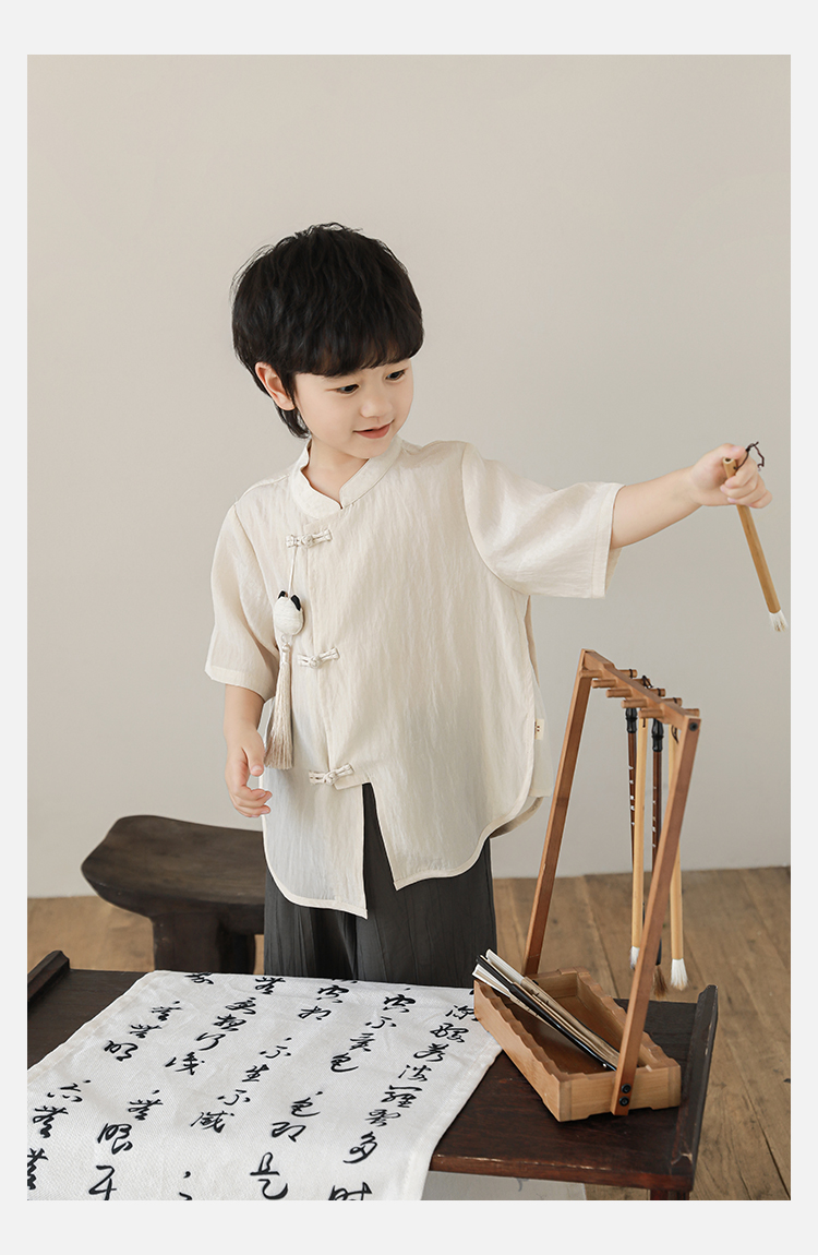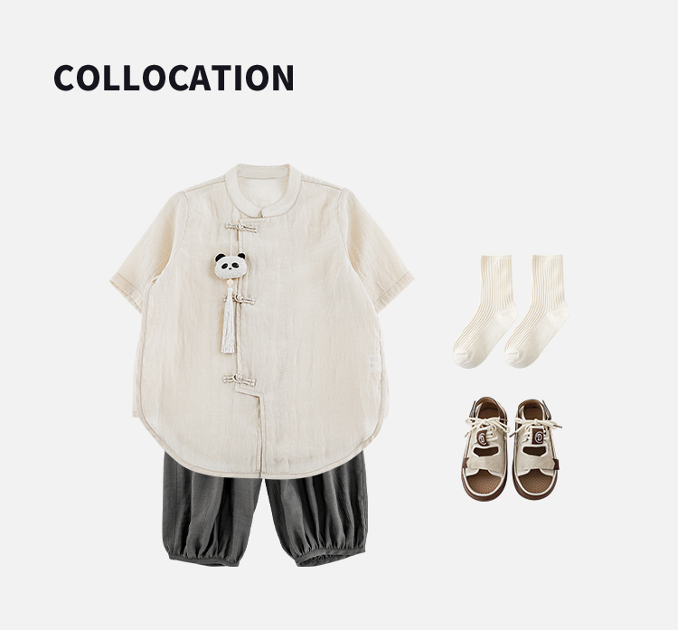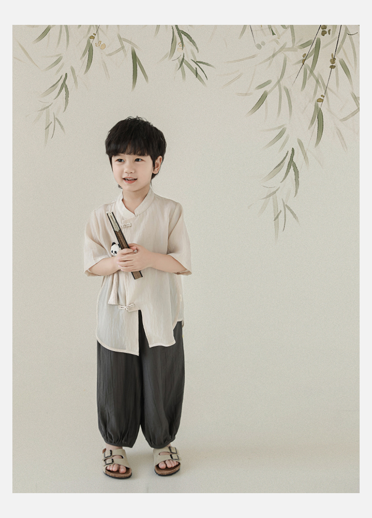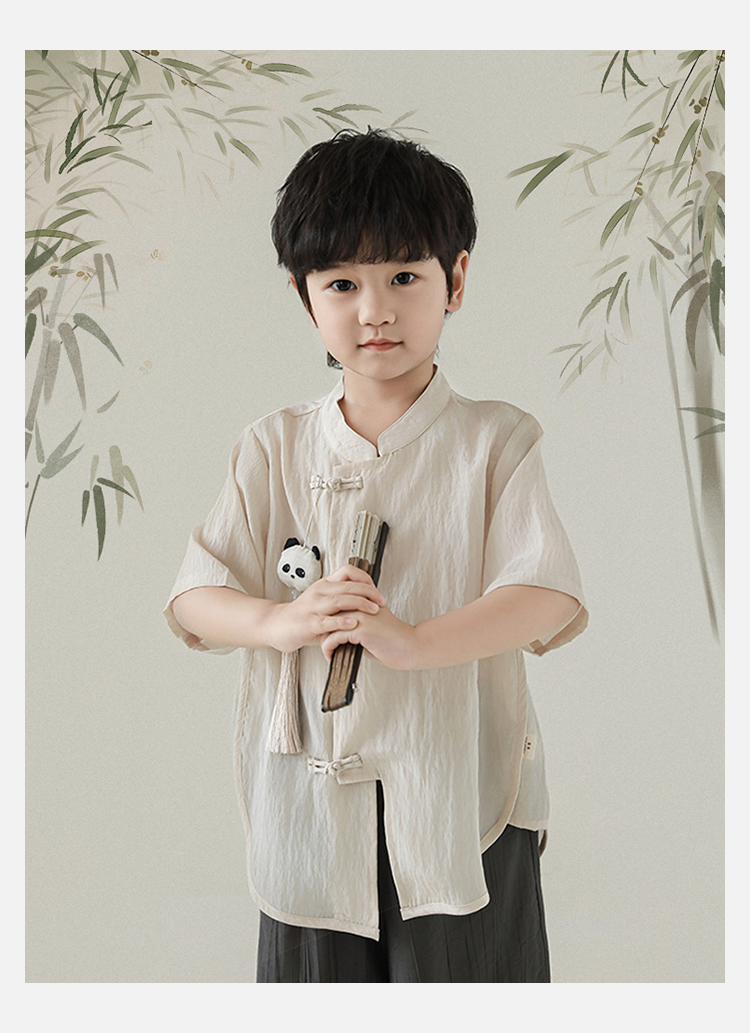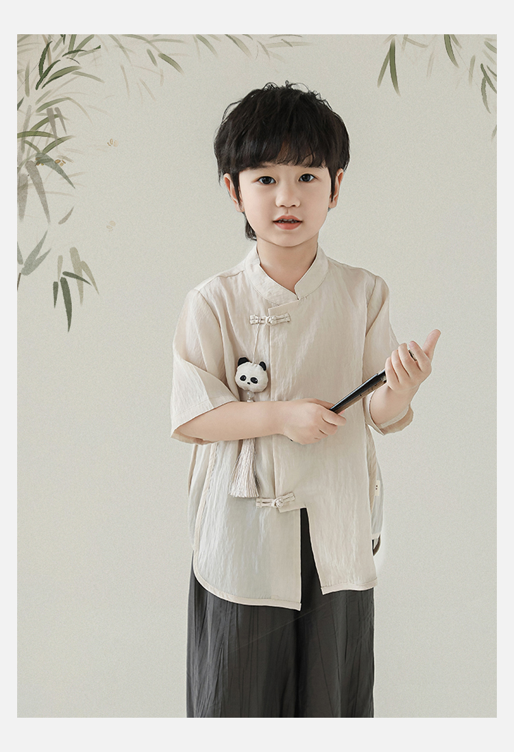 2025 년 여름 새로운 중국 스탠드 칼라 팬더 짧은 소매 셔츠 느슨한 캐주얼 바지 세트 소년