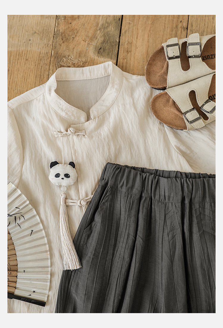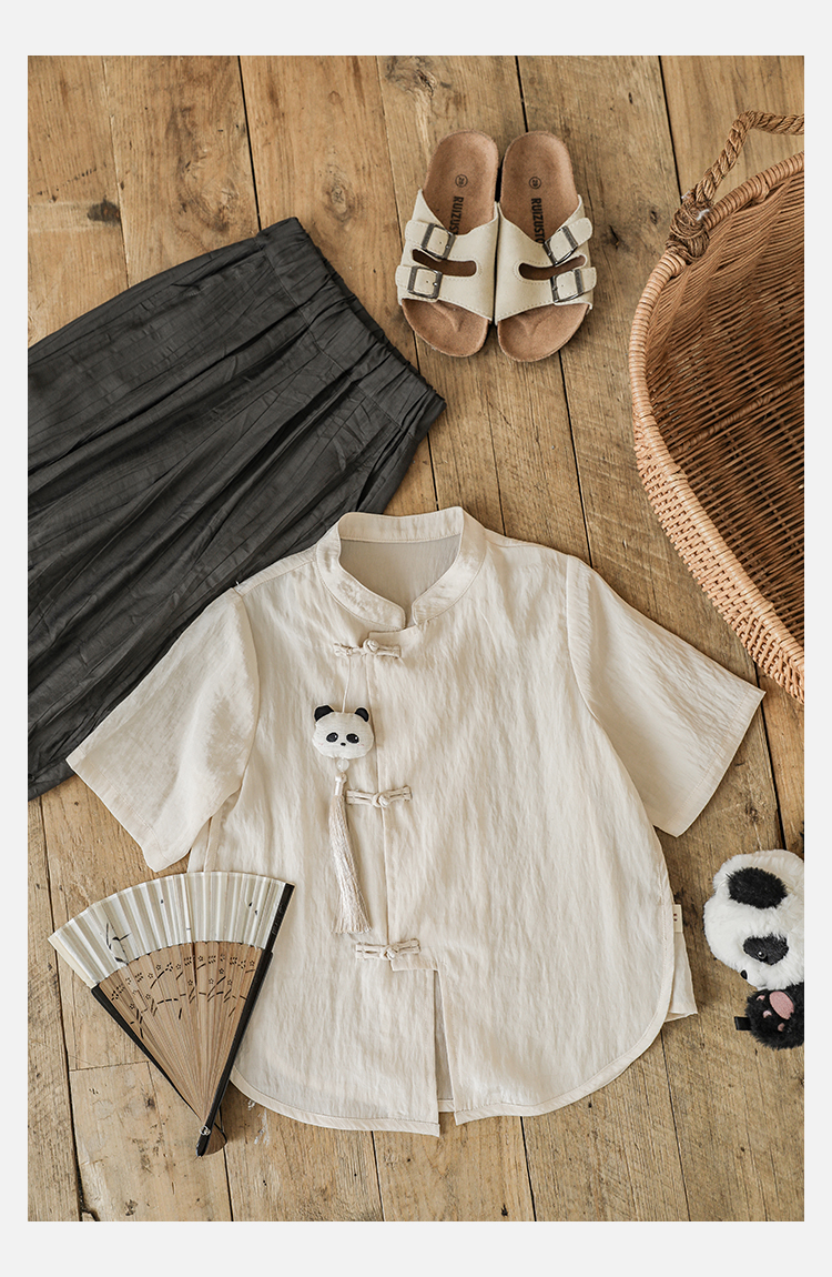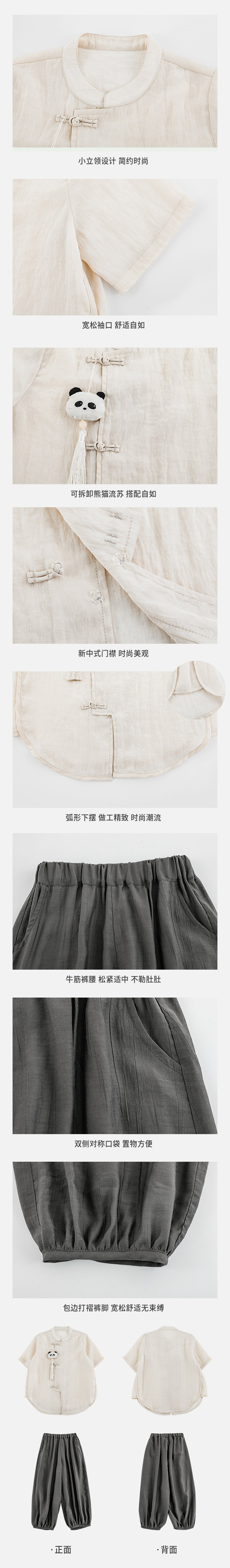 2025 년 여름 새로운 중국 스탠드 칼라 팬더 짧은 소매 셔츠 느슨한 캐주얼 바지 세트 소년스토어 가기