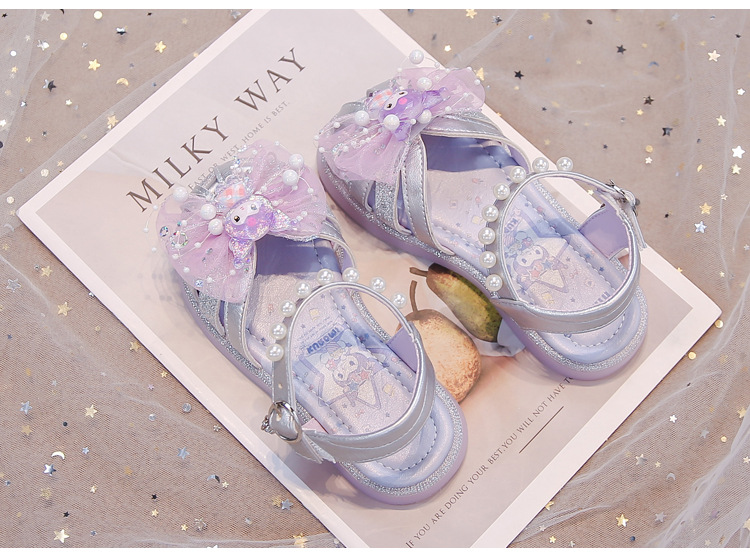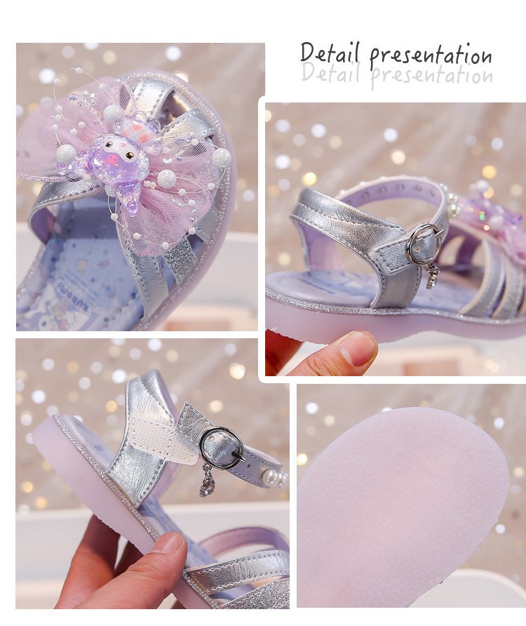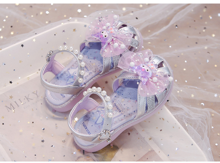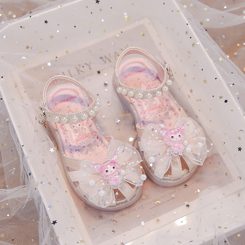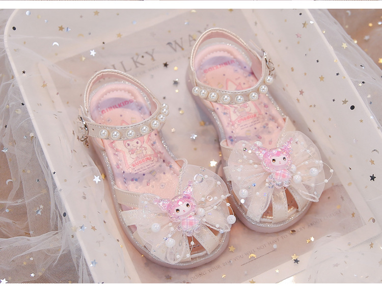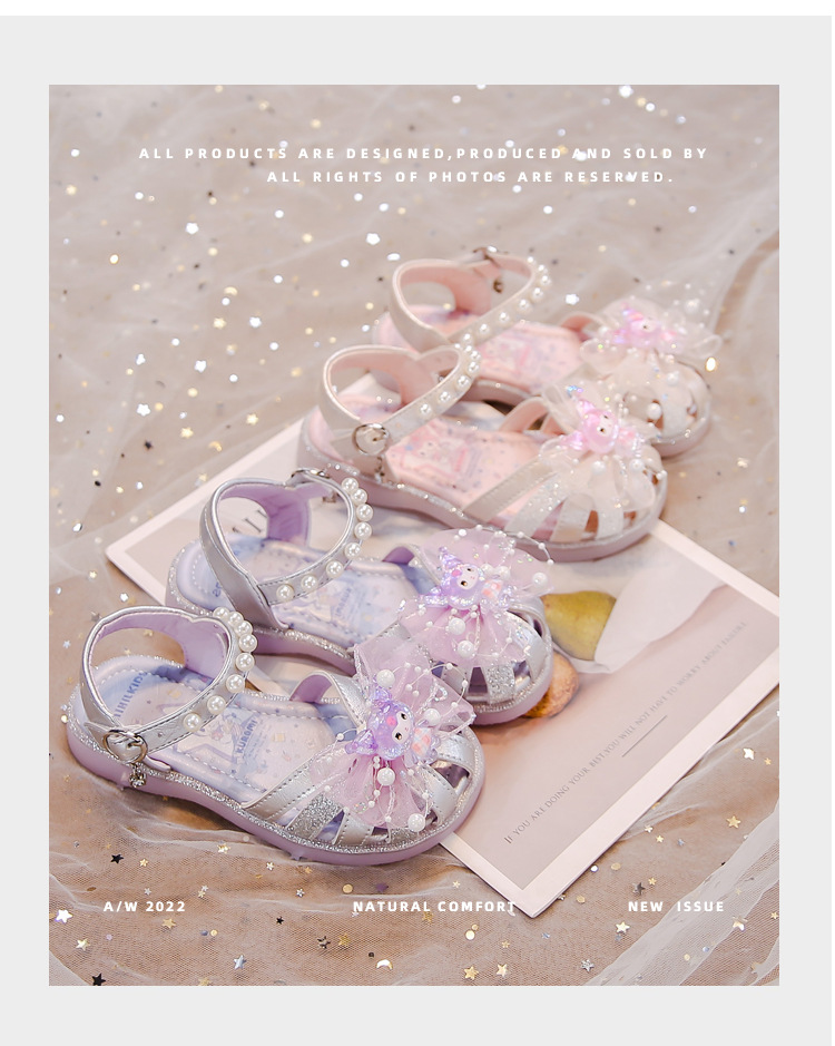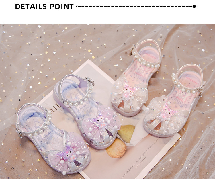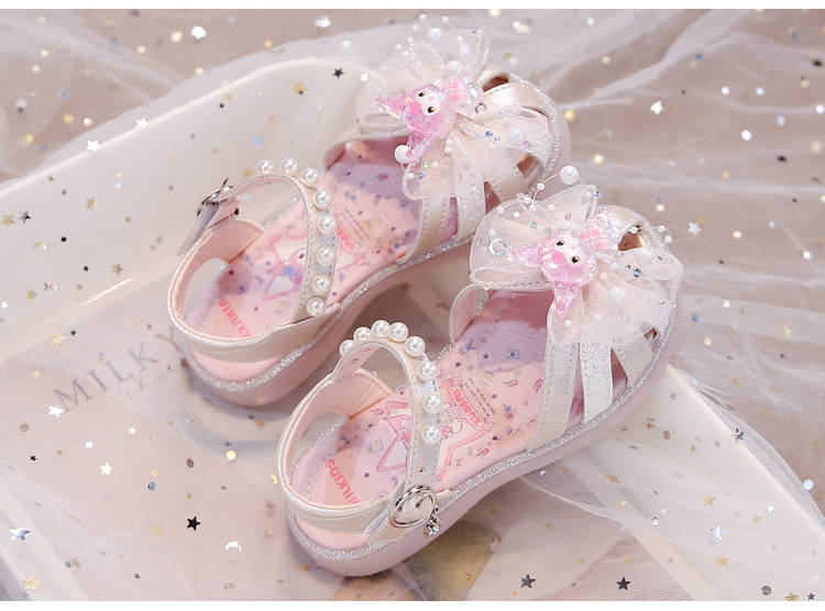 소녀 발가락 샌들 2025 여름 새로운 도착 메쉬 활 귀여운 만화 인형 진주 중공 샌들스토어 가기