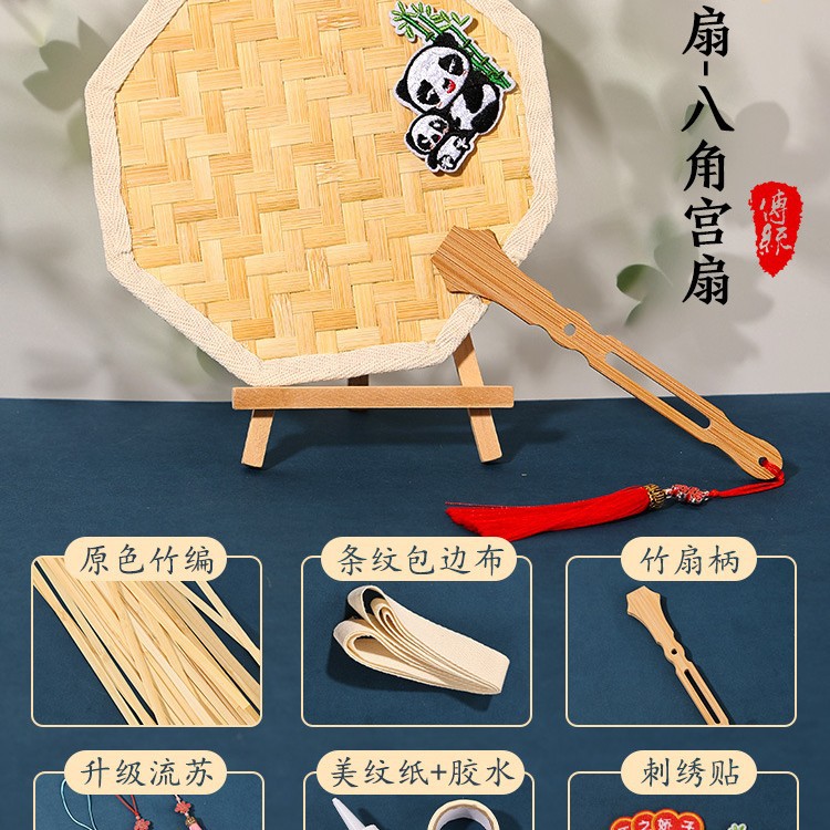 • 팔각형 팬더 자수-대나무 부채 소재 패키지 [중공 부채 손잡이 + 옥 술]