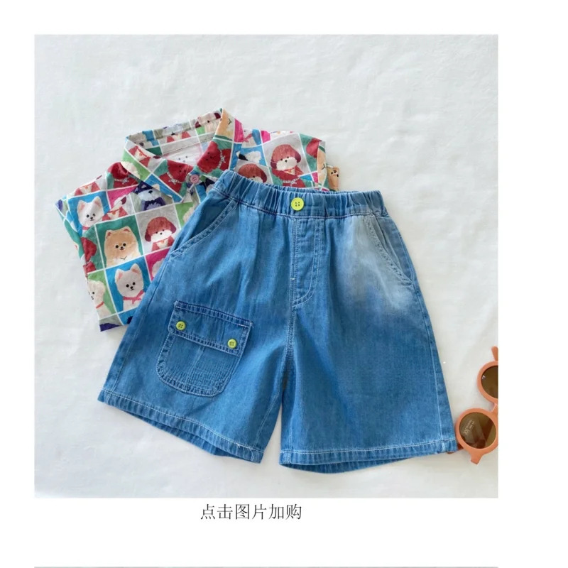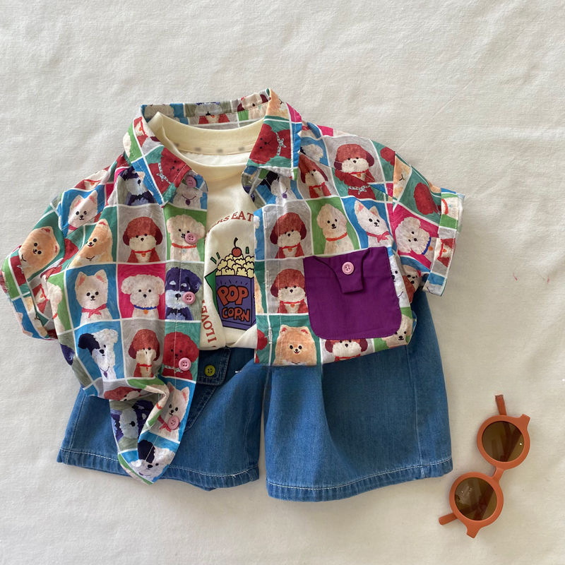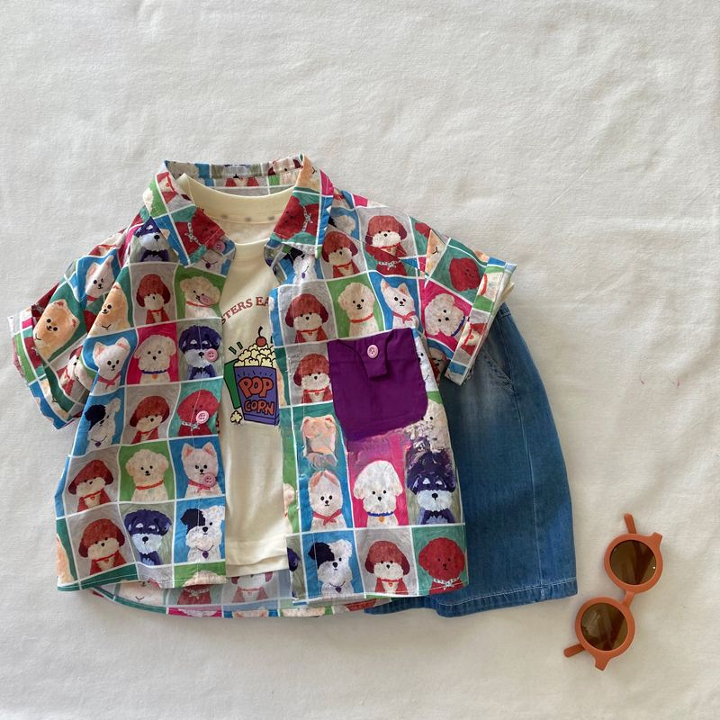 소년의 세련된 개 프린트 반팔 셔츠 어린이 2025 여름 새 스타일 아기 소녀 한국 스타일 옷깃 셔츠스토어 가기