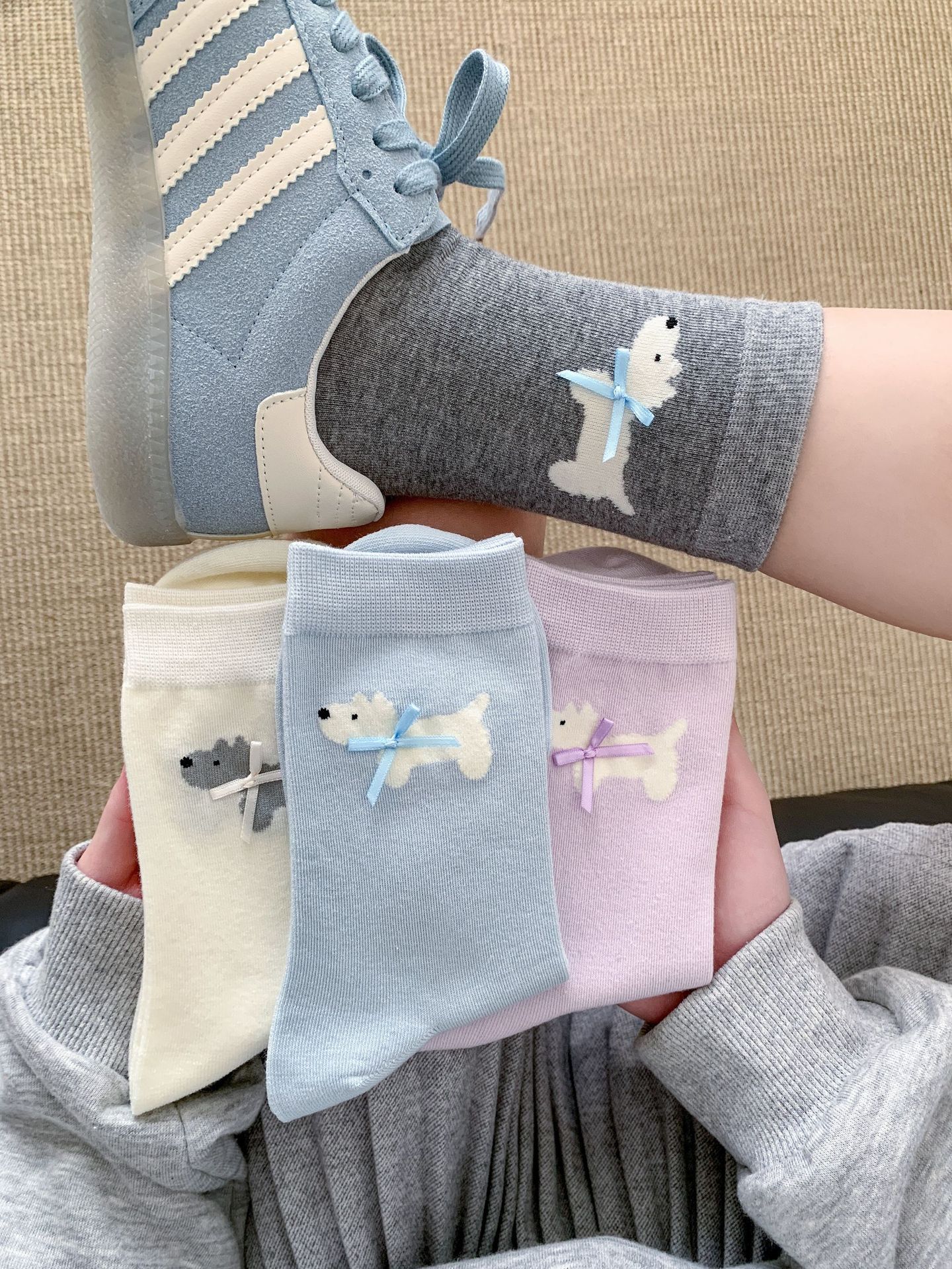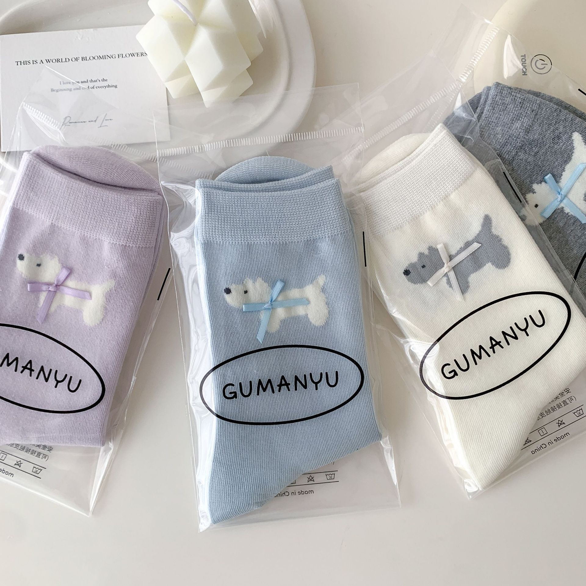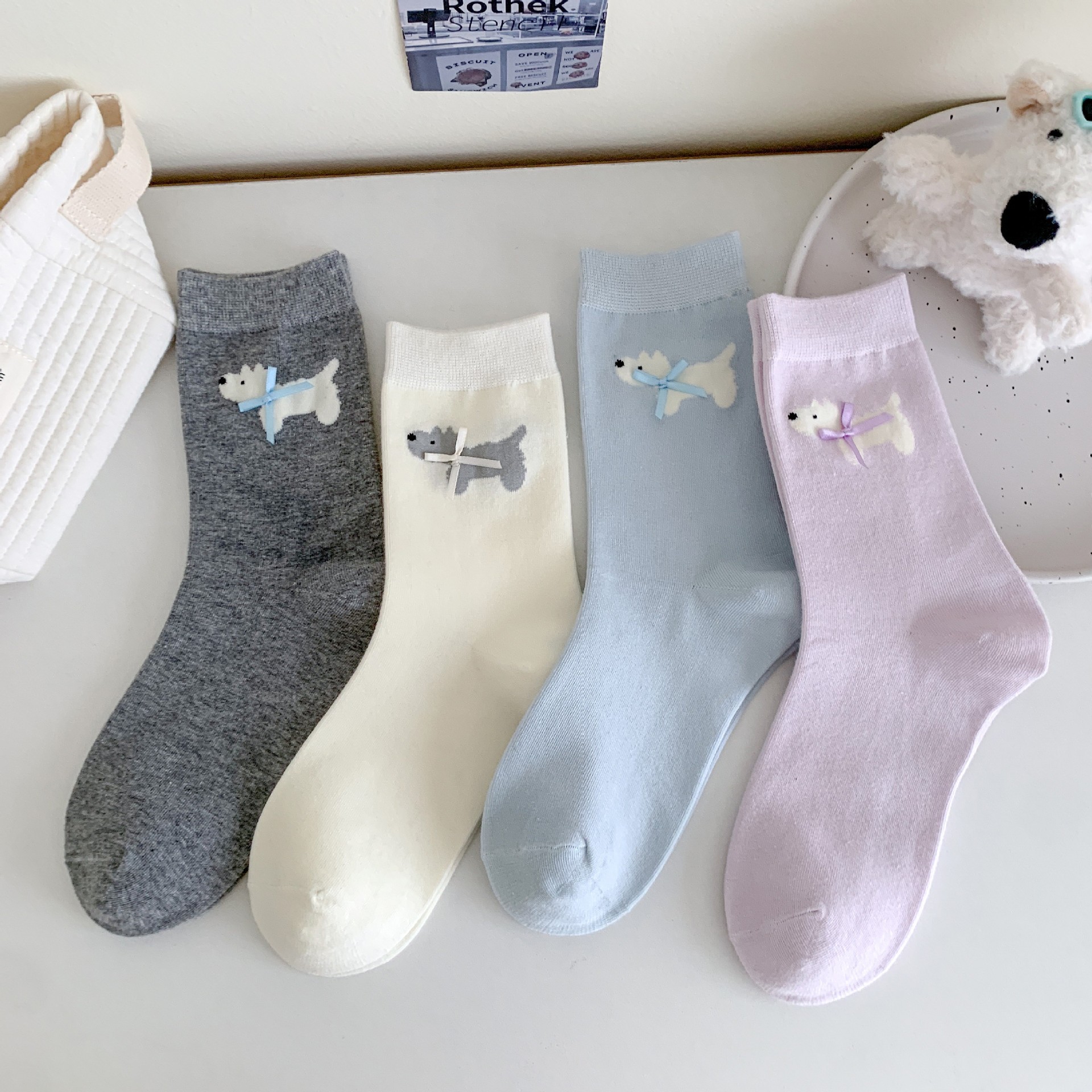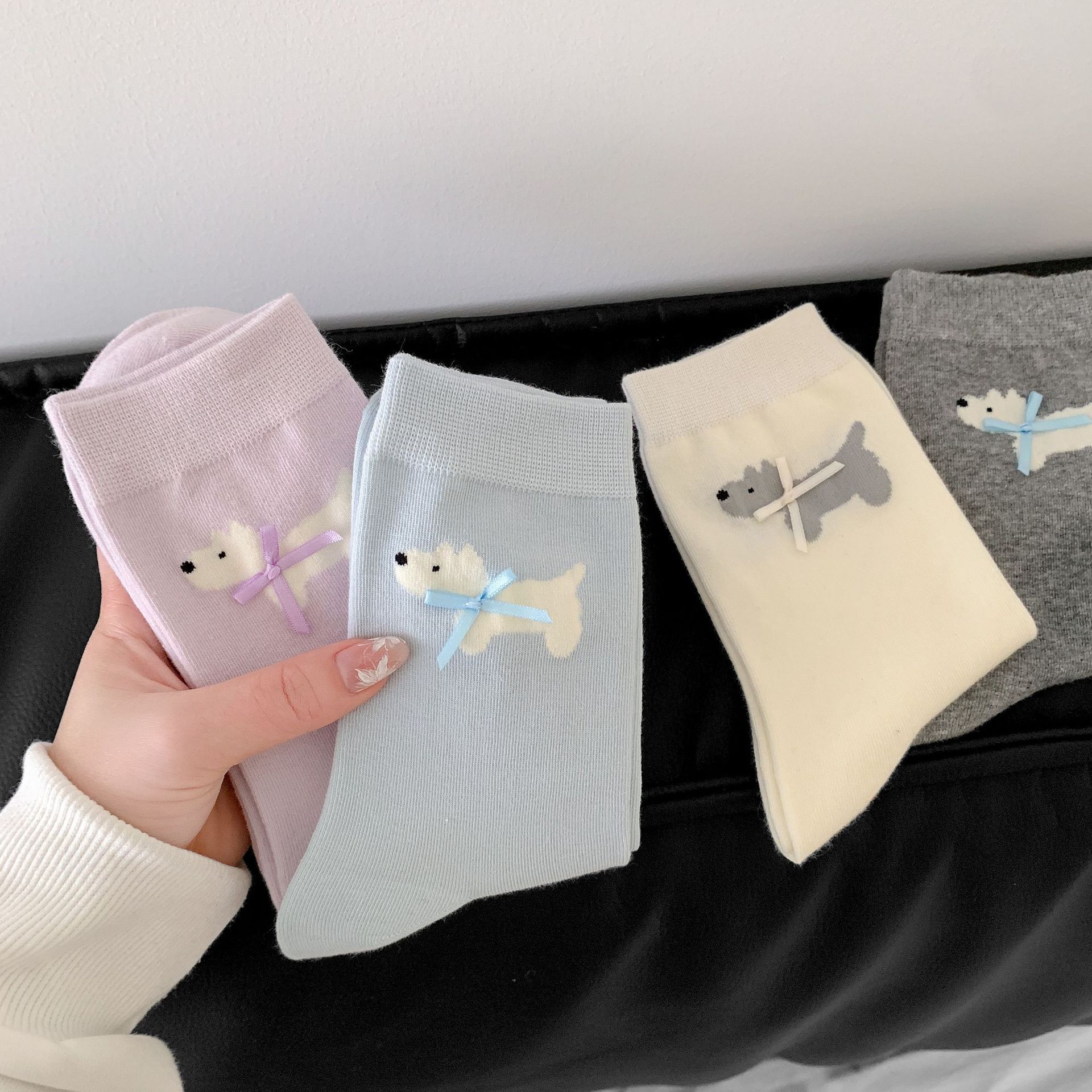 여성용 양말 봄 여름 한국어 버전 만화 강아지 리본 양말 귀여운 뼈없는 양말 Zhuji 양말